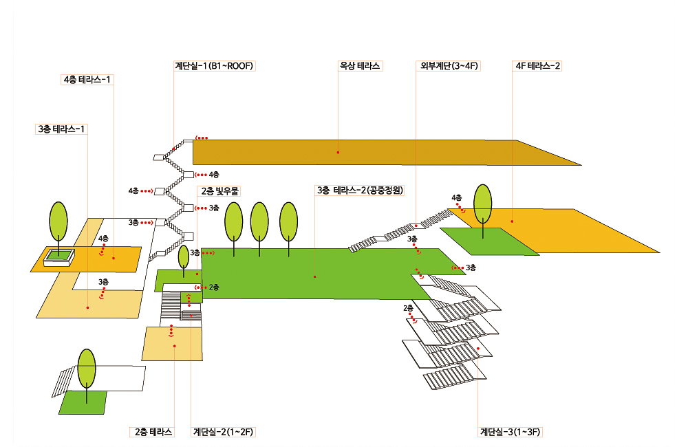 제품의 생산뿐만 아니라 연구도 병행하고 있는 건물의 특성상 휴식과 더불어 보안까지 함께 고려해야 했는데, 이는 내부에서도 충분한 자연을 느낄 수 있는 공중 정원으로 해소된다. 3층에 계획한 공중정원은 4층 데크에서는 외부계단으로, 2층 사무동에서는 공중계단으로 연결해, 굳이 각층을 연결하는 메인계단을 통하지 않고도 쉽게 접근할 수 있도록 하였다. 그 외에 연구영역과 생산영역 사이의 채광과 환기를 확보하는 중정과 각 층의 테라스는 짧은 이동으로 외부와 접할 수 있는 공간이 된다.