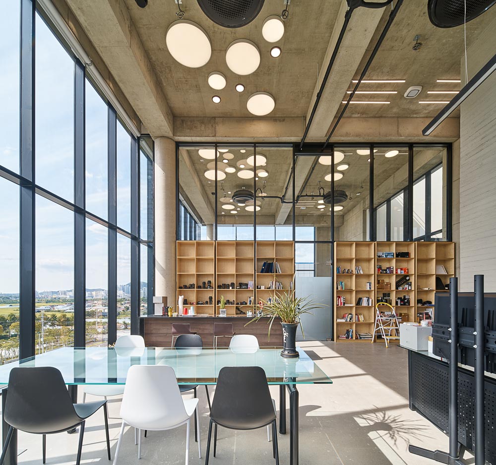 The conference room on the fourth floor, installed as a cantilever, is a device to maintain the significance and tension of a meeting. Although its location is not comfortably accessible and situated at the end of the internal circulation, the open-type conference room that can be seen from any place shows that the research institute values communication with employees.