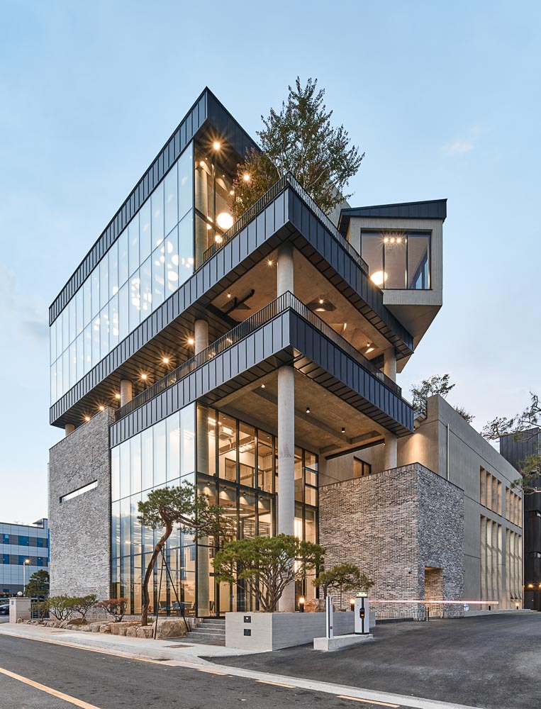시흥시 매화일반산업단지는 산을 깎아 조성된 산업단지로서 단지 내 필지에 레벨 차이가 있는 땅이다. 사옥은 공장의 전면 넓은 공간 확보를 위해 동쪽으로 치우쳐 배치했을 시 동, 북, 남쪽 세 방향으로 대지 경계선까지 근접하여 지어진 공장건물들로 인해 답답해질 수밖에 없는 상황이다. 이에 남측으로 공간을 확보하고 동서 측으로 길게 놓여져 남쪽으로의 채광을 확보함과 동시에 연구영역과 생산영역의 공간으로 분리된다. 동서 측으로 다소 길어진 매스로 인해 발생하는 채광의 어려움을 극복하기 위한 중정은 서쪽 사무영역과 동쪽 생산영역을 공간적으로 구분하는 역할도 한다. 또한, 두 영역은 스킵방식으로 구성하였다. 이는 반개 층의 이동으로 사무영역과 생산영역의 원활한 소통을 가능하게 한다.