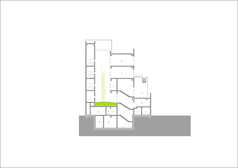 캔틸레버로 설치된 4층 회의실은 회의의 중요성과 긴장감을 유지하기 위한 장치이다. 접근의 편안한 위치가 아니라 내부동선의 끝자락에 있지만 어느 장소에서나 볼 수 있는 오픈된 형태의 회의실은 직원들과의 소통을 중시하는 건축주의 의견이 반영되어 있다.