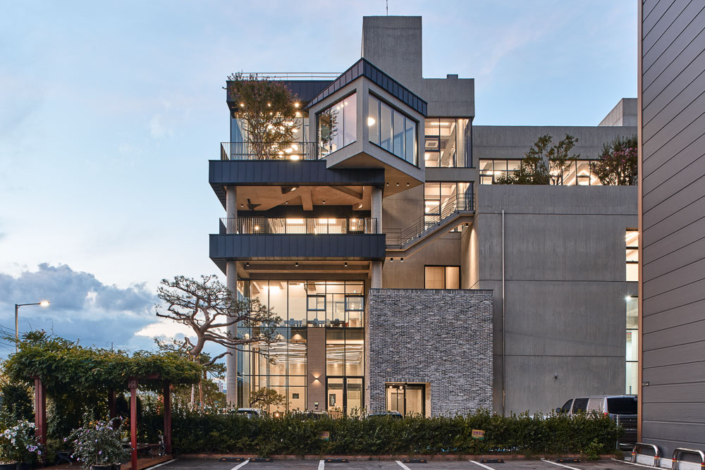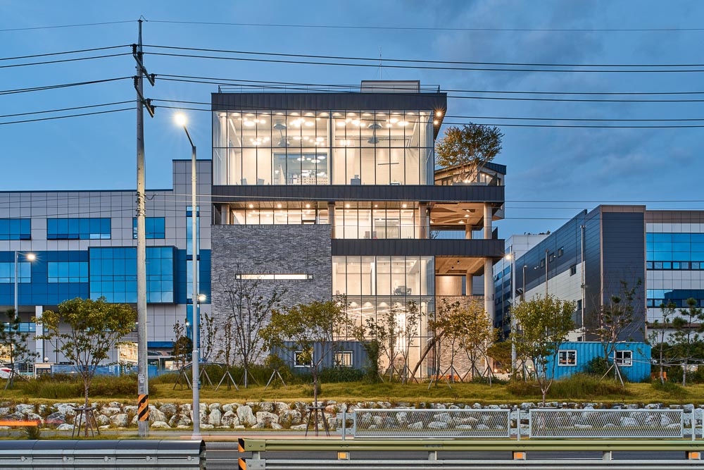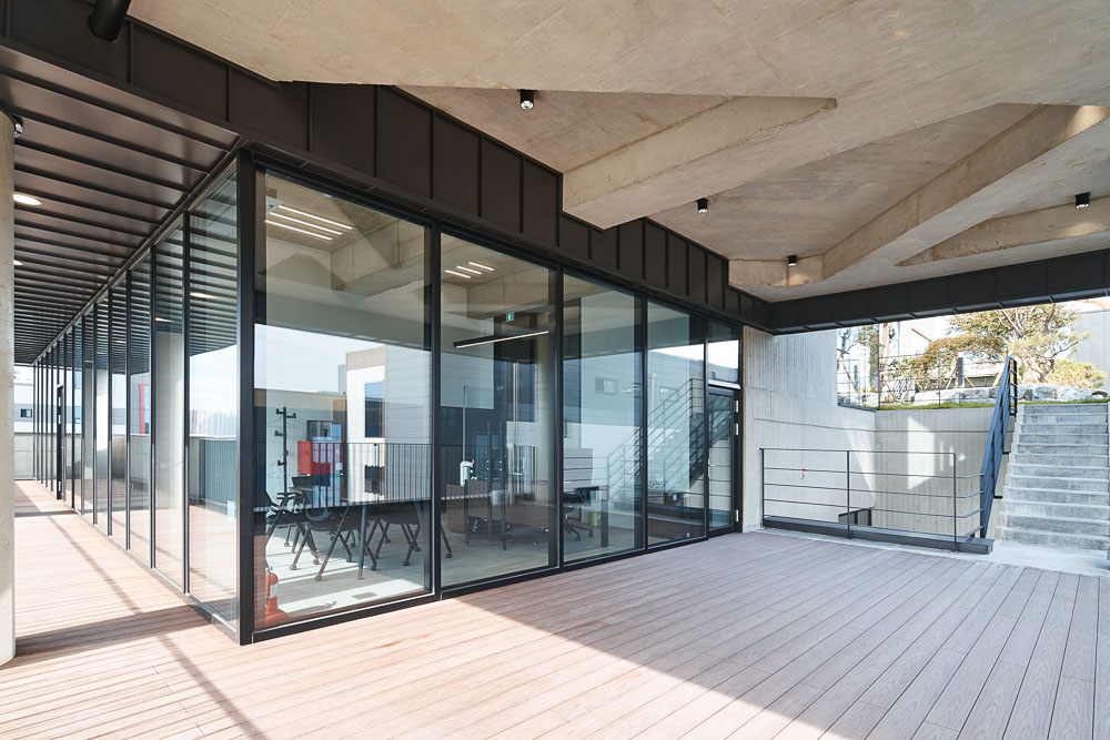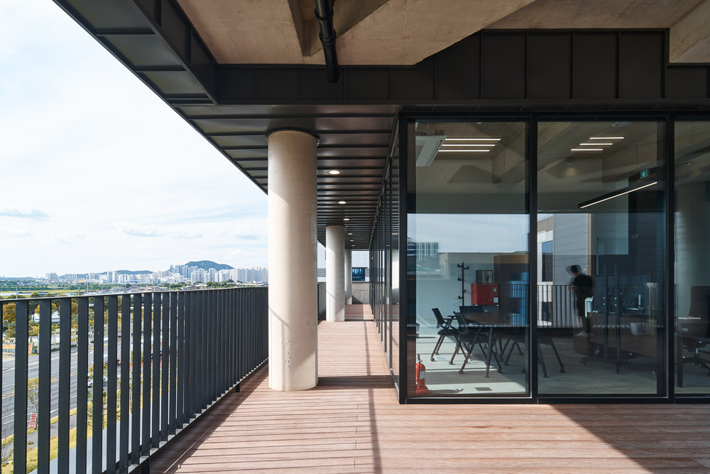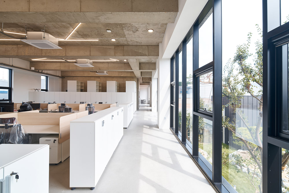 The Maehwa Industrial Complex in Siheung-si is an industrial complex, and the site is a land within the complex that has level differences. If the research institute was arranged towards the east to secure the wide space in front of the factory, it would inevitably seem stifling because of the office building built close to the site boundary in three directions: east, north, and south. As a result, the CNDI. Company Building was stretched from east to west and space was procured to the south, allowing light to the south to be secured, and the space was separated into the research area and production area. The courtyard, which was made to overcome the lighting difficulties caused by the mass that was rather elongated from east to west, also serves to spatially divide the office area in the west and the production area in the east. Moreover, the two areas were configured in a skip-floor method. This means smooth communication between the office area and the production area only by moving half a floor. Due to the nature of the building, where not only research is carried out but also products are produced, it was necessary to consider both security as well as rest, and this is resolved with a small, simple garden where sufficient nature can be felt from the interior. The public garden planned on the third floor is connected by an external staircase from the deck on the fourth floor, and an aerial staircase from the office building on the second floor, allowing it to be easily accessed without having to go through the main stairs connecting each floor. In addition, the courtyard, which secures light and ventilation between the research area and production area, and the terraces on each floor become a space where one can access the outside air from anywhere.