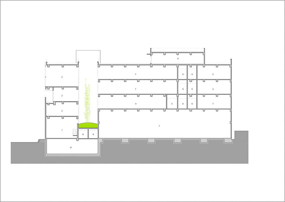 캔틸레버로 설치된 4층 회의실은 회의의 중요성과 긴장감을 유지하기 위한 장치이다. 접근의 편안한 위치가 아니라 내부동선의 끝자락에 있지만 어느 장소에서나 볼 수 있는 오픈된 형태의 회의실은 직원들과의 소통을 중시하는 건축주의 의견이 반영되어 있다.