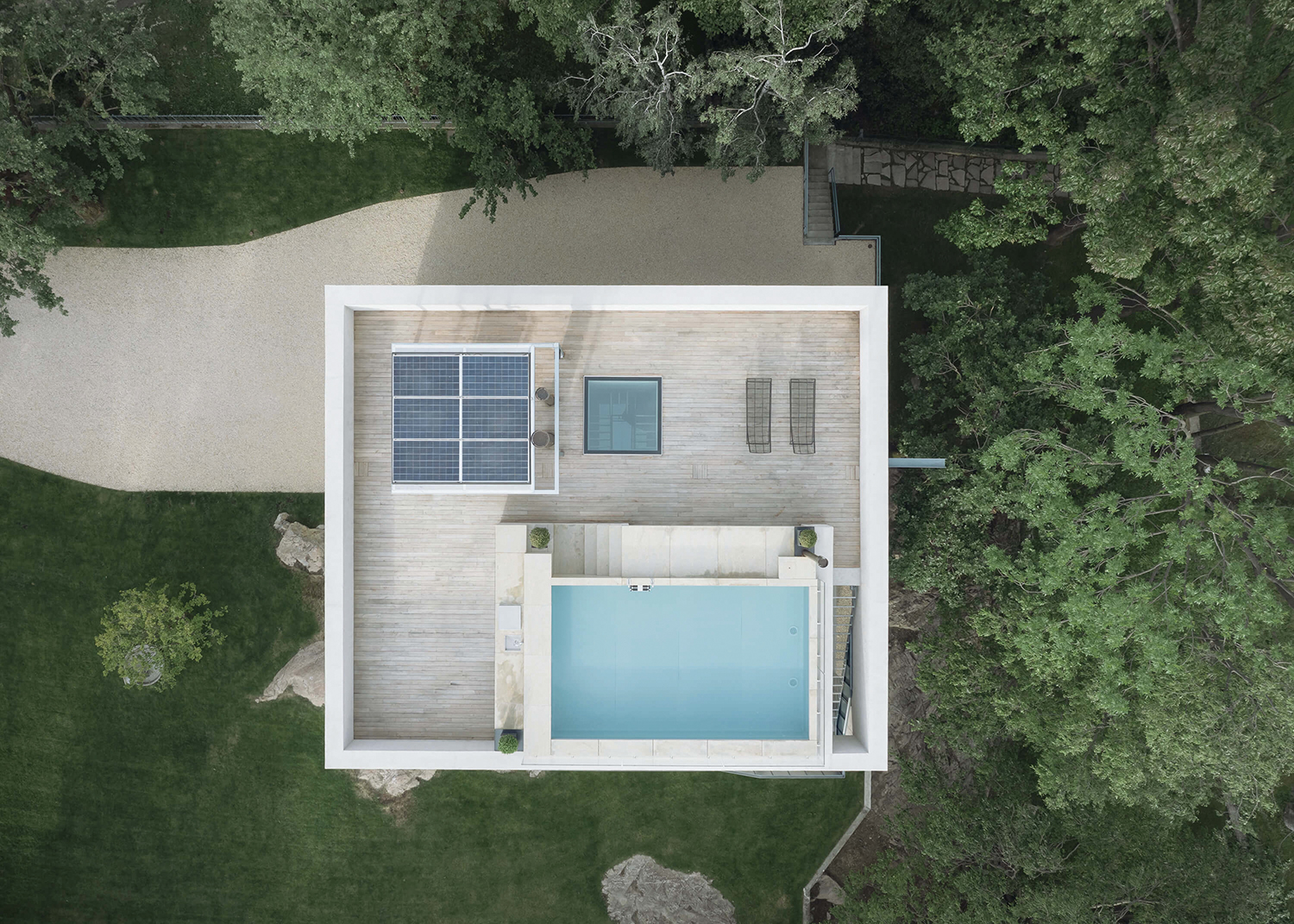 The 1st floor is occupied by a garage and a rock cellar. All the apartments can be connected through the elevator and the interior stairwell, whereas the external metal stairs make the apartments and the rooftop independently accessible. On the 2nd floor, two small-sized apartments share a living space, which is possible to reconfigure if need be thanks to a 180-degree rotating wooden panel. The main apartment is located on the top floor and the rooftop is surrounded by forest trees on the northern side; the walls of the master bedroom are made of raw, reinforced concrete, acting as the main support of not only the existing structure, but also the swimming pool on the rooftop. The walls of the fluid interior spaces are roughly plastered in continuity with the exterior and the floors are in polished concrete unctuated with sections of grinded concrete and parquet. The severe atmosphere created by straight lines is softened by custom-made furnishing, wooden doors and windows, as well as large views of the green forest and light cuts intercepting the different levels of the building.