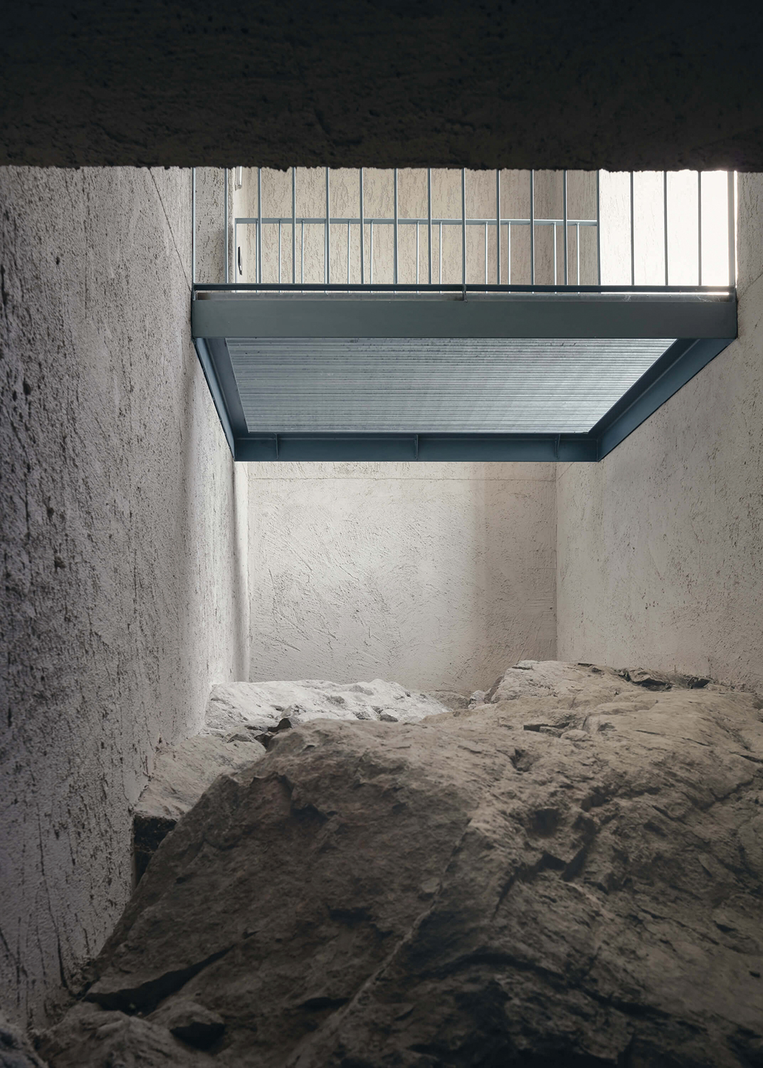 The energy efficiency upgrades include an external insulation system covered by lightweight cement boards, which were then roughly plastered with natural lime mortar. The fortress-like appearance of the building, due to its massive presence, is in contrast with its large transparent holes. Its severe relationship to the ground is emphasized by a large rock, on which the building is sited, and a play of voids and double heights on the southern side renders the rock visible from all floors. In order to fulfill the equirements of flexibility imposed by today’s dynamic society, the building can be divided into three units: three apartments, three entrances, three finishes on the facade.