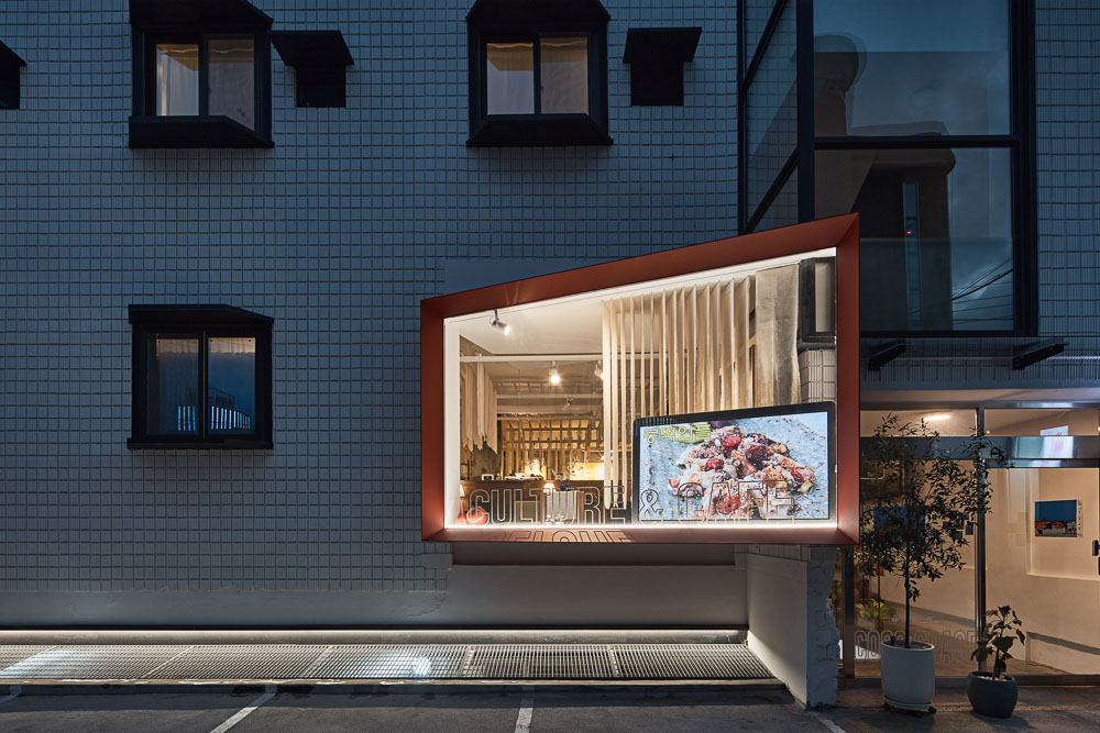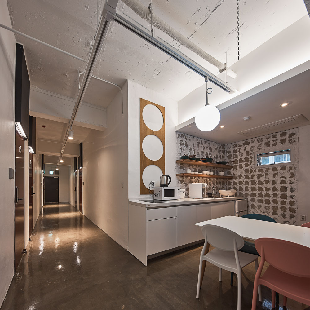The 28 rooms were reduced to 18 rooms on 3 floors with 6 rooms on each floor as a unit cluster. The basement was opened to maximize natural light and natural ventilation, making it a pleasant co-working rental space, and the first floor was all emptied and organized as an open space with only traces left. To solve the parking problem on the back road, the entrance stairs were demolished, and the entrance was then moved to the stair landing to secure as much parking space as possible in the front, and a culture BOX was installed to draw attention into the alley. Unnecessary finishes were removed while the traces of 40 years were saved as much as possible, and the external facade extends the continuity of the landscape. Befitting the industrial city of Ulsan, the young solo diners who stay for short to medium term become new family members in the shared kitchen, and CO.CO. SPACE is gradually establishing itself as ‘Ulsan-type co-living’. CO.CO. SPACE, the first project of the spatial regeneration platform Re_ink, is a sustainable and effective practice model that attempted to revitalize the vicinity of the Industrial Tower, Ulsan’s first avenue of entertainment, which dominated the 1990s.
