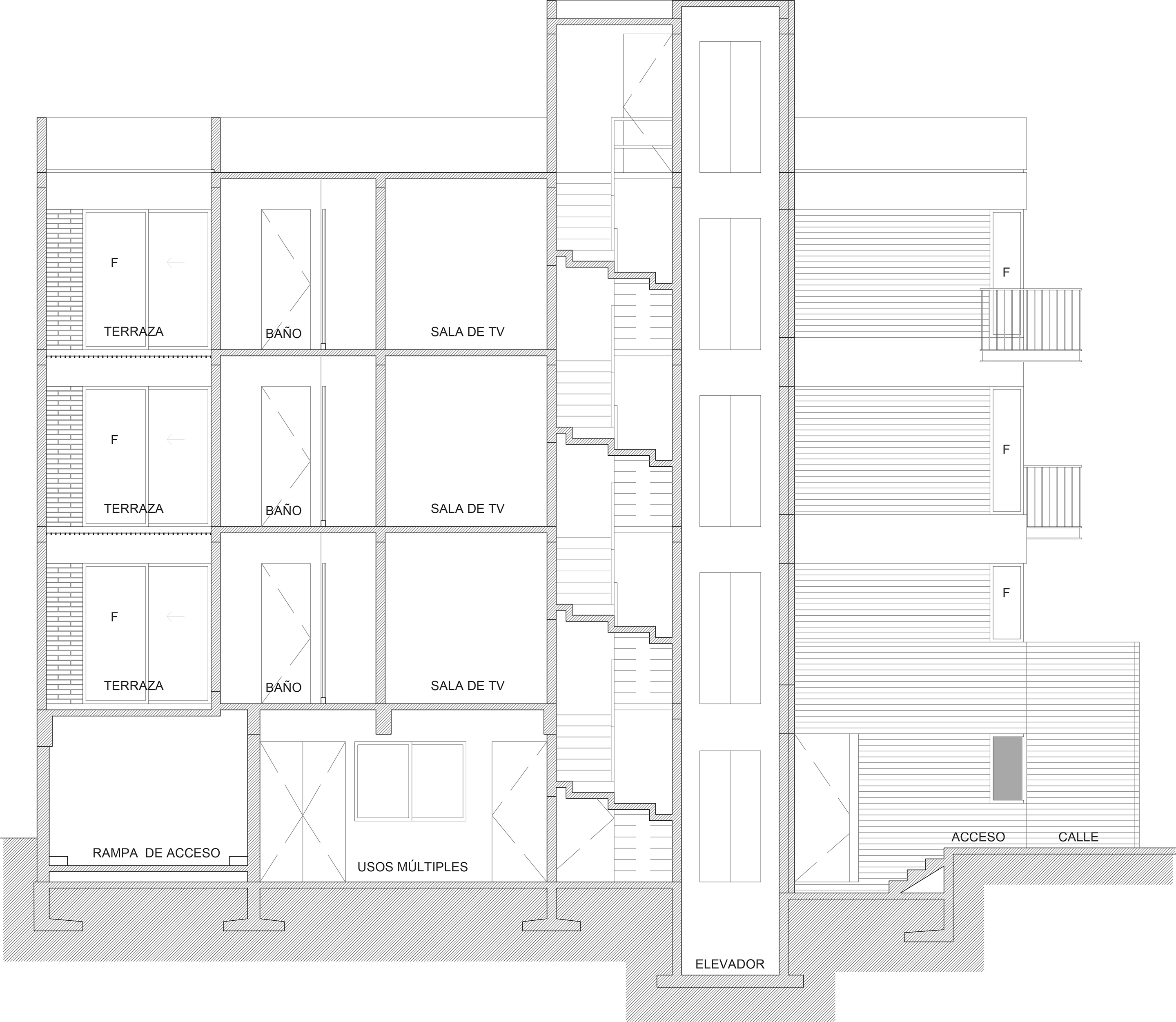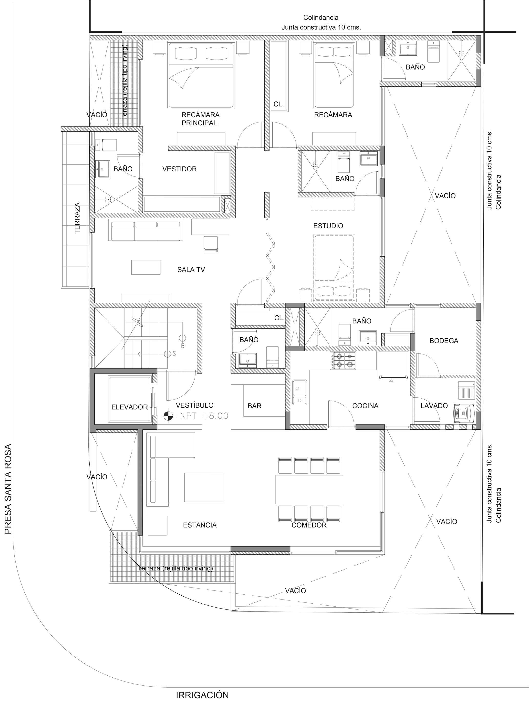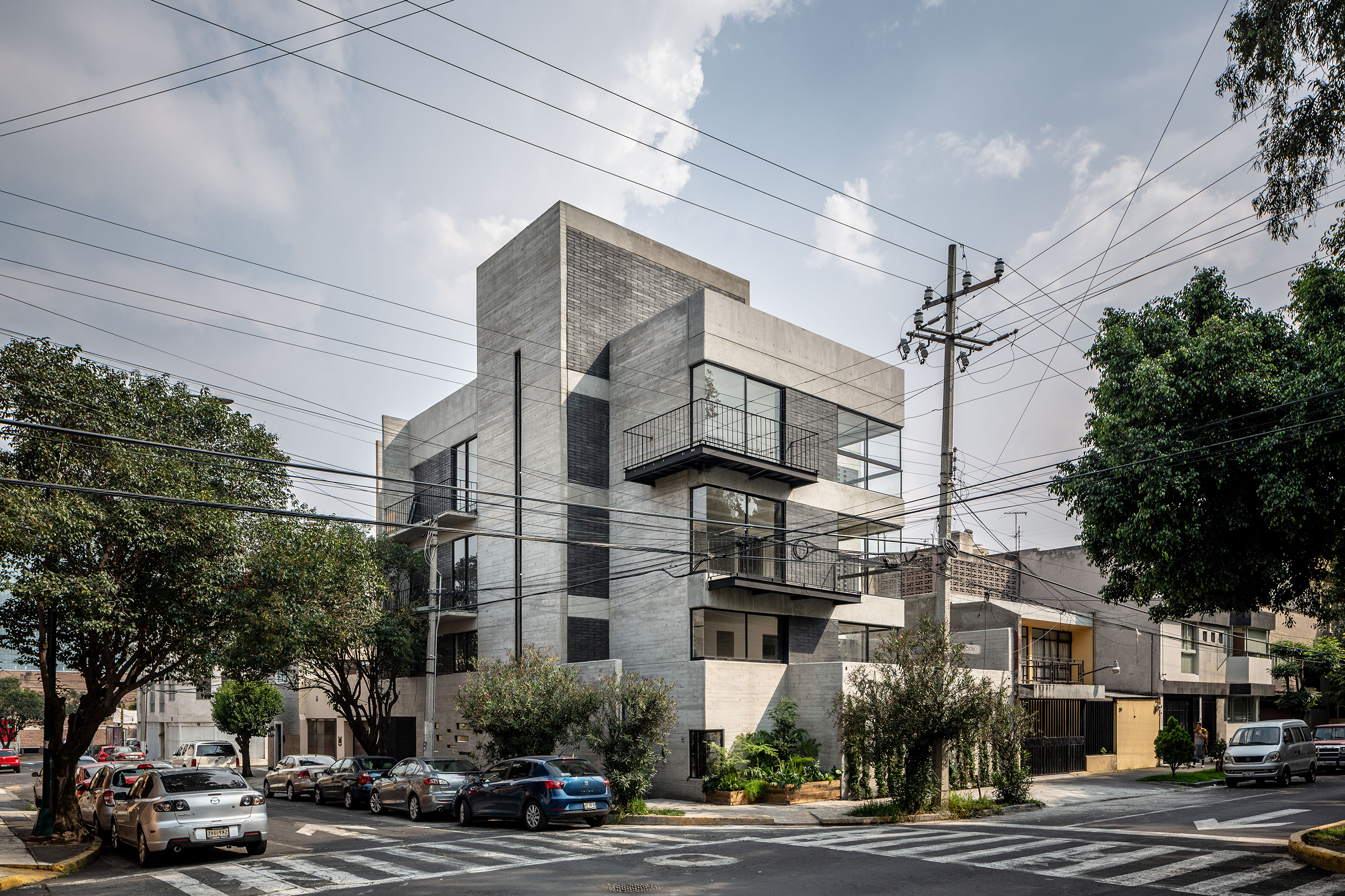 Irrigacion 93(I93) sits on the corner of Irrigacion Avenue and Presa Santa Rosa, in one of the fastest growing neighborhoods in Mexico City. At 216m2, the property is inspired by modern architecture, and designed with a unique approach to production that makes great use of raw materials. With three residential apartments inside, the space is designed to take full advantage of each angle, meeting all the tenants’ needs. I93 consists of straight, clean lines, that provide the space with an intention and strong presence. You’ll notice a use of concrete that stands out from the basement all throughout the framing, in all three levels of the building, providing subtle accent and structure. One noteworthy aspect of this project is the simplicity on material used; concrete, black block and iron, which stand out along the two main facades. Another defining characteristic is the use of the core vertical circulations, present in the building‘s volume. Vertical circulations divide the 3 levels while introducing a different perspective to the configuration depending on where you stand. Lastly, the ventilation of the space is designed to keep the original vertical windows, keeping the air feeling very natural. Moving to the interiors of each apartment, practically all the bathrooms, bedrooms and living rooms have natural light and ventilation, demanding the level of comfort that our client wanted to achieve. Each 150m2 apartment consists of 3 bedrooms (each with its own full bathroom), a study or office, a half bathroom, a living room or dining room, a kitchen, a service area and room, as well as balconies and an additional open space. Standing slightly apart from the others, Apartment 1 has two additional patios, which contribute a feeling of spaciousness to its interior. Apartments 2 and 3 have a private open space at the roof top, giving each a unique added value. As in many of our projects, finishing touches include landscaping where possible, private rooftops, and of course the use of natural materials as much as possible. To top it all off, I93 has a parking structure half a level below the sidewalk where tenants can find 24-hour surveillance, parking, pedestrian sidewalk access, and a multipurpose space for homeowners to take advantage of.