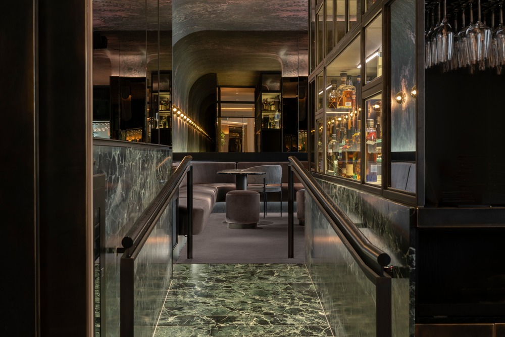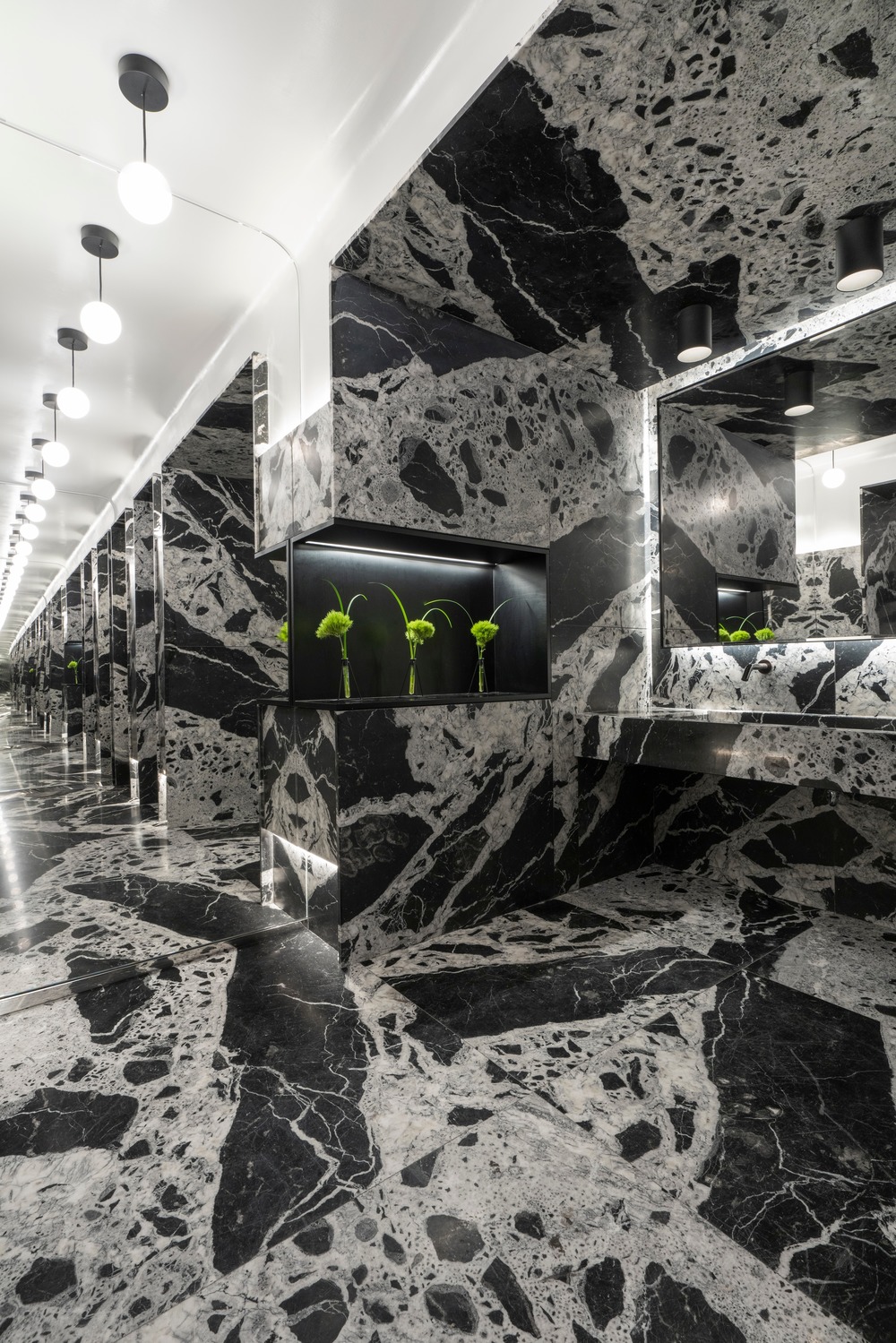 Materials marble, terrazzo, brass, prismatic glass, white oak, velvet