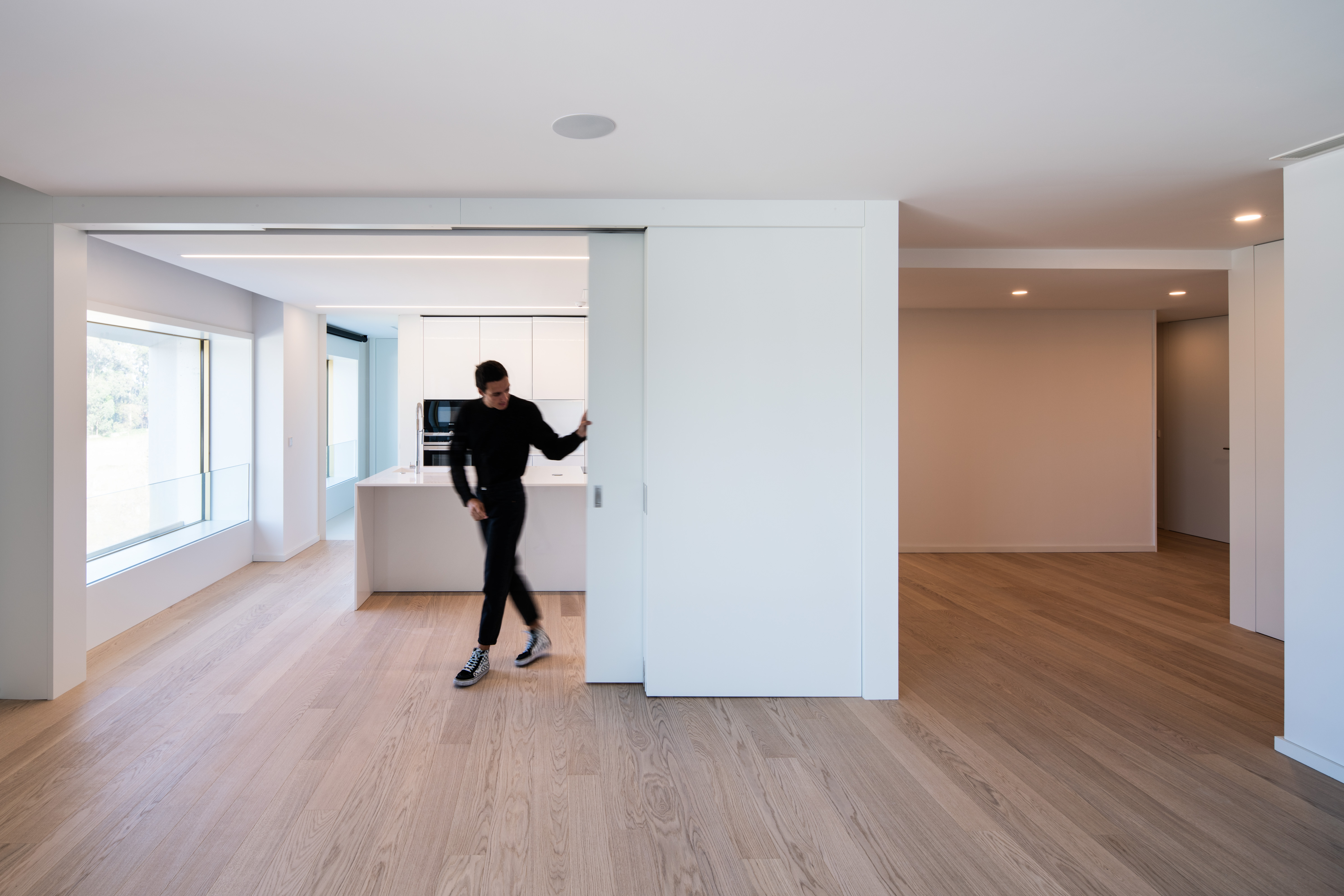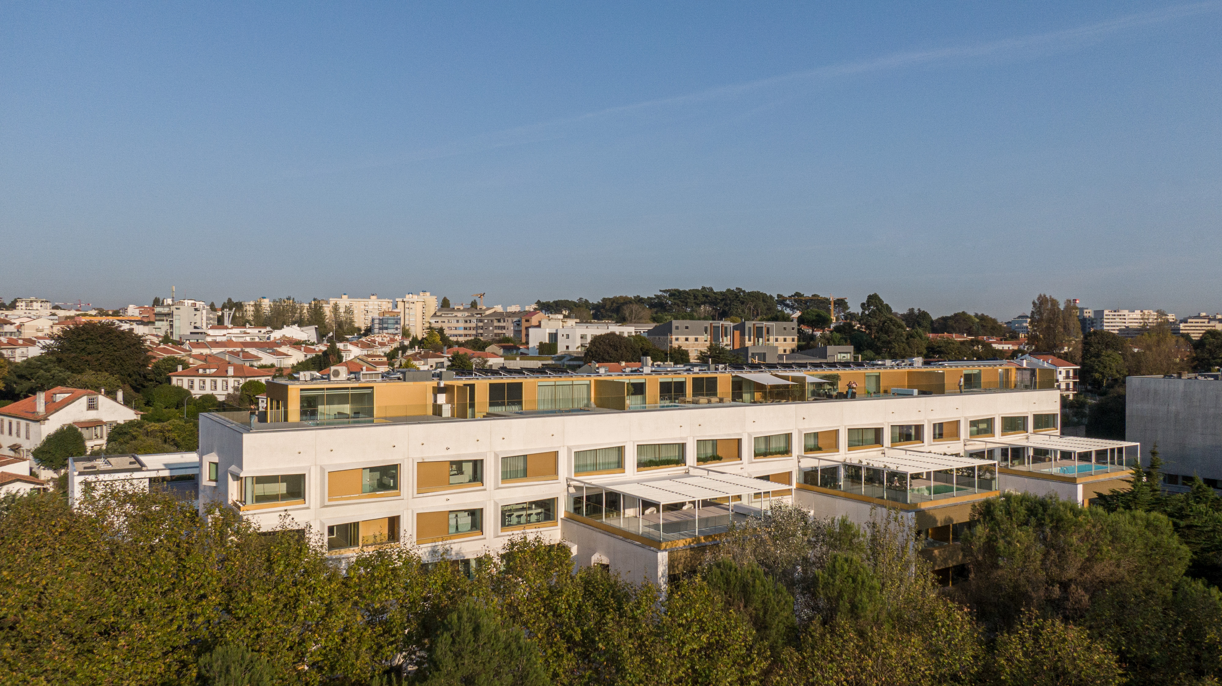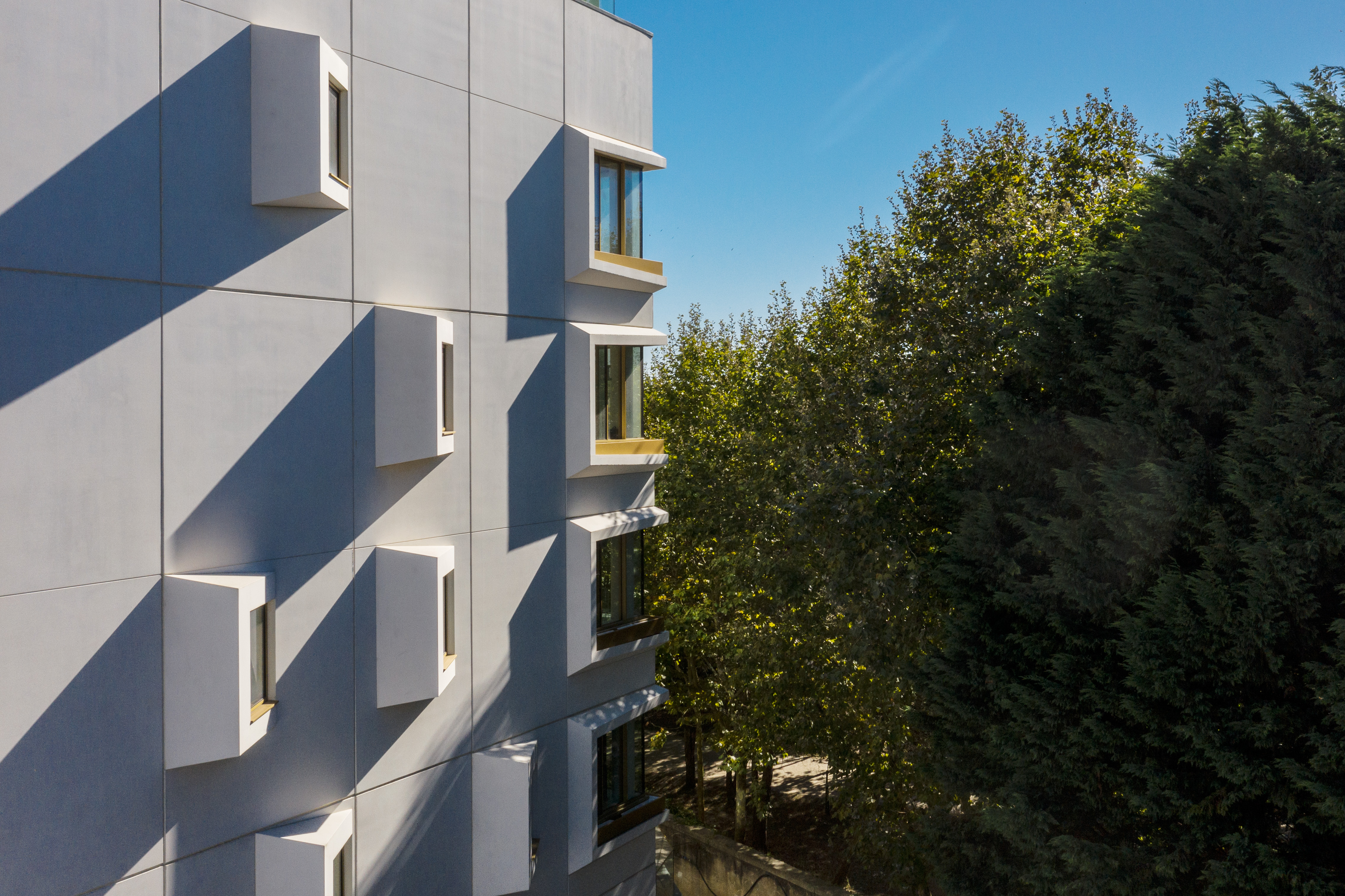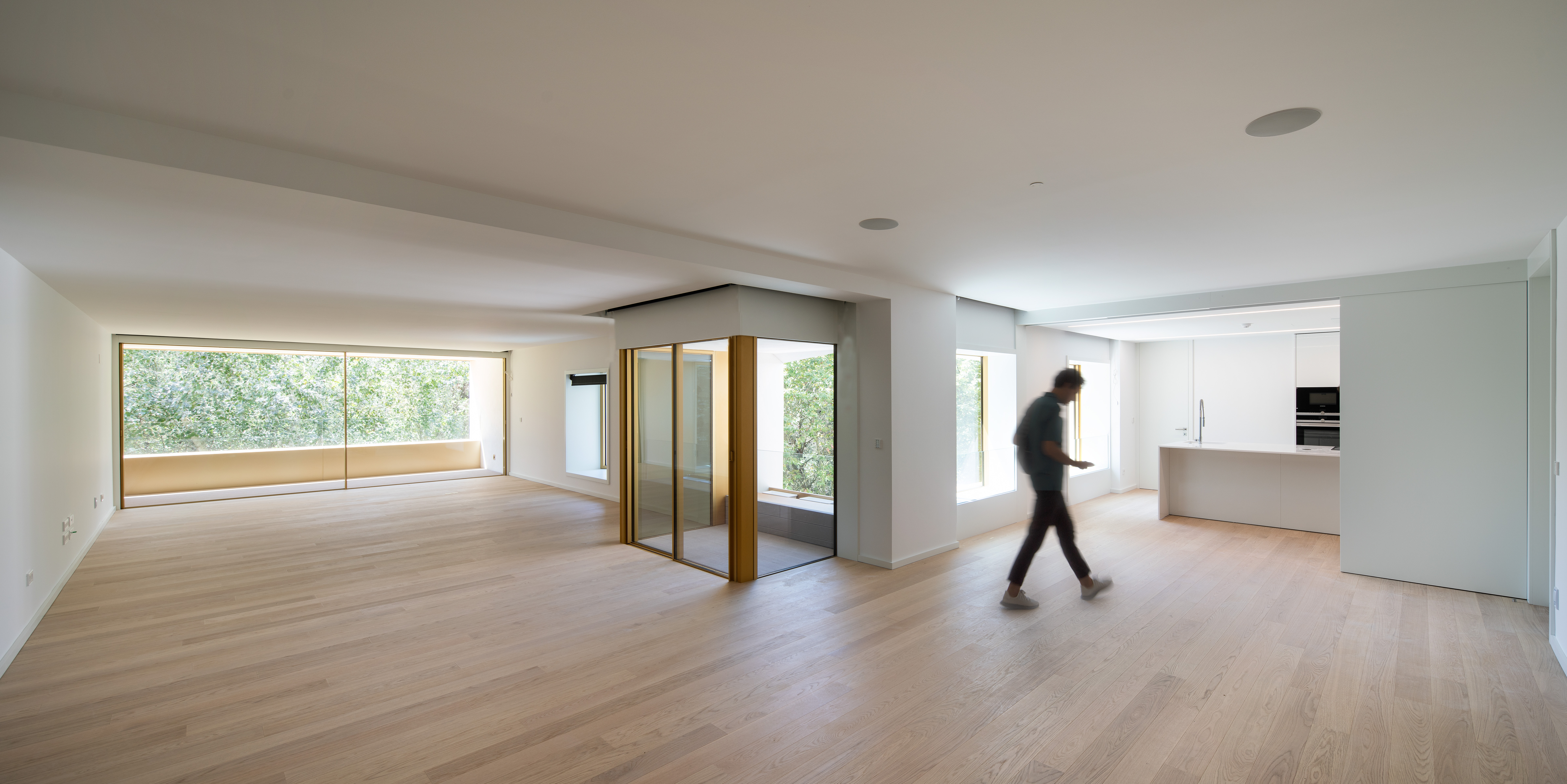 Essenza is a luxury multifamily residential building located at the doorstep of Porto's City Park, in Portugal. Following all the guidelines and metrics defined by the Park's Urbanization Plan for the nascent urban front, the volume lives in total coherence with the surroundings, while standing out for its unusual properties. The building's most striking feature is the facade's three-dimensionality, created through geometric rips that cut the concrete, like if there is a body's reaction in each tear - a kind of blister. This geometric effect creates the illusion of undulation and is adapted to the facade facing the park, where the openings are much larger, and the protrusion effect is smaller. This design makes better use of the park's views while maintaining the building's conceptual consistency. The gated community has a reception, which provides security to its residents and contributes to the building's unitary image. The facade's skin effect extends to the base of the volume, covered from one end to the other by a golden grid with a design inspired by the tapered geometry oculi. This solution allows solving the proximity to the street, integrating housing programs, a lobby, and garages entrances on a sole basis, without interfering with the object's reading. Semi-translucent and delicate, this surface acts as a membrane that prevents the passage but allows light to enter. Essenza was designed to be experienced, combining technology with a selection of luxury finishes to provide maximum comfort and functionality to its residents. We highlight the home automation system, the radiant floor heating used in the circulation spaces, bedrooms, living rooms, and the Carrara marble used throughout the bathrooms. In permanent dialogue with the Park, Essenza promotes the extension of its physical spaces, in a symbiosis between interior and exterior, as if it were a marriage between architecture and nature.