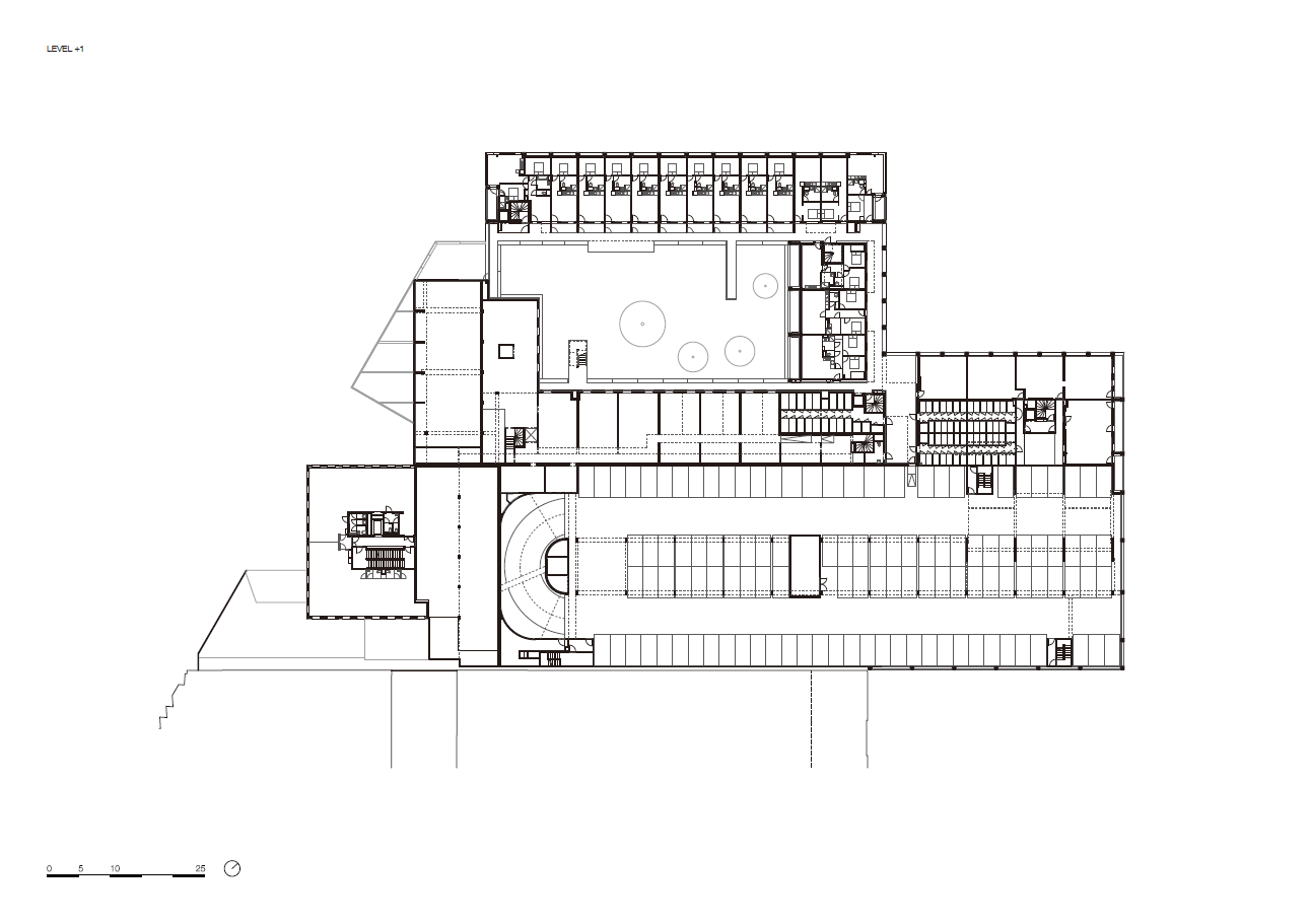 The project’s compactness allowed the optimization of economic standards and environmental recommendations throughout the whole building process. The facades provide abundant daylight to the interiors and naturally link them to the city, both during the day and at night. Towards the courtyards and walkways, the vertical surfaces are cladded in grey stained timber giving them a characteristic domestic feel and reinforcing the duality between exterior and interior while elevating the inner public space as the beating heart of the project.