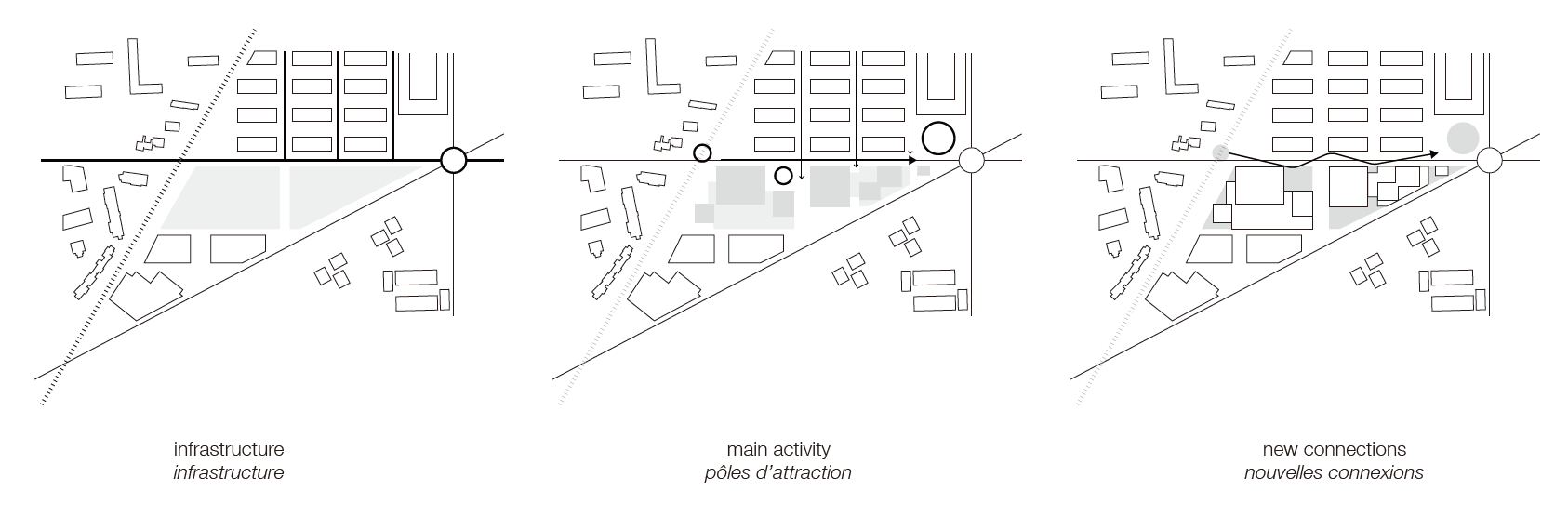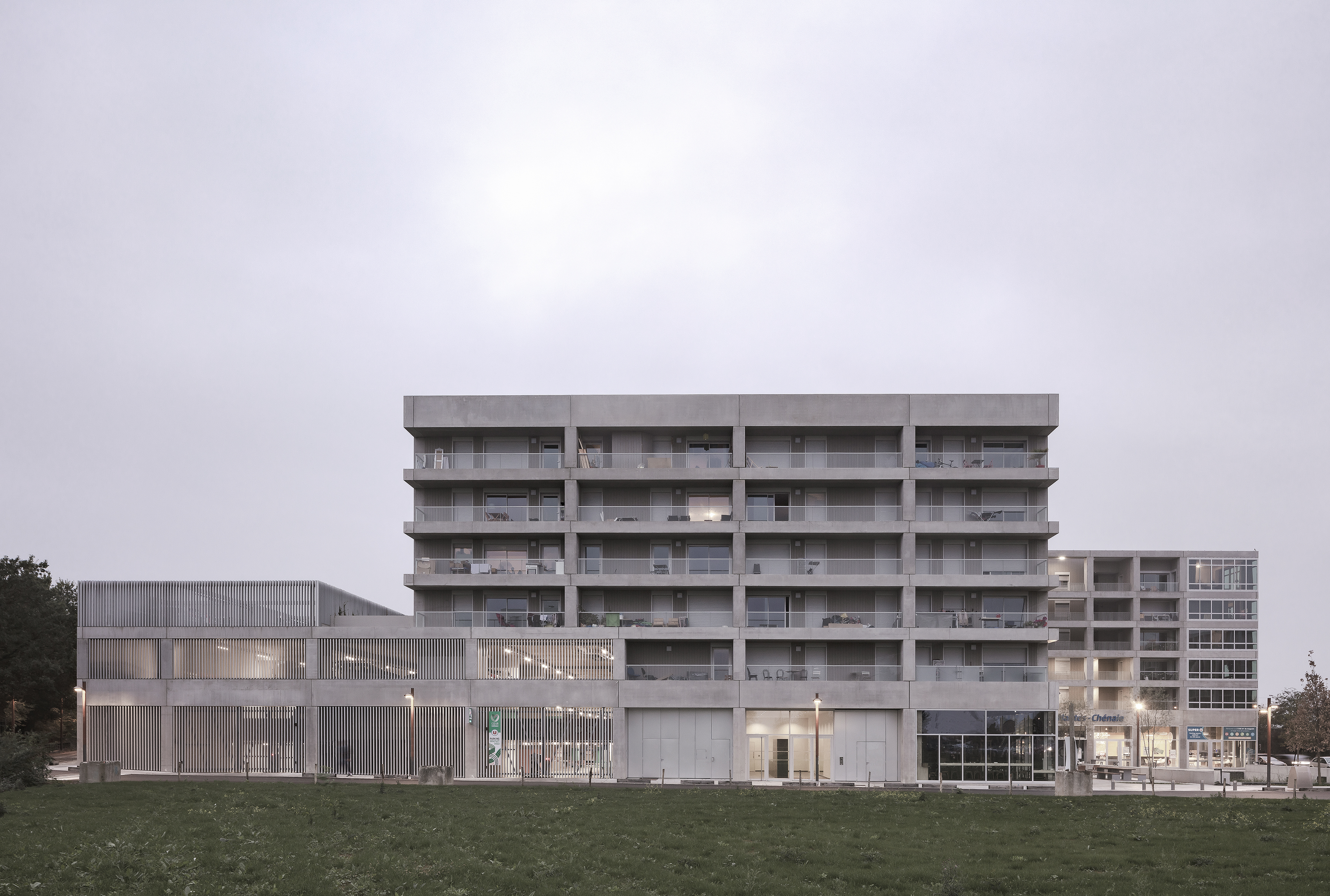 Extremely compact, the Bottière Chénaie features a multifunctional plinth, composed of commercial spaces, a supermarket and a car park. Above this base rise two 5-storey residential blocks comprising 172 apartments in total. The first volume is dedicated to market-rate housing, while the second hosts a social housing complex.