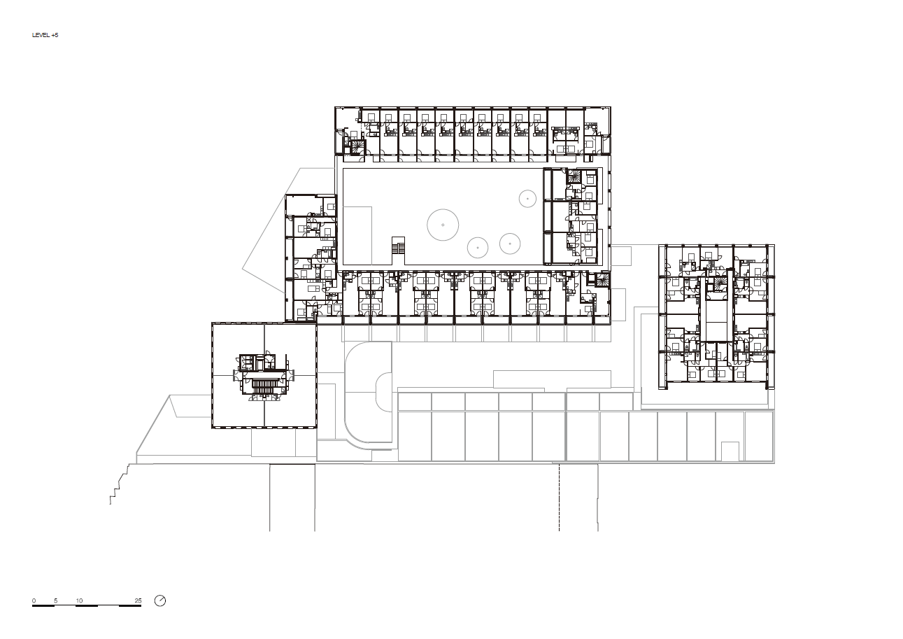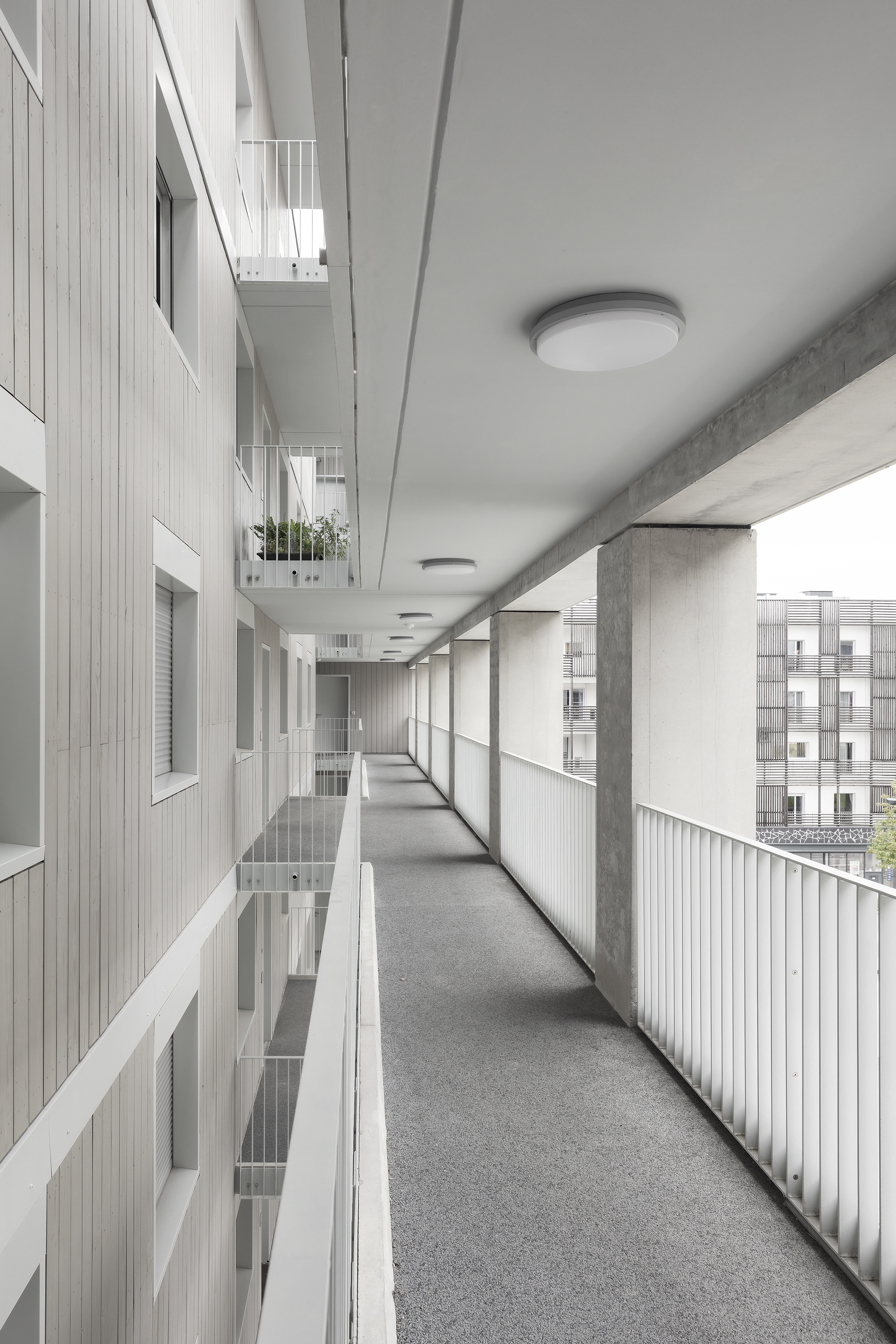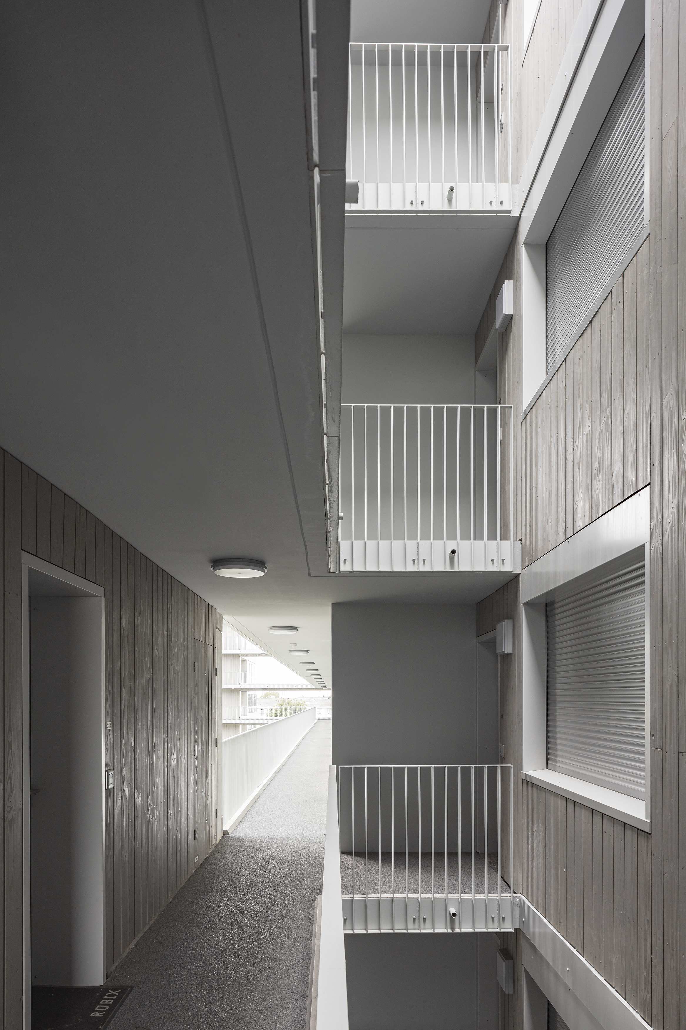 To the North-West, the larger housing volume unfolds around a spacious courtyard planted with trees, where external walkways overlooking the green surroundings provide access to the dual aspect apartments. Inspired by the Dutch residential architecture tradition, this circulation solution is adapted to its context and minimizes vertical connections, allowing diverse configurations to the housing units - from private outdoor spaces to loggias with living areas. Moreover, these orientational anomalies are flanked by light-wells spreading natural daylight to the lower floors: a vertical rupture that generates informal spaces to foster residents’ socialization.