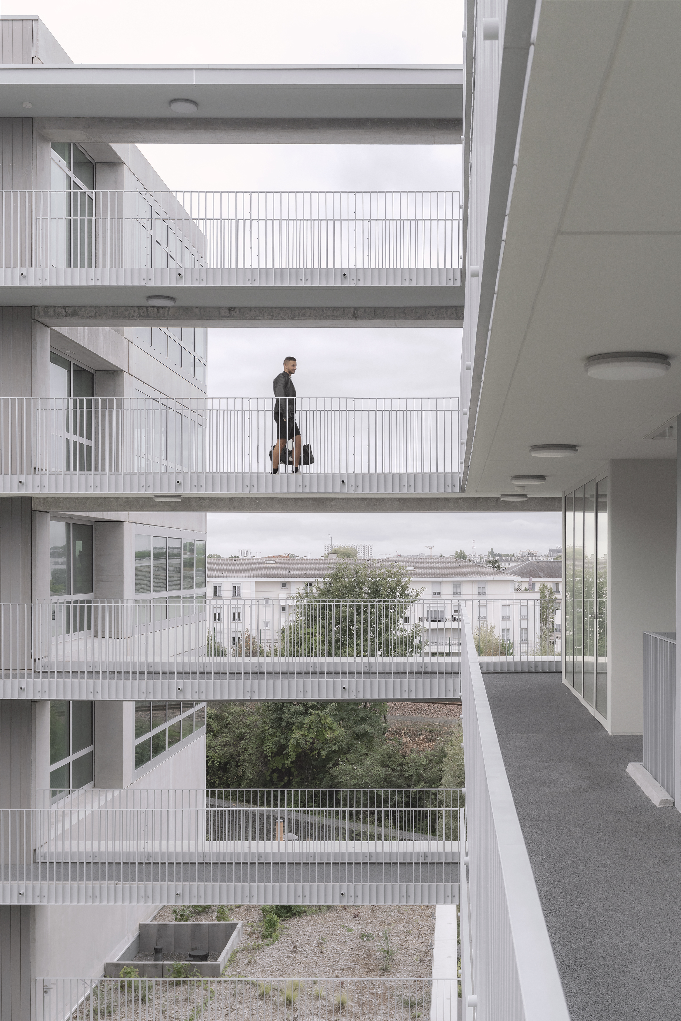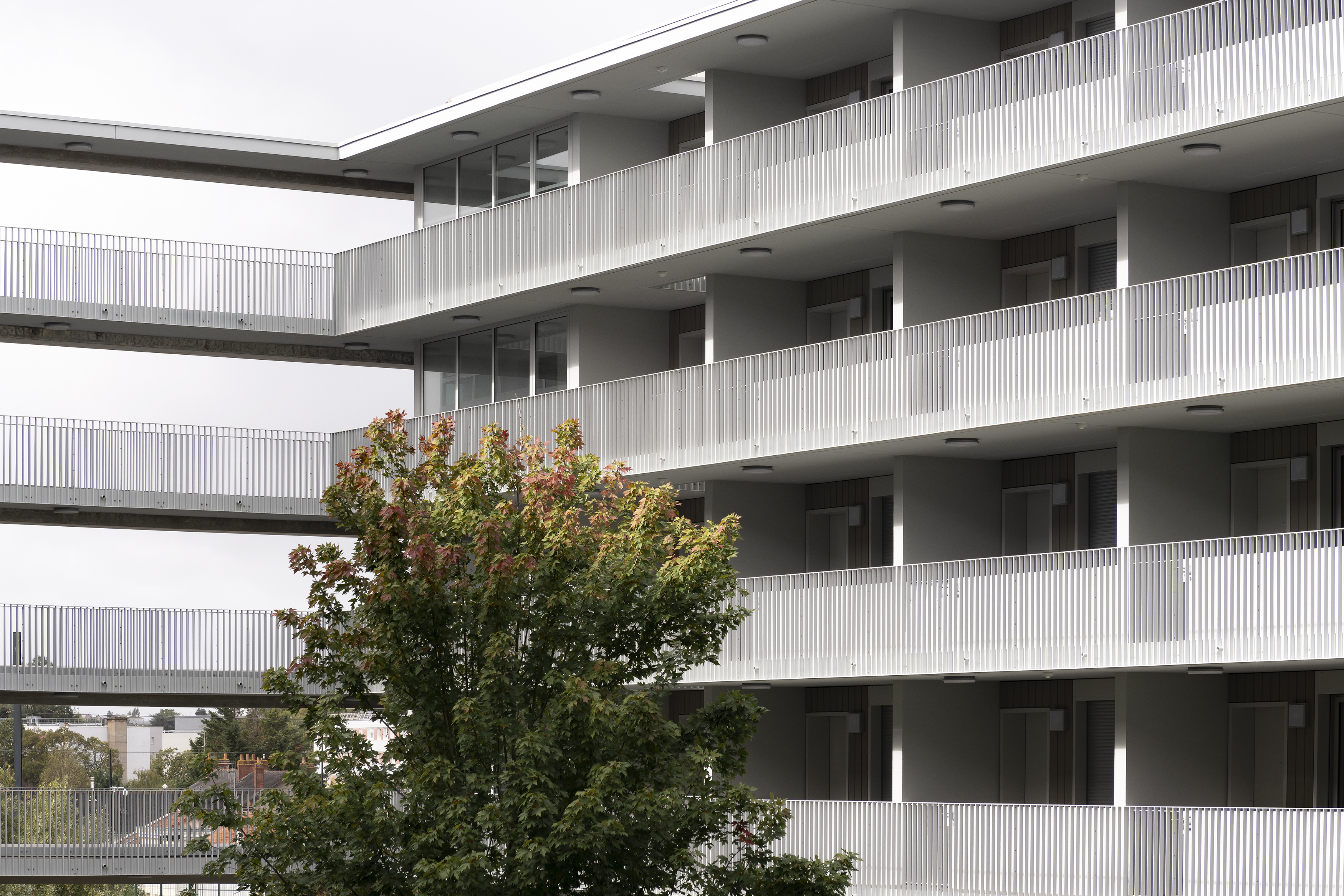 To the east, the second volume accommodates 39 social housing apartments, which, according to their position, benefit from a double orientation, different typology of loggias and look out over the trees or towards the city. Lastly, to the south-west, the office block, organized around a central core, reinforces the volume juxtaposition and completes the new urban landscape. Monumental in its consistency, the simple massing of Bottière Chénaie is accompanied by a cohesive repertoire of surfaces. Monolithic at first glance, the project is enriched by high-quality facades composed of a regular 60x60cm post-and-beam structure in precast concrete that generates large transparent surfaces and singular fully glazed corners.