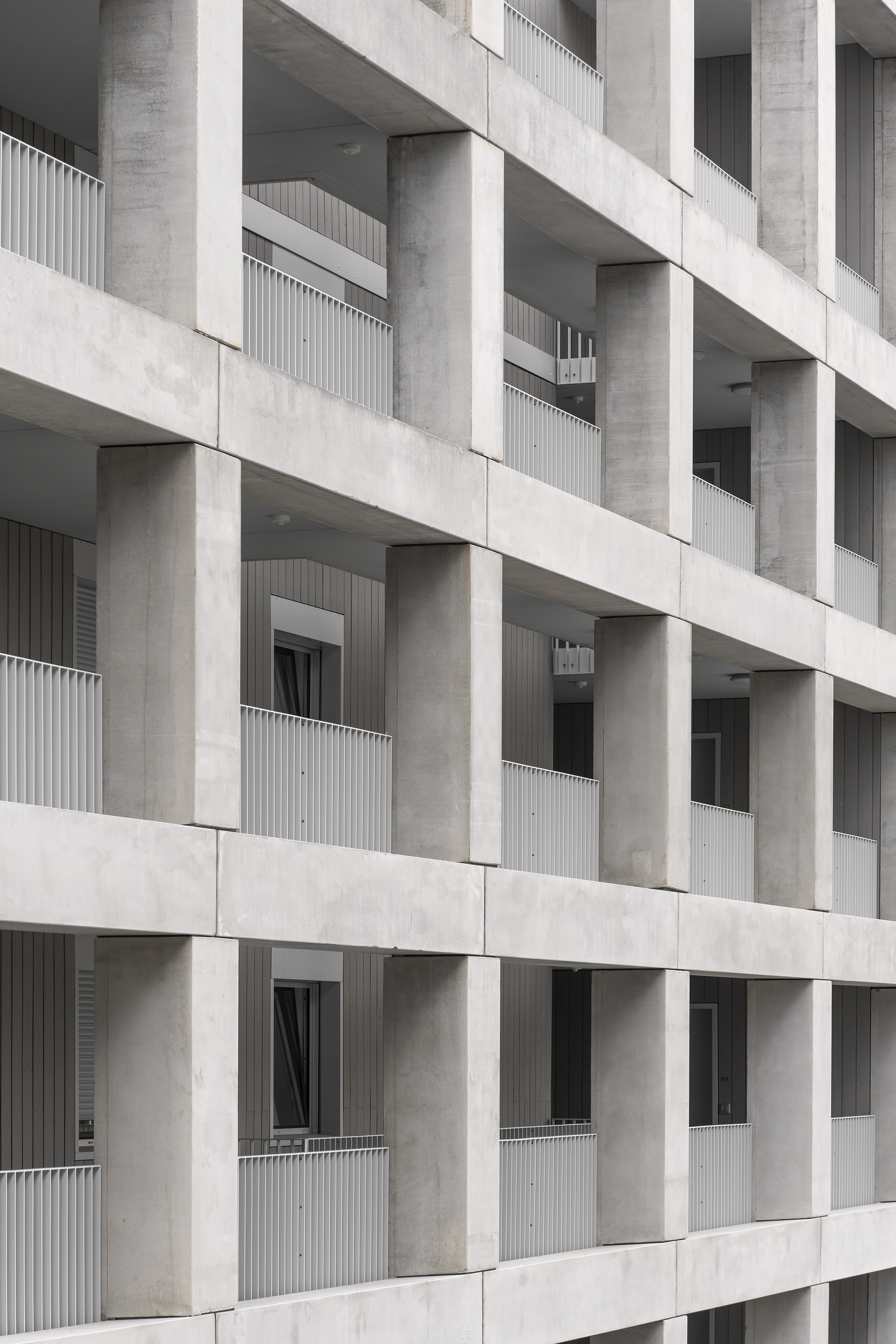 언뜻 보기에 일체식으로 보이는 이 대형 주거 공간은 거대한 투명 파사드과 단일한 완벽한 유리 모서리를 가지는 일반 60x60cm의 프리캐스트 콘크리트로 만들어졌다. 포스트 앤 빔 구조로 구성되어 이러한 양질의 고품질 파사드는 이 건축물의 전체 건축 과정을 간결하게 만들어, 경제적 비용 절감 효과와 친환경적인 측면에서도 최적화되어 있는 프로젝트다. 파사드는 내부에 풍부한 일광을 제공하고 낮과 밤 모두 자연스럽게 도시와 연결되게 해준다. 안뜰과 보도를 향한 수직 표면은 회색 스테인드 목재로 마감되어 독특한 내부 분위기를 선사하며, 외부와 내부의 상반되면서도 어울리는 이중성을 강화하고, 내부 공간 깊은 곳에서부터 보티에르 체니에의 핵심으로 삶을 끌어 올린다.