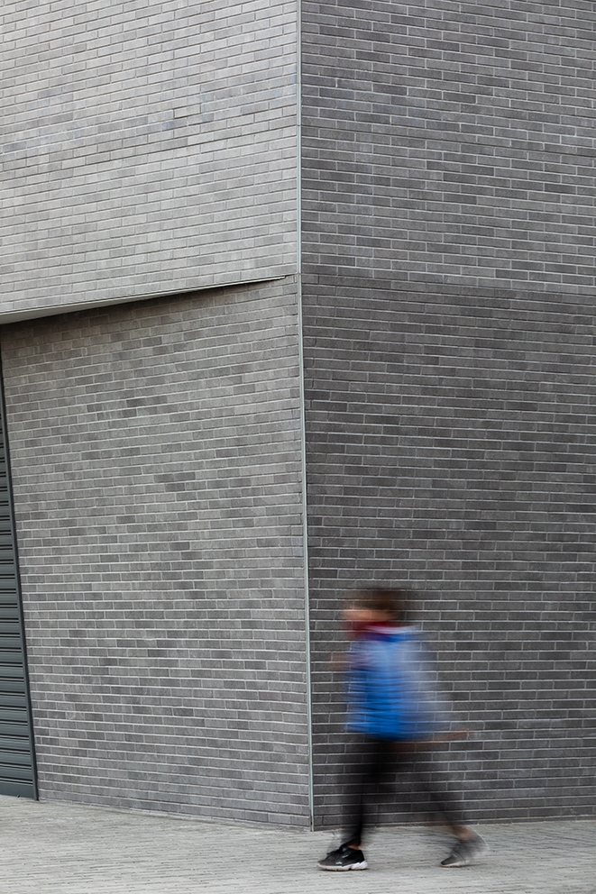 입면의 규칙성은 건물의 주된 특징을 드러낸다. 돌출된 흰색 금속판 요소가 역동적인 리듬을 전달하는데, 균일한 짙은 회색 벽돌 커튼은 일종의 중립적인 요소가 된다. 공공공간 확장을 위해 1층의 외벽을 기울이고, 이런 매스의 균형을 맞추기 위해 건축가는 파사드에 매달려 있는 일련의 가벼운 발코니를 구상하여 모든 사람에게 ‘공평하게’ 여분의 공간을 부여했다. 발코니는 아파트의 자연스러운 확장으로, 바깥쪽으로 돌출되어 있다. 더 나아가서 발코니의 흰색과 타공된 표면 덕분에 실내까지 자연광을 받아들이고 아파트에 10~15m2의 공간을 추가하여 보다 유형적 공간의 품질을 향상시킨다. 낮에는 자연 채광이 건물의 무게감을 줄여주고, 발코니의 부피가 작아 보이게 하면서 재료와 추상성, 가벼움과 중력을 최대한 단순하게 결합시킨다. 건물의 1층은 견고함과 역동성을 동시에 전달한다.