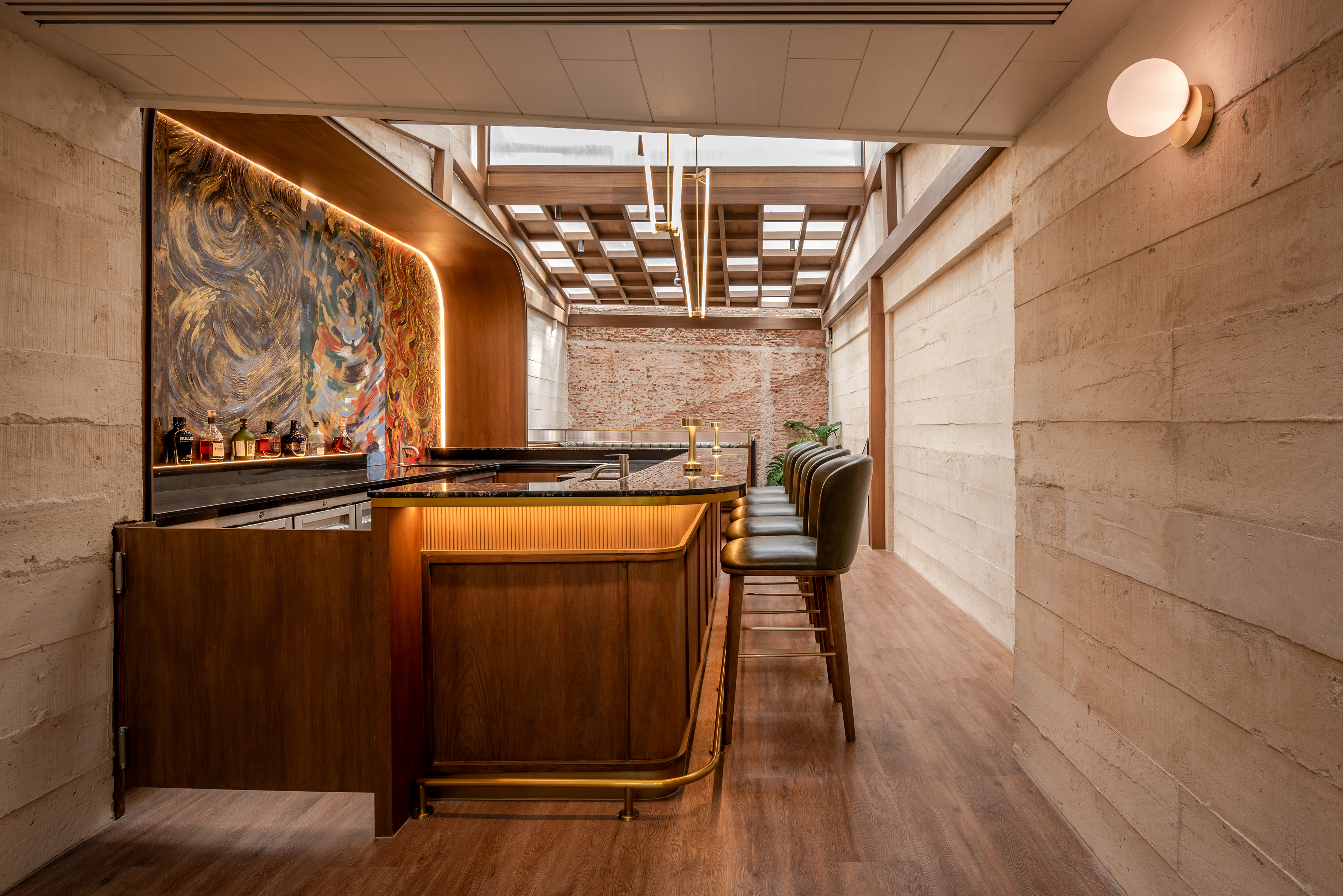 오픈 키친을 지나면 검은색과 어두운 조명이 2층으로 올라가는 계단으로 시선을 이끈다. 각 층의 분위기가 통풍이 잘되는 공간으로 연결된 가운데, 어두운 톤의 가구로 바 역할을 하는 2층에 훨씬 은은하면서도 신비로운 분위기를 자아낸다. 카운터 바 뒤에는 대지의 기원을 강조하는 '4대 요소(물, 불, 흙, 바람)'의 예술 작품이 있어 'MOTHER BKK' 뒤에 숨겨진 이야기를 간접적으로 들려준다.
