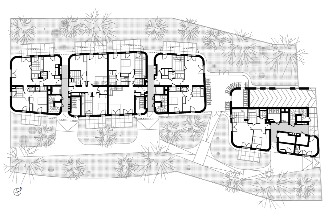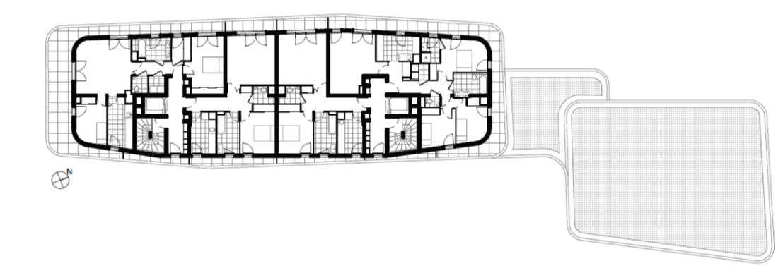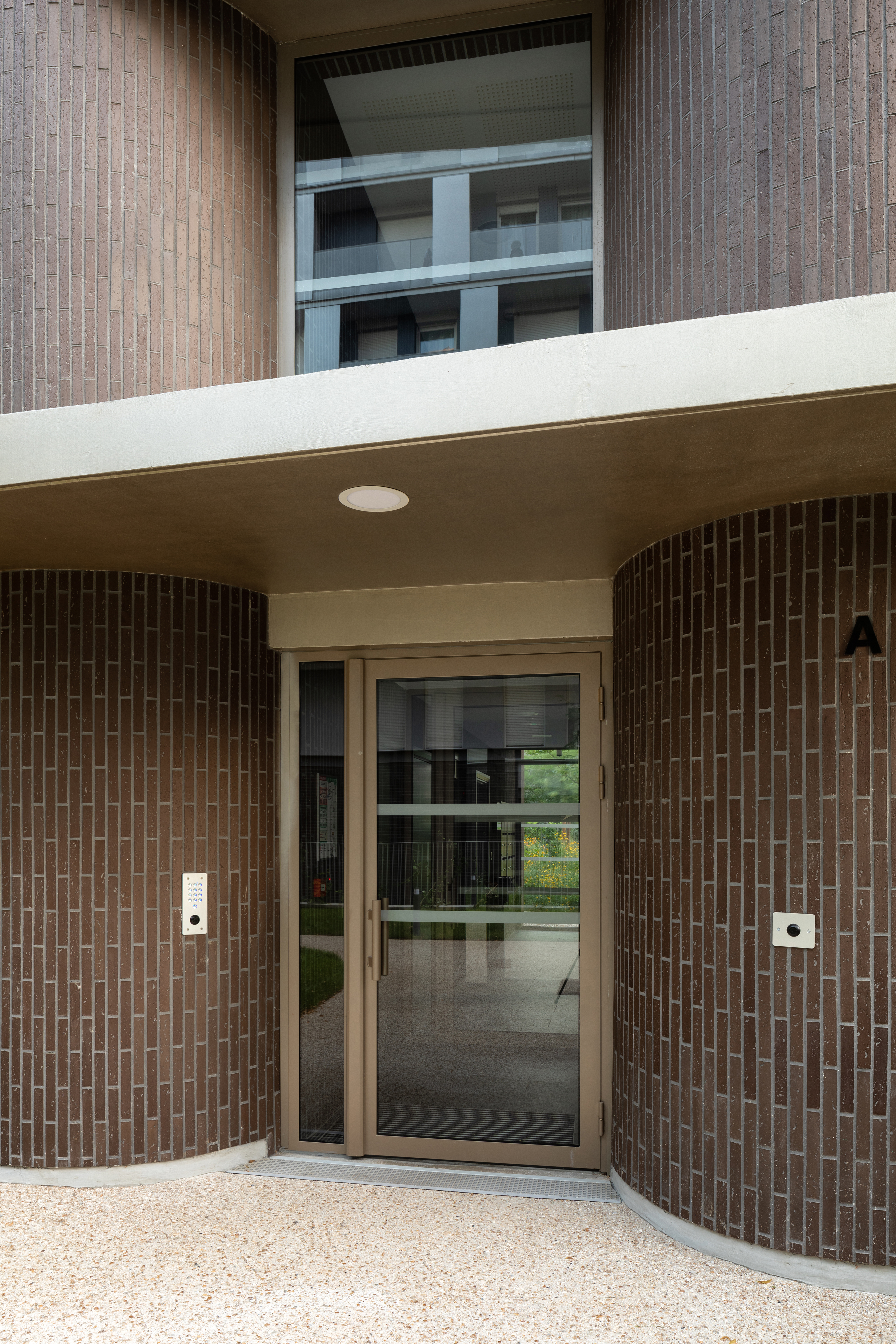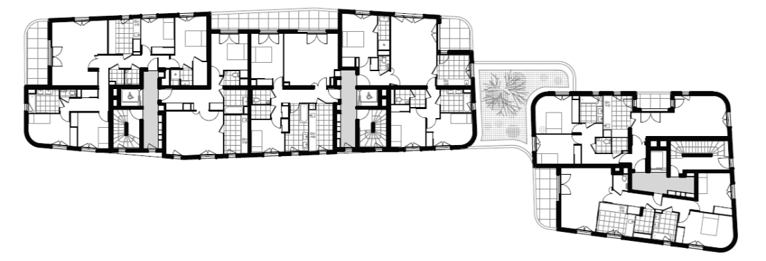 두 개의 건물은 모두 발코니와 테라스, 데크가 공용정원을 향해 열려있다. 모든 파사드는 질적으로 조금 떨어지는 “후면 파사드”를 제외하고 동일한 설계 콘셉트를 가지고 있다. 둥근 모서리는 네 개의 파사드 사이에 큰 유동성을 제공한다. 결국 이 건물에는 길게 펼쳐진 하나의 파사드가 있다고 말할 수 있다. 이 프로젝트는 방 2개 유닛부터 방 5개 유닛의 46세대로 구성되어 있다. 전 세대의 크기는 모든 가족의 요구를 충족시키기 위해 여러가지 다른 구조로 되어 있다. 자체 욕실이 있는 침실도 배치되어 있는 방이 4개 있는 주거세대는 이 아파트 건물 입구에서 바로 접근할 수 있어 부모나 청소년 또는 손님이 자율적으로 이용할 수 있다. 주방은 거실과 분리되어 있거나 분리가 안되어 있을 수 있으며 입구에서 자체적으로 접근할 수 있다. 예를 들어, 방이 두 개인 세대에서 아이와 함께 사는 편부모라면 거실을 침실로 사용할 수도 있다.