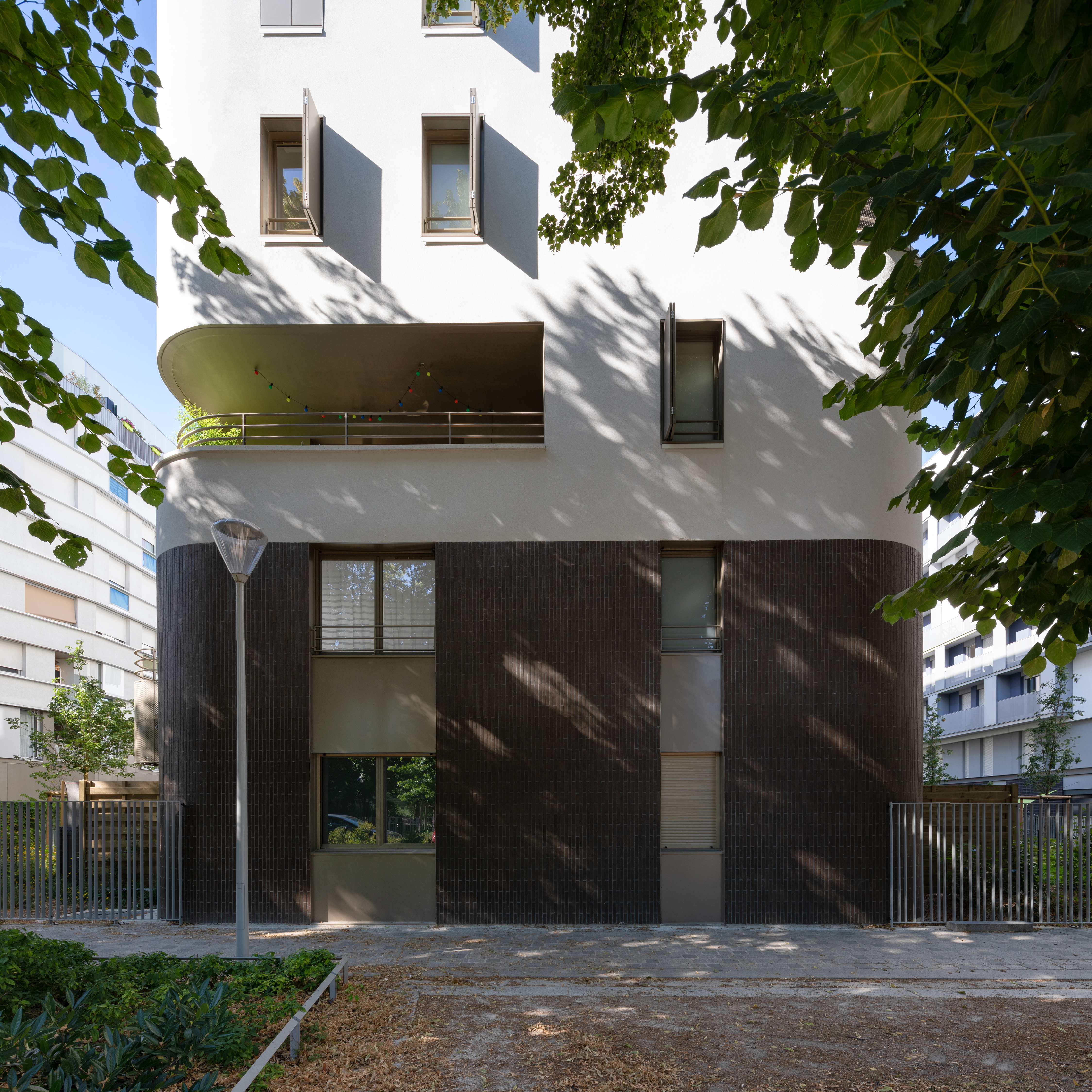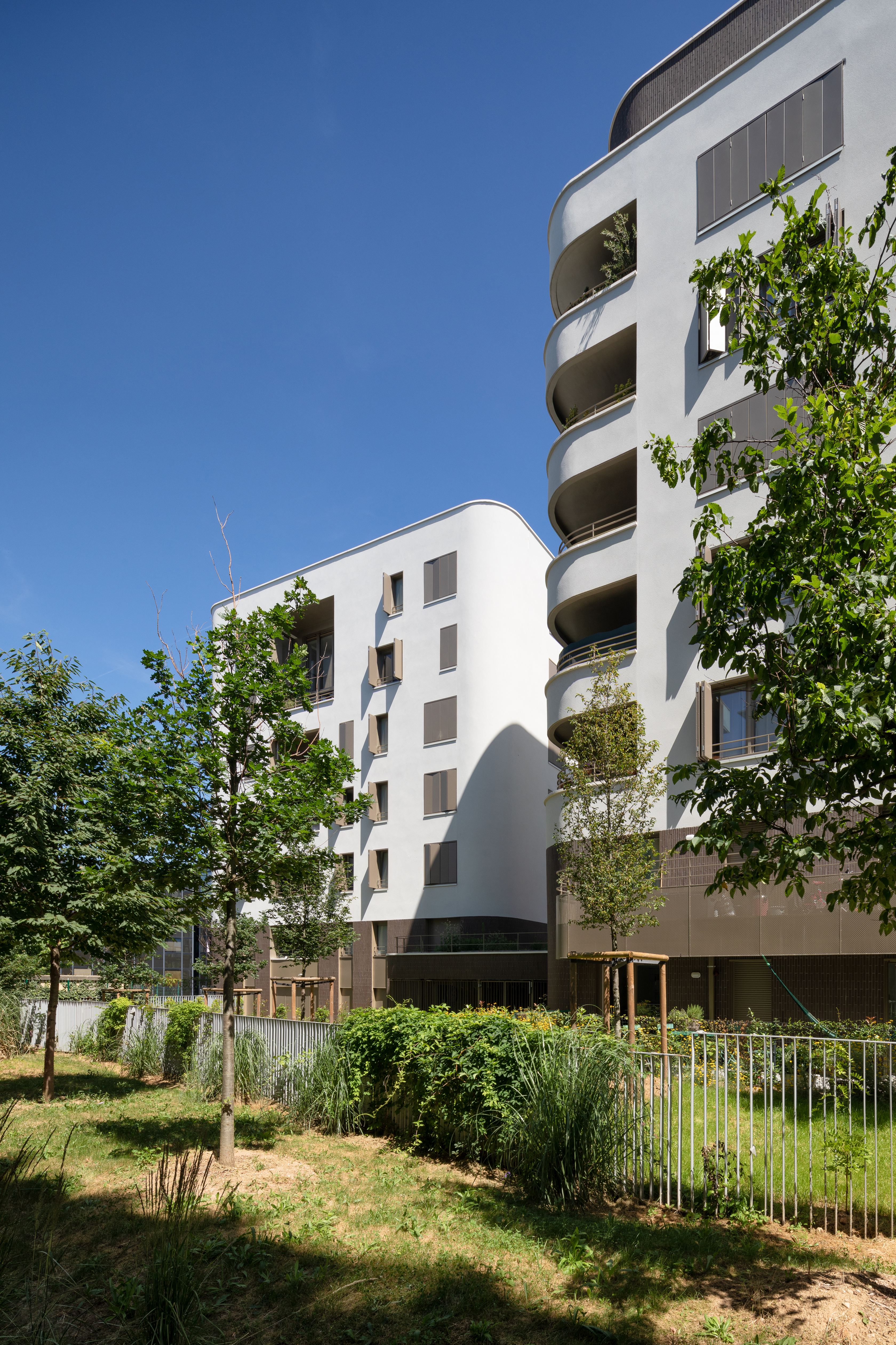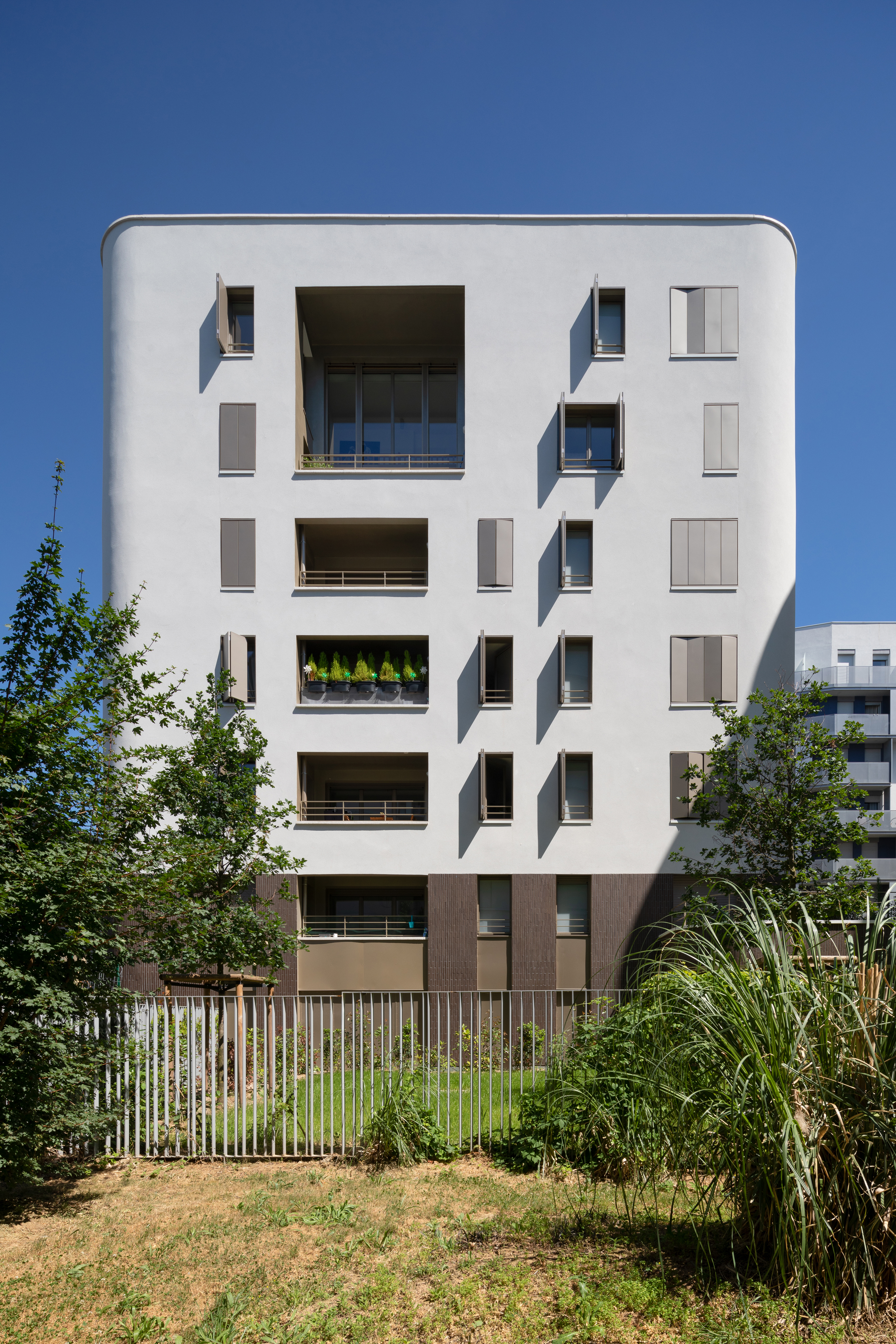 Both buildings are generously opened toward the collective garden through loggias, terraces and decks. All the facades have the same designing concept excluding any less qualitative “Rear Facade”. The rounded corners offer great fluidity between the four facades, in the end we can say that this building has only one long unrolled facade.