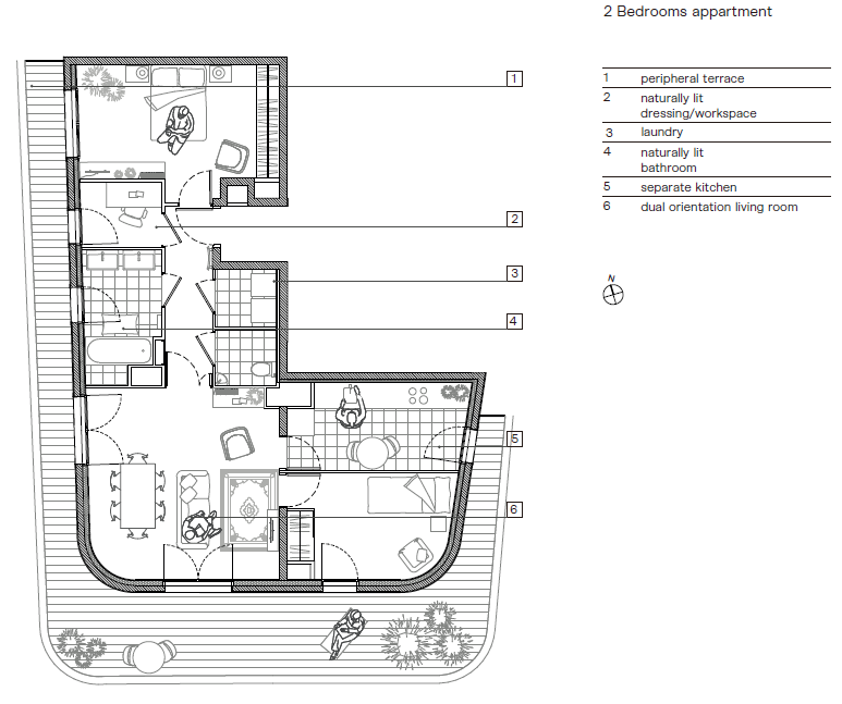 아파트의 전 세대는 두 방향을 조망하며 종종 서로 반대되는 방향을 바라본다. 모든 아파트에는 발코니, 데크, 테라스와 같이 넓은 외부 공간이 있다. 거실은 주로 건물의 각도에 위치하여 두 곳의 전망, 방향 및 뛰어난 일광욕의 이점을 누릴 수 있다. 바닥 계단참은 편안한 회의 공간으로 쓰이며, 모든 공간에는 자연광이 들어오며 건물 정원이 보인다. 계단에도 자연스럽게 빛이 들어와 1층 주민들이 보다 편안하게 사용할 수 있다.
