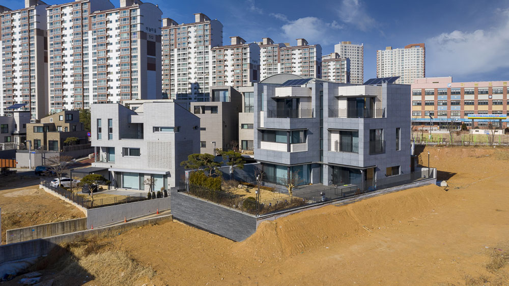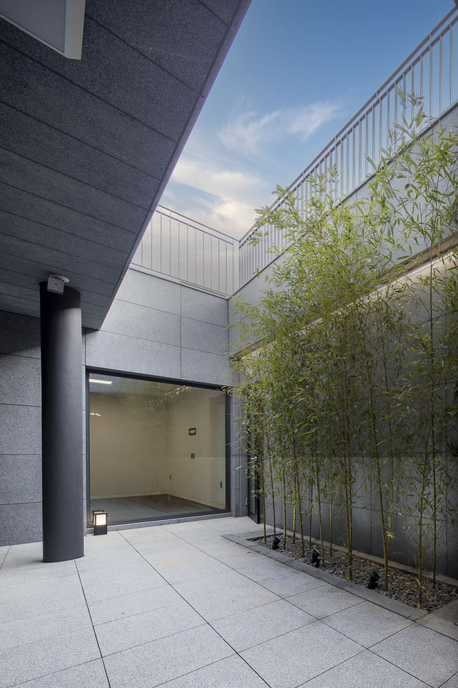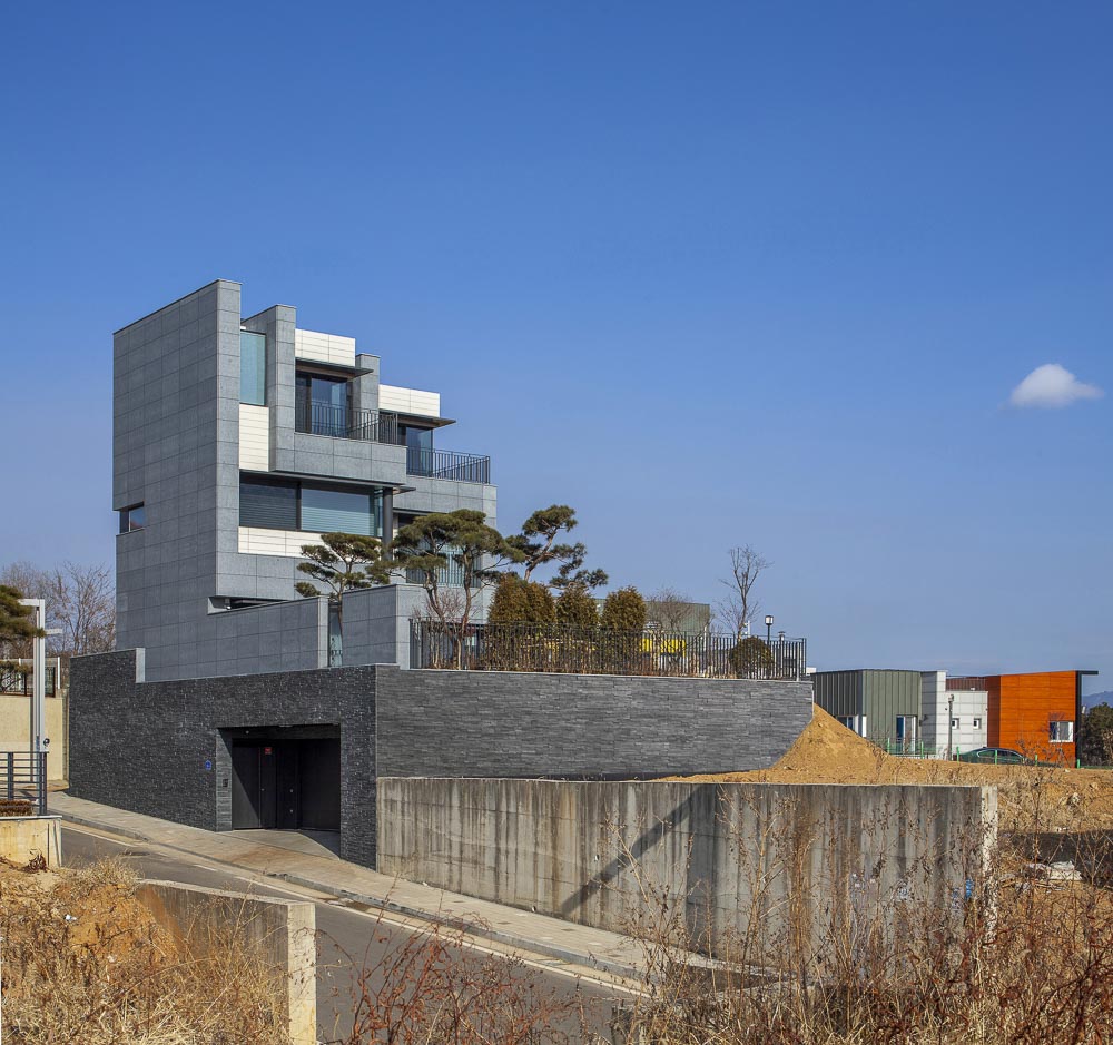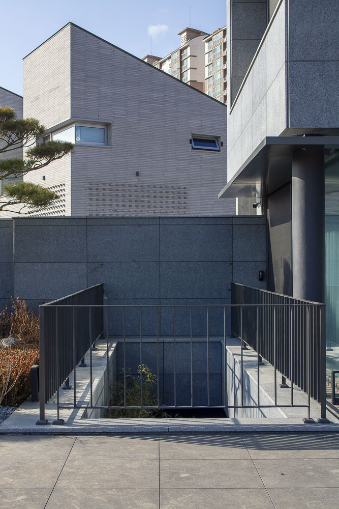 O1 is a house that is made up of several tightly overlapping walls. The land where O1 was located was a low mountain in the past. The site had trees that were not lush and a gentle slope to the south. The site is located on the highest lot in the complex, and as it is at the corner, it overlooked the beautiful nature and scenery. The land was long from north to south, and it was tapered to a point towards the north. It is a residential space that captures the wide landscape on the other side of the house, while at the same time protecting its residents from the road on the west side that collides with the site. The house is vertically zoned from the first basement floor to the third floor. When viewed from the road, the walls overlap and make it seem like a closed house, but like an unexpected twist, an open space appears in the interior. For this end, the space between the walls were made to be as transparent and bright as possible, allowing the light to unfold deep in the house, and the panoramic view is captured by pushing the wall back towards the east. Since the height of the site is 3.5m higher than the driveway to make the parking lot underground, the main entrance of the house had to be on the basement floor. To compensate for this shortcoming, a small sunken is met when entering through the front door, and the part facing the basement was made as a small, all-transparent buffer space, giving the impression of being open to the sky. The yard on the ground floor is protected from the exterior and open from the house, forming a cozy space for residents. The stairs located at the center of the building continues from the first basement floor to the third floor, and open between the walls to attract the scenery of the sky into the house. This staircase acts as a ‘light-duct’ that brightens every corner of the house. The main materials used for the exterior are granite (Goheung granite) and thin-plate ceramic tiles (wood pattern). Although natural stone and ceramic tiles are made of the same material, one has a dark and heavy color, while the other is bright and cheerful. The light wood-patterned tiles exposed between the thick natural stone walls attract and reflect light. The metal canopies, which resemble the column and light panels in the front, relieve the heavy feeling of the two exterior materials.