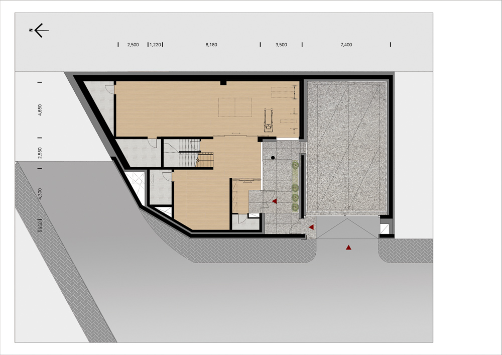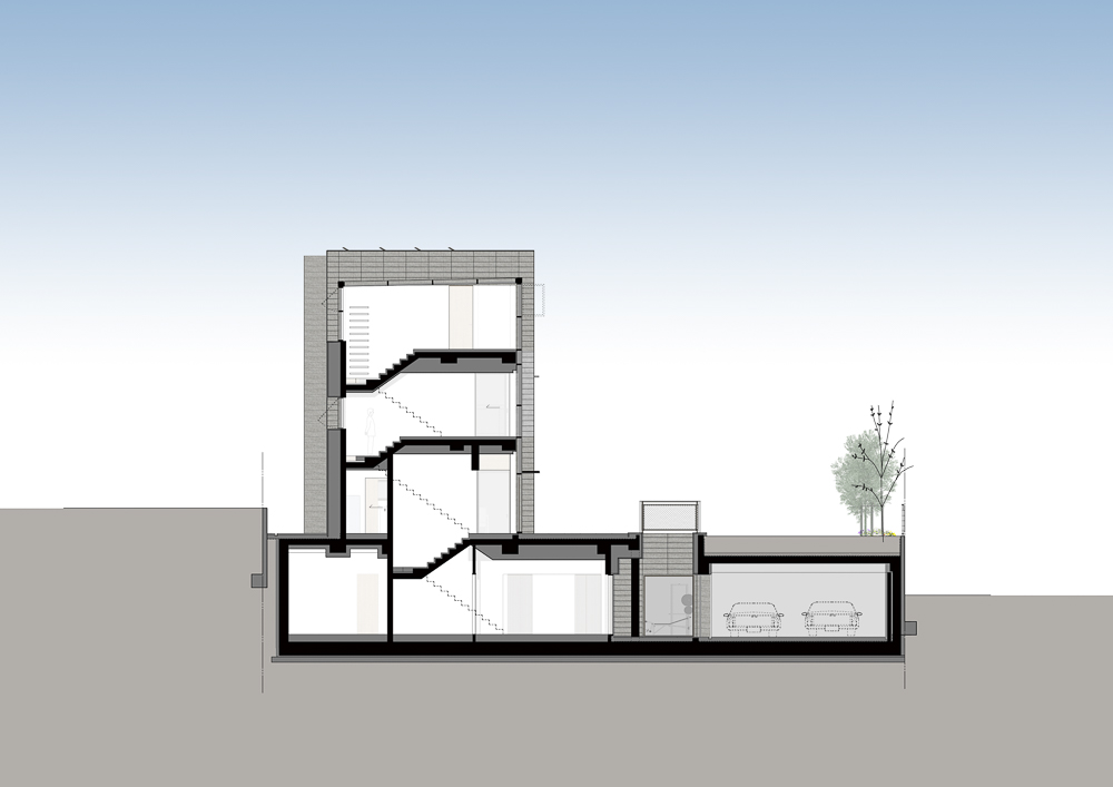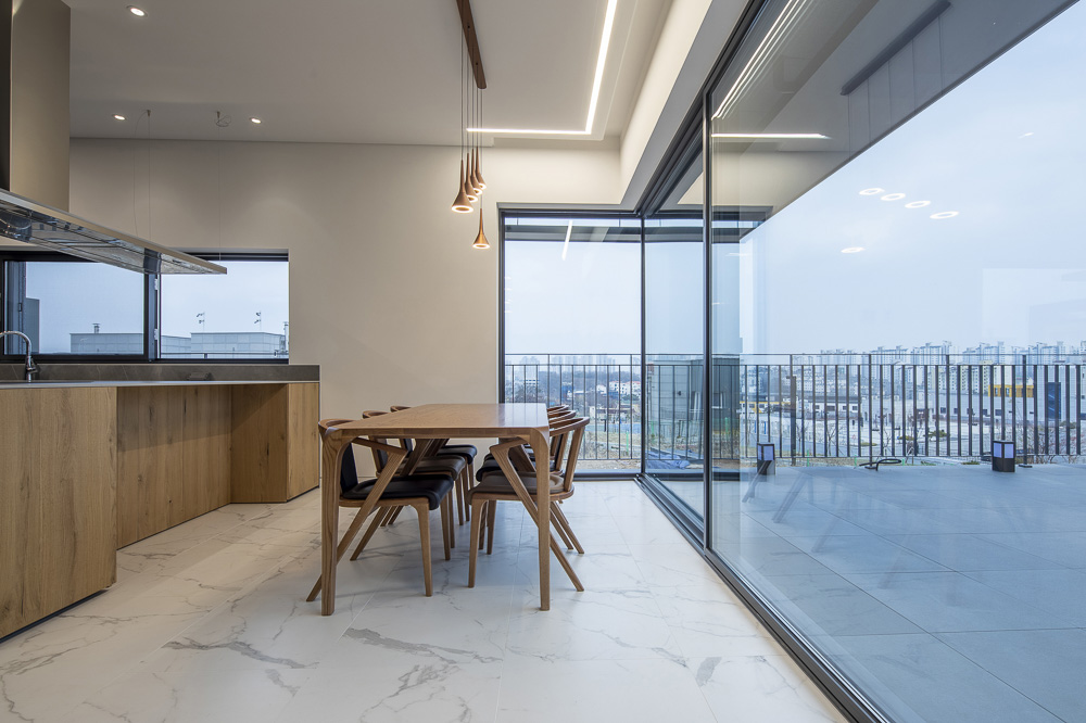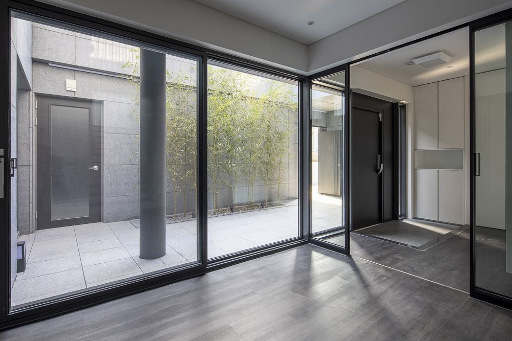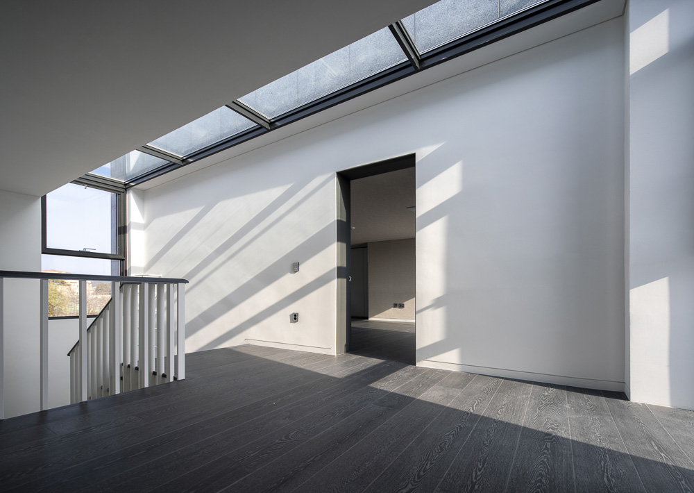 O1 is a house that is made up of several tightly overlapping walls. The land where O1 was located was a low mountain in the past. The site had trees that were not lush and a gentle slope to the south. The site is located on the highest lot in the complex, and as it is at the corner, it overlooked the beautiful nature and scenery. The land was long from north to south, and it was tapered to a point towards the north. It is a residential space that captures the wide landscape on the other side of the house, while at the same time protecting its residents from the road on the west side that collides with the site. The house is vertically zoned from the first basement floor to the third floor. When viewed from the road, the walls overlap and make it seem like a closed house, but like an unexpected twist, an open space appears in the interior. For this end, the space between the walls were made to be as transparent and bright as possible, allowing the light to unfold deep in the house, and the panoramic view is captured by pushing the wall back towards the east. Since the height of the site is 3.5m higher than the driveway to make the parking lot underground, the main entrance of the house had to be on the basement floor. To compensate for this shortcoming, a small sunken is met when entering through the front door, and the part facing the basement was made as a small, all-transparent buffer space, giving the impression of being open to the sky. The yard on the ground floor is protected from the exterior and open from the house, forming a cozy space for residents. The stairs located at the center of the building continues from the first basement floor to the third floor, and open between the walls to attract the scenery of the sky into the house. This staircase acts as a ‘light-duct’ that brightens every corner of the house. The main materials used for the exterior are granite (Goheung granite) and thin-plate ceramic tiles (wood pattern). Although natural stone and ceramic tiles are made of the same material, one has a dark and heavy color, while the other is bright and cheerful. The light wood-patterned tiles exposed between the thick natural stone walls attract and reflect light. The metal canopies, which resemble the column and light panels in the front, relieve the heavy feeling of the two exterior materials.