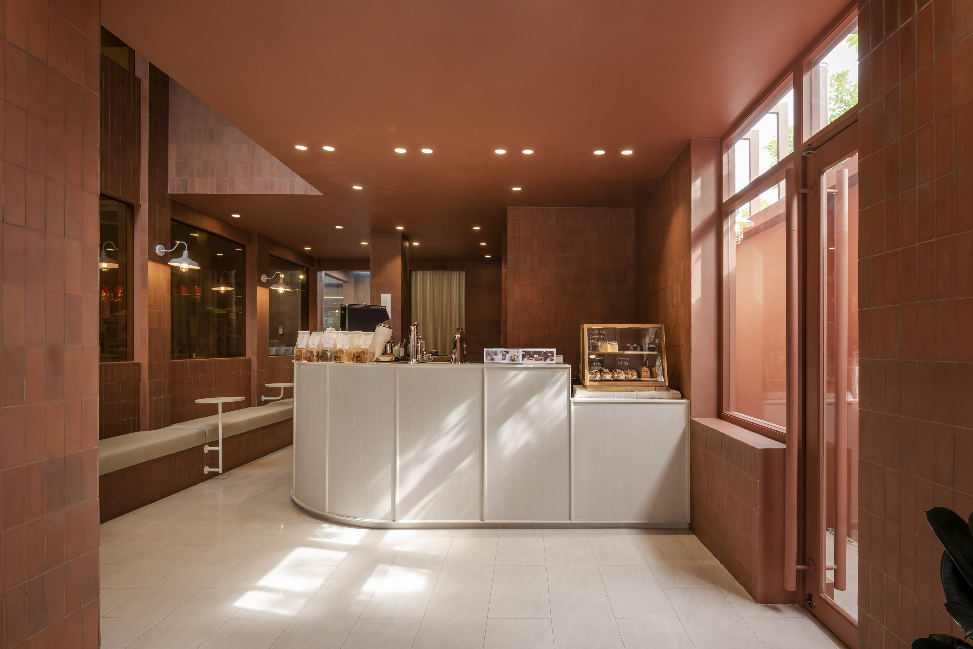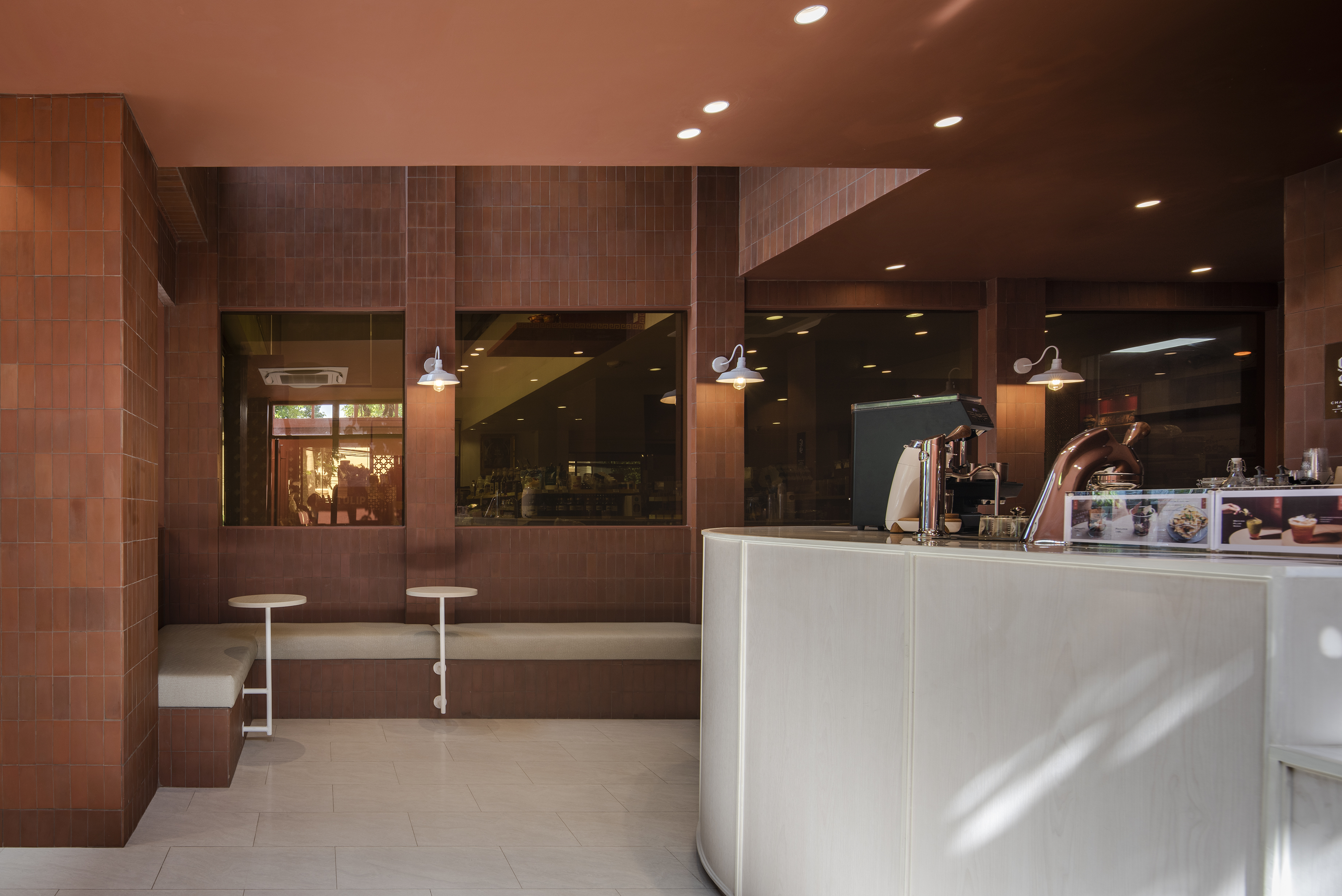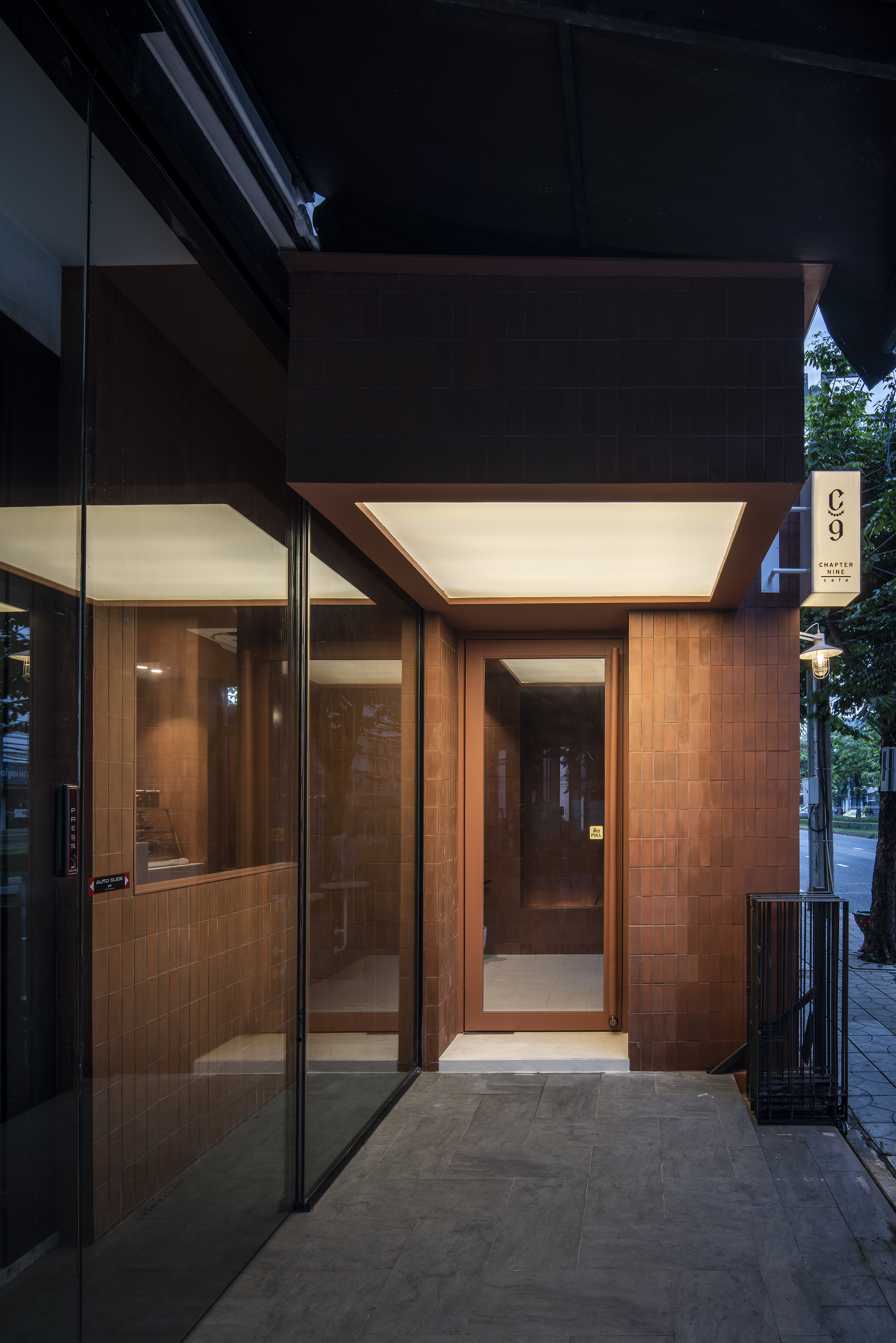 건물 안으로 들어가면 실내를 실외로 느끼도록 디자인하면서 실외와 연결됨을 느낄 수 있다. Chapter 9 Café는 창문이 있는 베이커리 소매점과 연결되어 있다. 고객의 사생활을 보호하기 위해 오렌지 색 반투명 특수 유리를 사용했다.