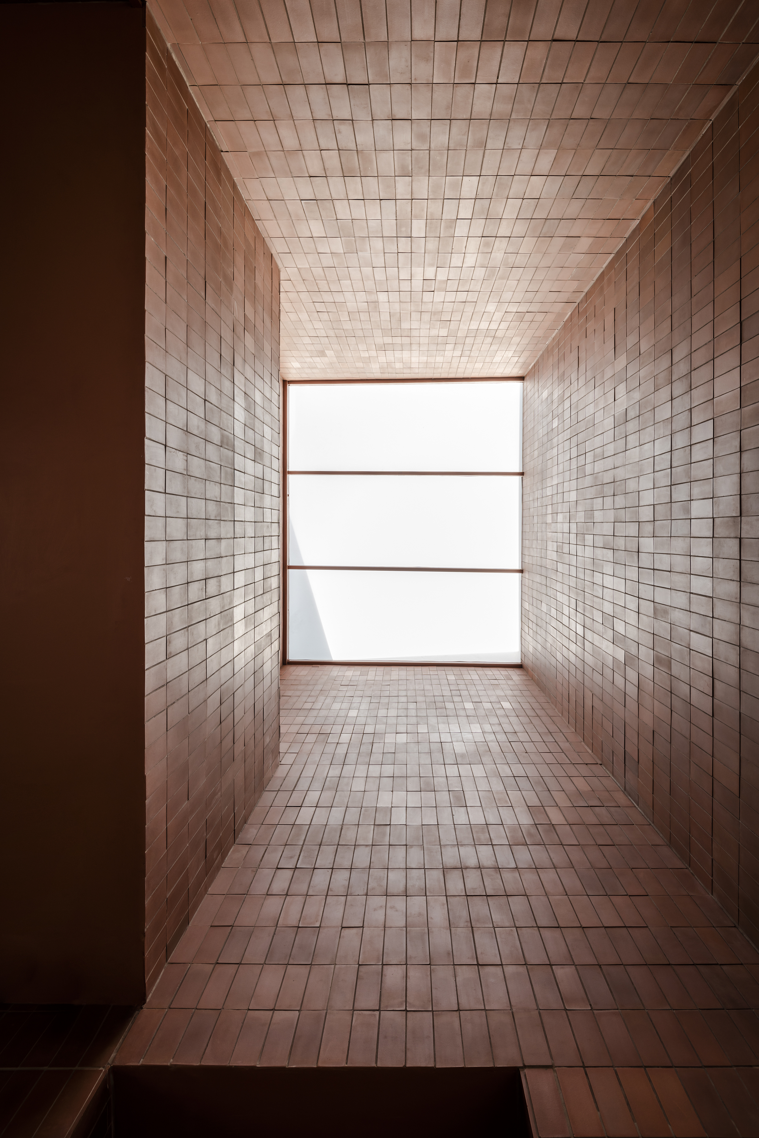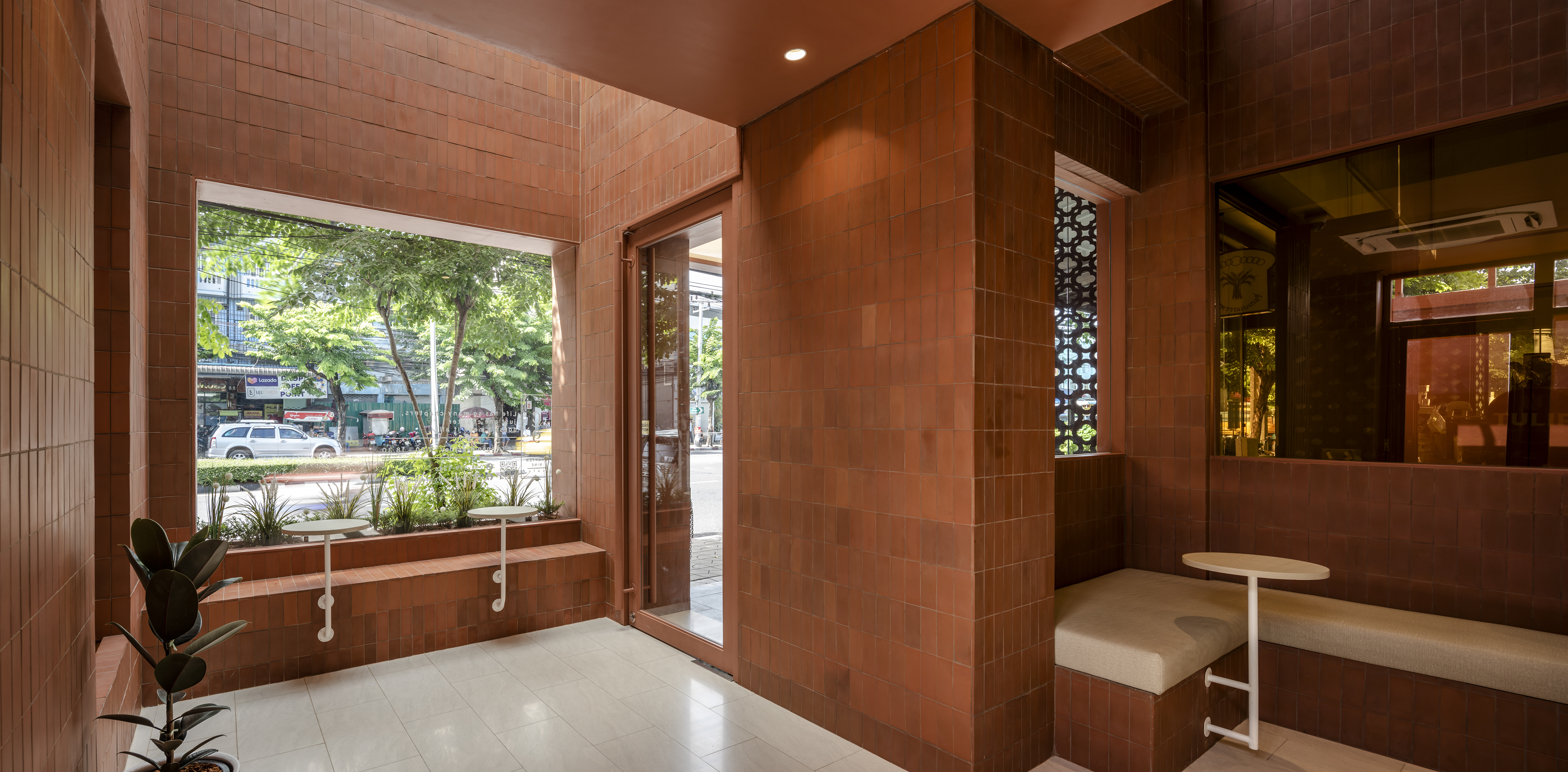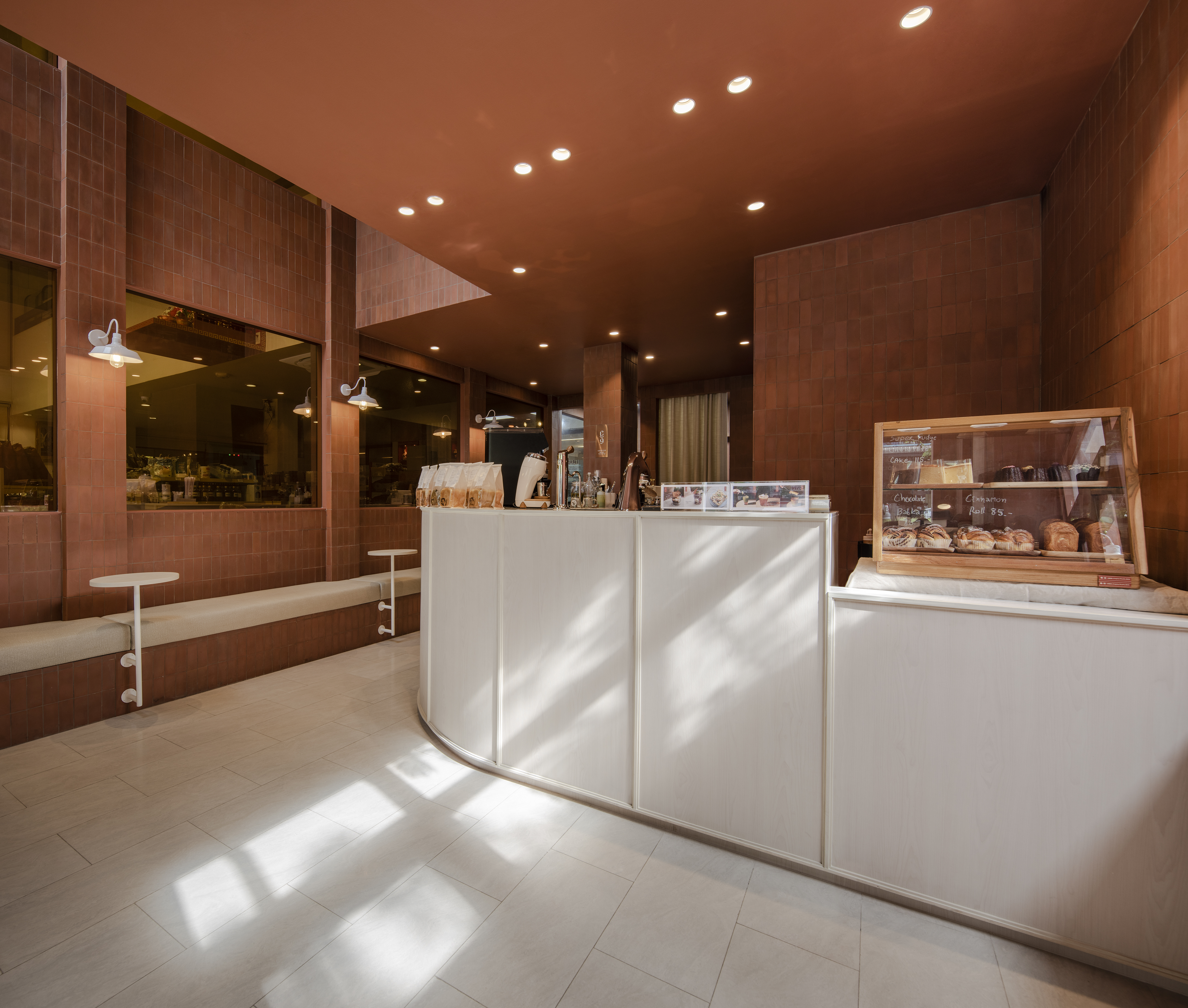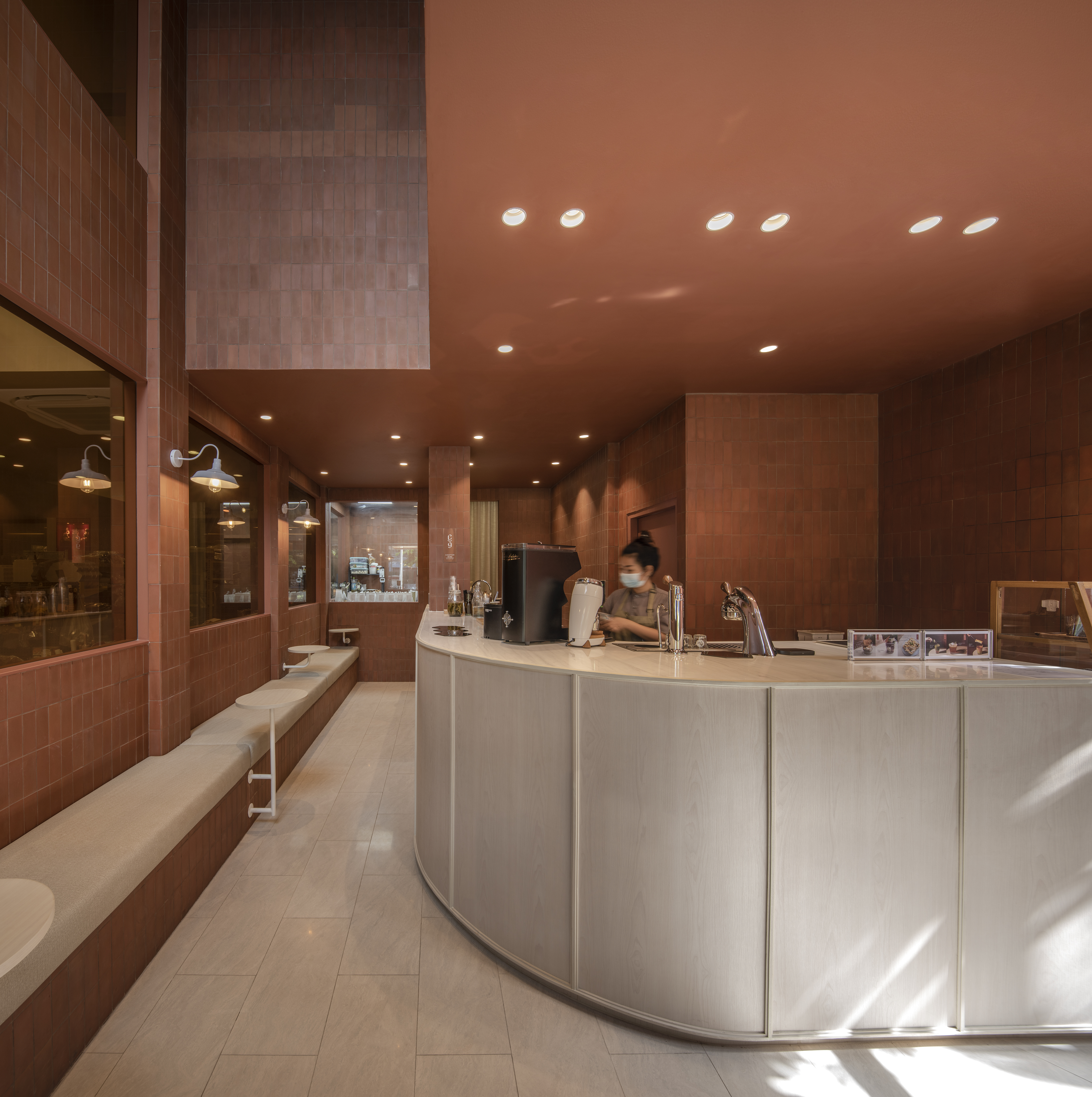 건물 안으로 들어가면 실내를 실외로 느끼도록 디자인하면서 실외와 연결됨을 느낄 수 있다. Chapter 9 Café는 창문이 있는 베이커리 소매점과 연결되어 있다. 고객의 사생활을 보호하기 위해 오렌지 색 반투명 특수 유리를 사용했다.
