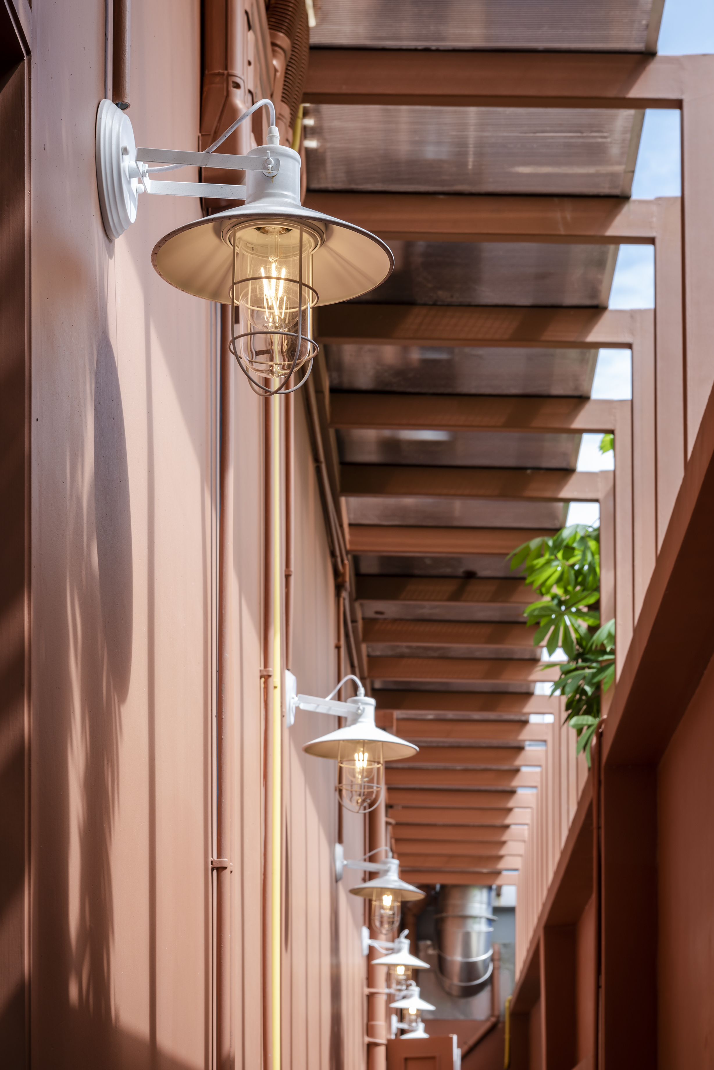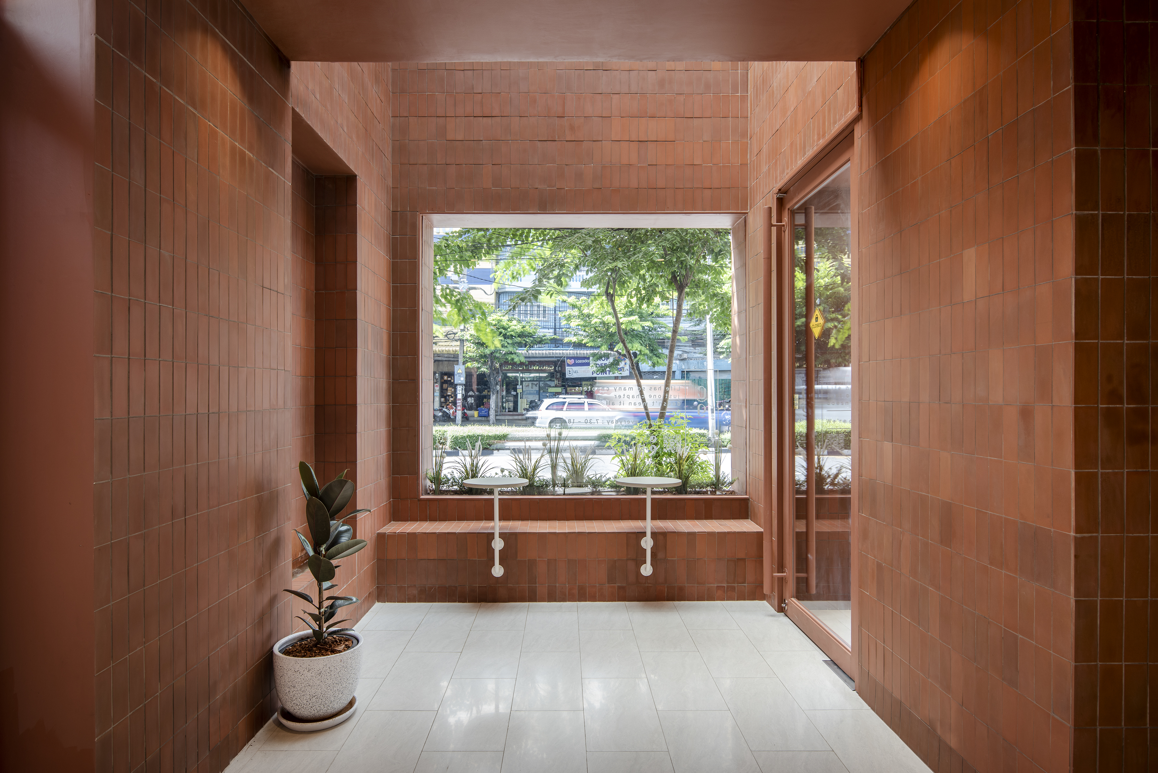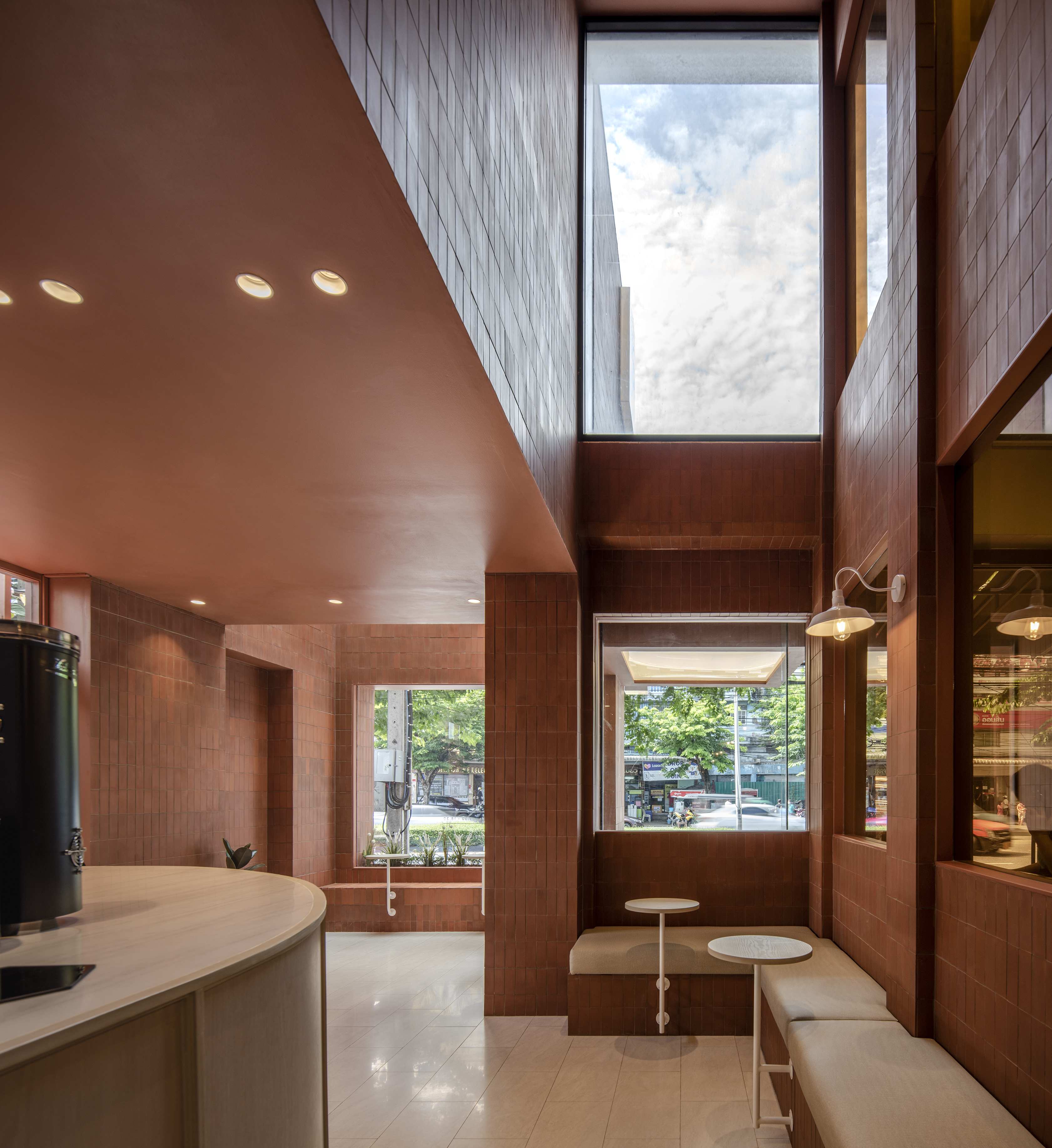 건물 안으로 들어가면 실내를 실외로 느끼도록 디자인하면서 실외와 연결됨을 느낄 수 있다. Chapter 9 Café는 창문이 있는 베이커리 소매점과 연결되어 있다. 고객의 사생활을 보호하기 위해 오렌지 색 반투명 특수 유리를 사용했다.