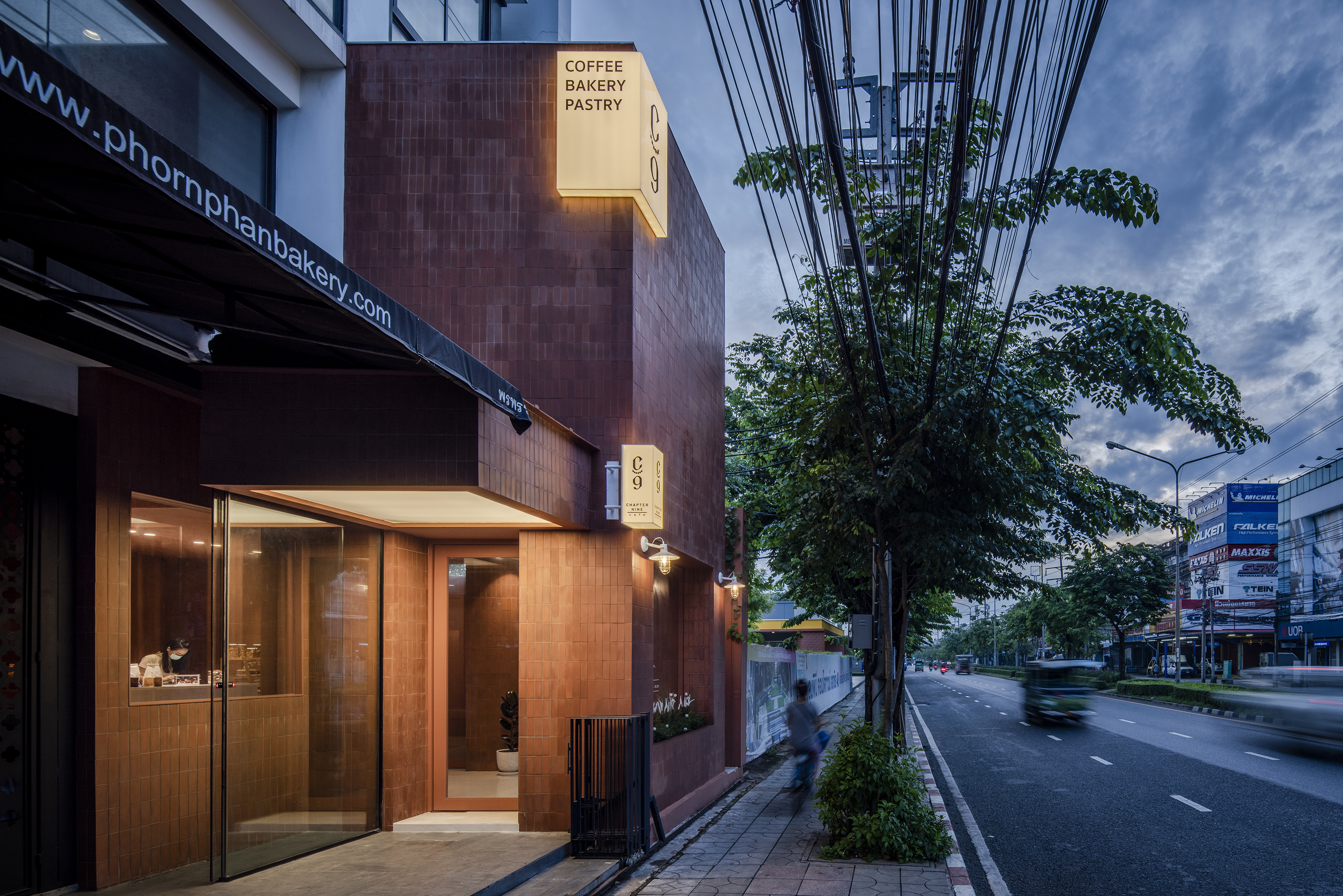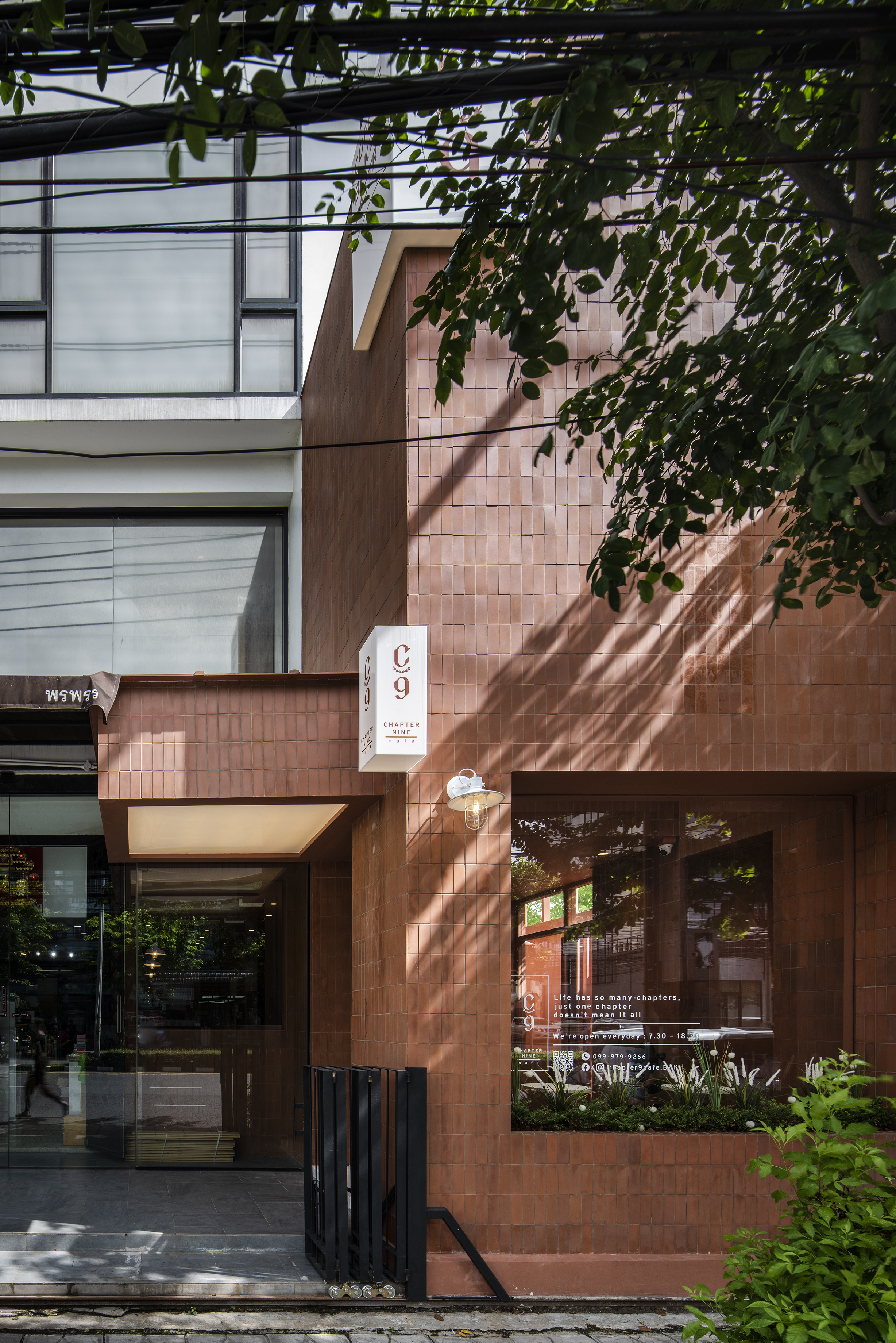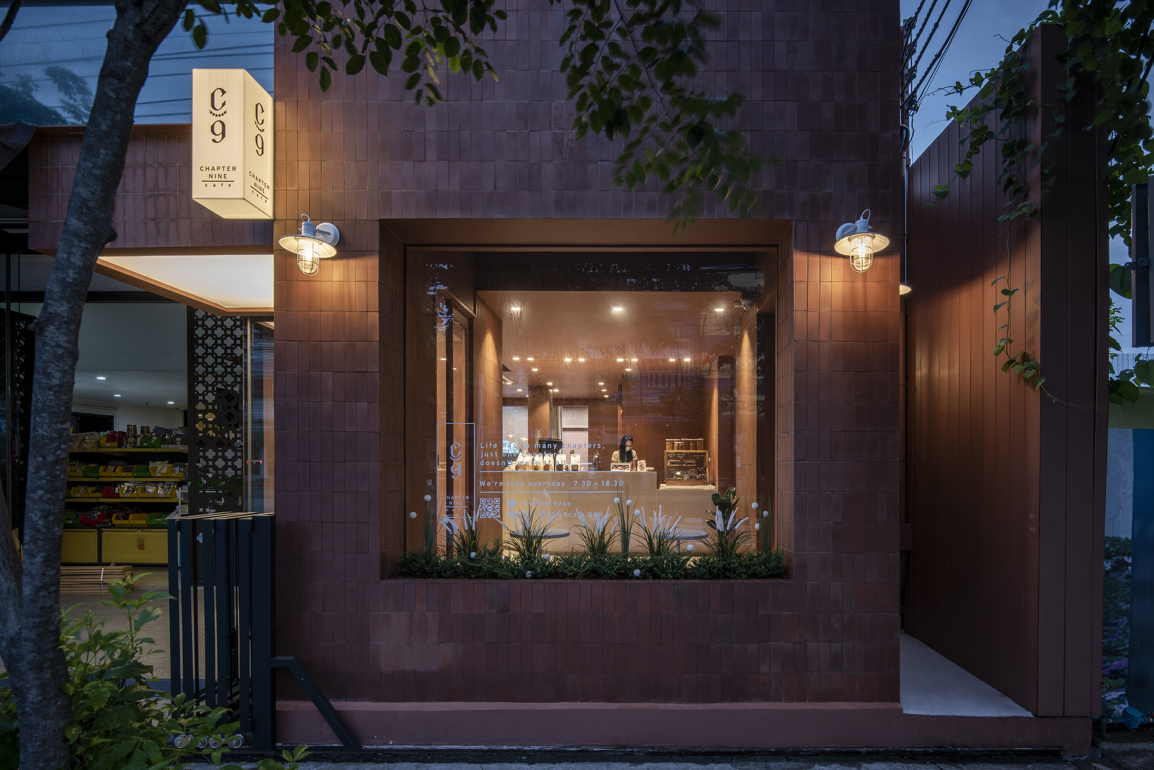 Chapter 9 Café는 태국 방콕에 위치한 빵집이다. 디자이너는 프랑스의 전통적인 굽는 방법인 "화덕"에서 아이디어를 얻었다. 화덕은 흙과 벽돌로 손으로 만들어졌다. 점토 타일을 외관과 내부 모두 1:1의 비율로 사용하고 현대적인 분위기를 더하기 위해 모노톤의 클레이타일을 사용했다. Chapter 9 Café 는 점토타일과 같은 전통적인 재료를 사용하면서 현대적인 형태의 빵 덩어리처럼 생긴 큐브박스로 디자인되었다. 이는 건물에 새로운 정체성을 부여하고 사람들의 시선을 사로잡는다.