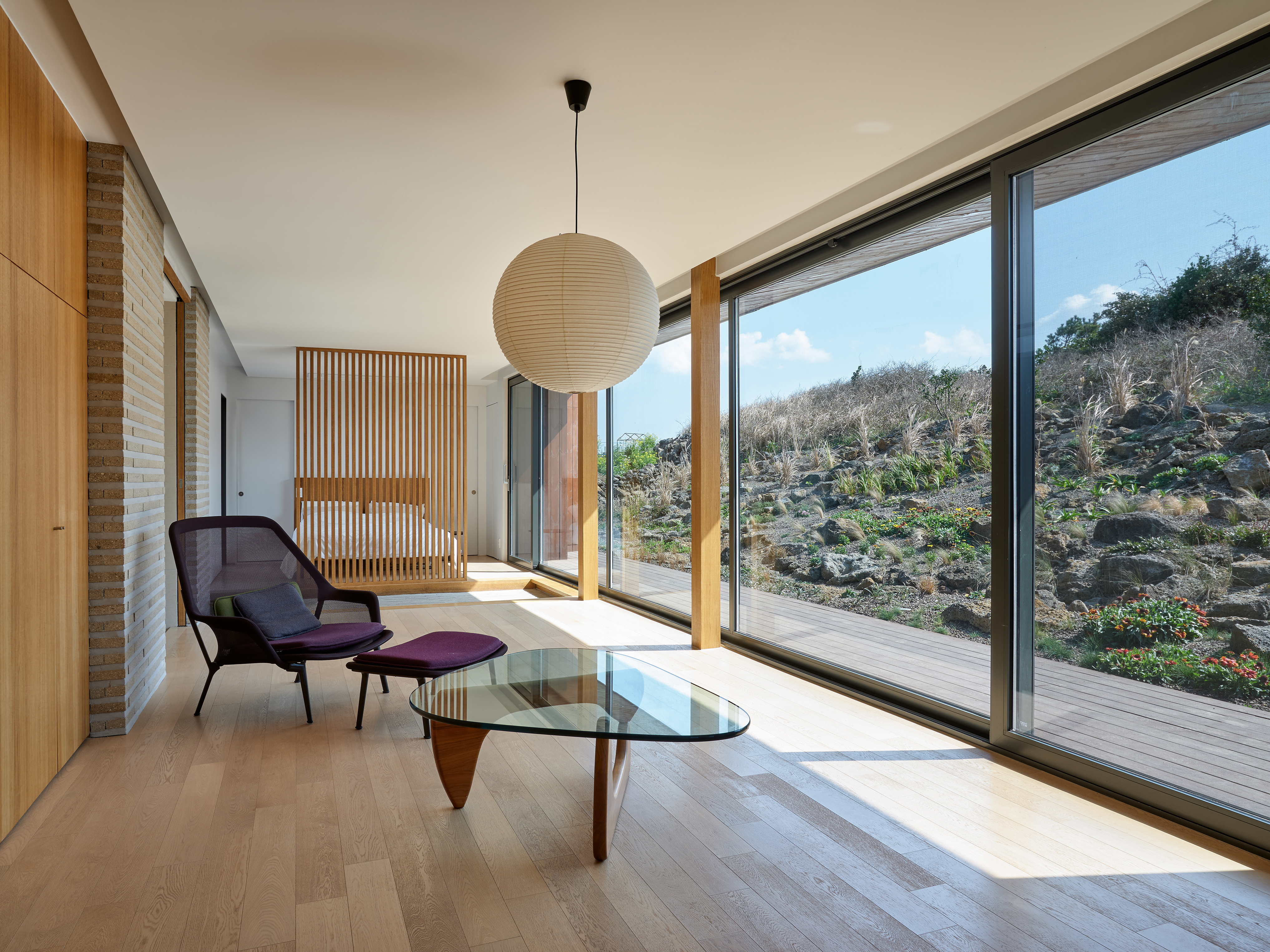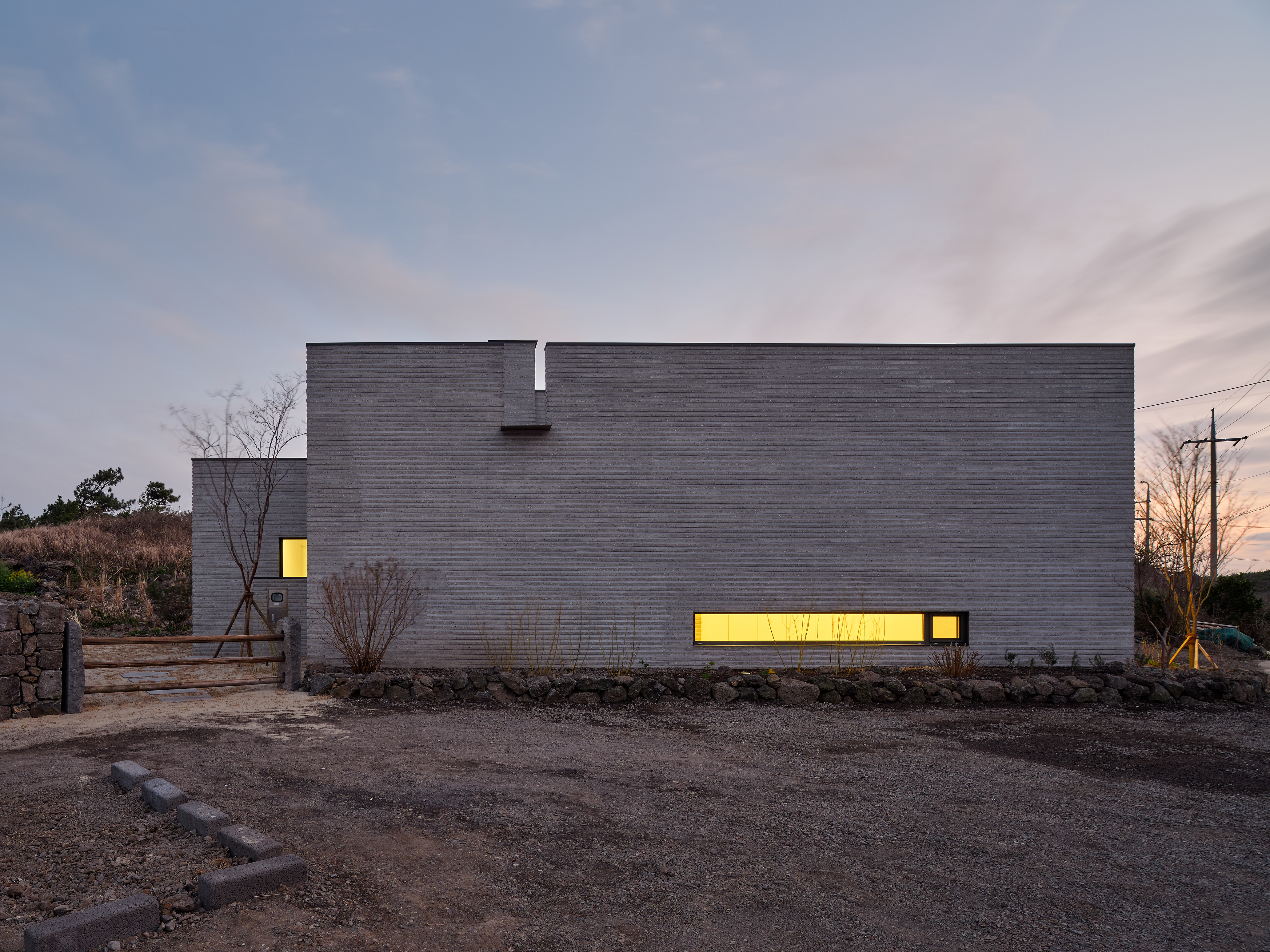 The “Summmoru” is located in Sagyeri, Andeok-myeon, Seogwipo-si, Jeju-do. Following the coast covered with basalt hammered by waves and entering the village, there is a site in front of a small, rough hill covered with grass swayed by the wind. After the first glance, the floor plan of this house, which seems ordinary, is actually a little different. The house is largely divided into two spaces, one side facing the rough hillside, and the other side with a tall window framing the high sky and sunset. All walls except in the toilets and warehouses have been removed so that the house can be used as a pleasant open space. However, the heights of the floor and ceiling were used to distinguish the rooms. ‘Bedroom 1’ and the ‘studio’ were divided by the height of the ceiling, and the ‘living room’ and ‘bedroom 2’ were separated by placing a lower corridor between them. The corridor was given a function by connecting the two spaces and the main entrance. ‘Bedroom 2’ is the master bedroom for the client, and a louver is used to cover a certain part of the space, but keeps the open comfortableness.