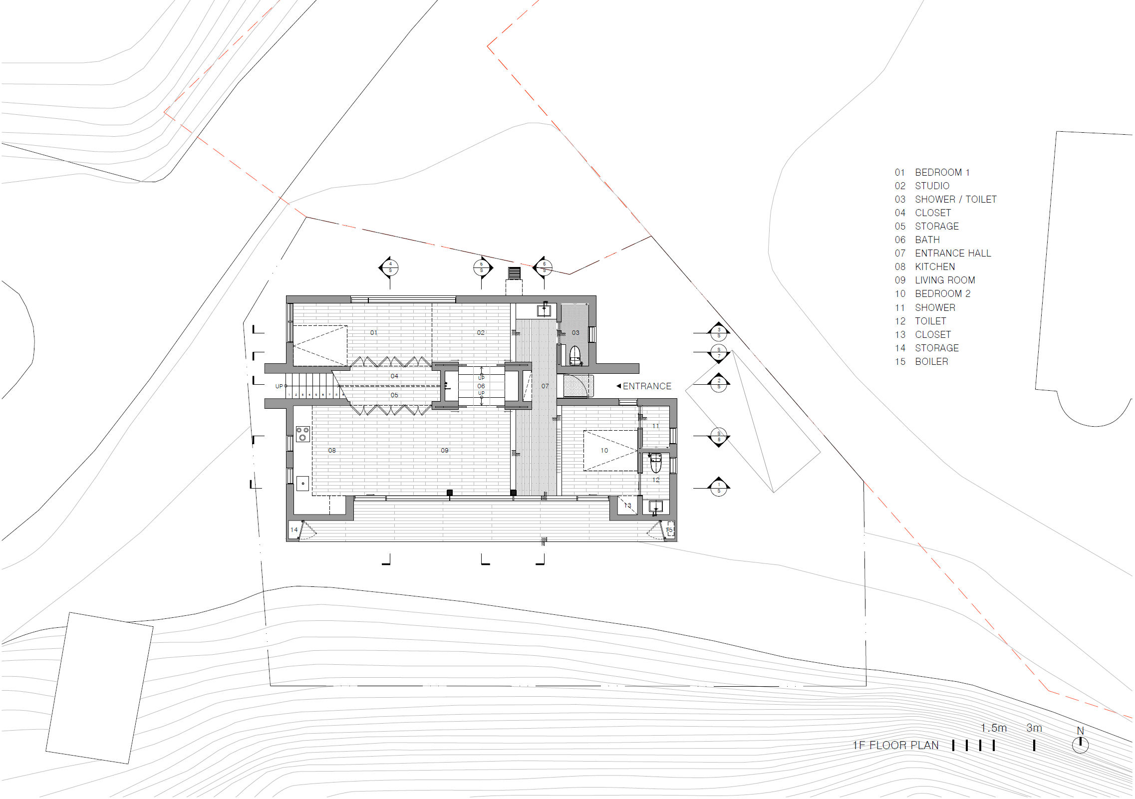하지만 실은 구분할 수 있도록 바닥과 천장의 높낮이를 활용했다. ‘침실-1’과 ‘스튜디오’는 천장의 높낮이로 구분했으며, ‘거실’과 ‘침실-2’는 한 단 낮은 복도를 사이에 둠으로써 공간을 구분했다. 복도는 두 개의 공간과 주 출입구를 연계하여 기능을 부여했다. ‘침실-2’는 건축주의 주 침실로서 루버를 활용하여 일정 부분 가려주되 열려 있는 쾌적함을 유지하고자 했다. 두 개의 공간으로 나누기 위하여 중심선을 따라 외부 계단을 배치하고 계단 하부는 창고로 계획했다. 두 공간은 완전히 막지 않고 중앙에 욕조를 배치하여 구분하고 거친 언덕 쪽을 향한 프레임이 되도록 했다. 가로로 긴 통창 너머 비, 바람 그리고 태양으로 보호하기 위해 집의 일부를 밀어 넣는 방식을 통해 처마와 데크를 계획하고 외부에서도 비를 피하며 거친 언덕을 바라볼 수 있게 했다. 옥상으로 가는 외부 계단은 집을 나와 열린 공간을 지난 뒤 좁고 높은 벽이 양 옆에 있는 계단을 통해 온전히 하늘만을 보며 오르게 된다. 옥상에 오르면 펼쳐진 하늘을 볼 수 있도록 했으며, 거친 언덕을 높은 시선에서 볼 수 있다. 또한, 주변 건물들로 인해 가려졌던 북측 앞 바다가 비로소 보이게 되며 건축을 통한 의도적인 자연의 독주를 다시 한 번 통합적인 오케스트라로 감상할 수 있게 된다.
