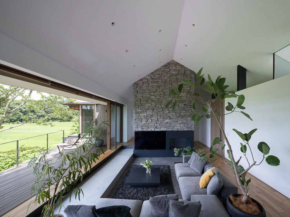 In contrast, the living room floor is sunken, so that when sitting on the sofa to look outside, one has the sense of being immersed in nature. Small variations as the design moves smoothly from living room, up a step, and onto the deck mimic the ambiguous boundaries when moving from den-like-interior to veranda to garden in a traditional Japanese home, while also crafting diverse situations for experiencing the connection to nature. In addition to making use of the natural landscape, we planted an eight-meter-tall hackberry tree on the north side of the deck terrace, enhancing the sense of depth when looking out from the living room. The client’s addition of “secondary nature” around the house further enlivens the space. The combination of an elegant modern design with natural materials such as wooden furniture and a stone volume above the fireplace allows architectural beauty and natural beauty to balance each other and set each other off to best advantage.