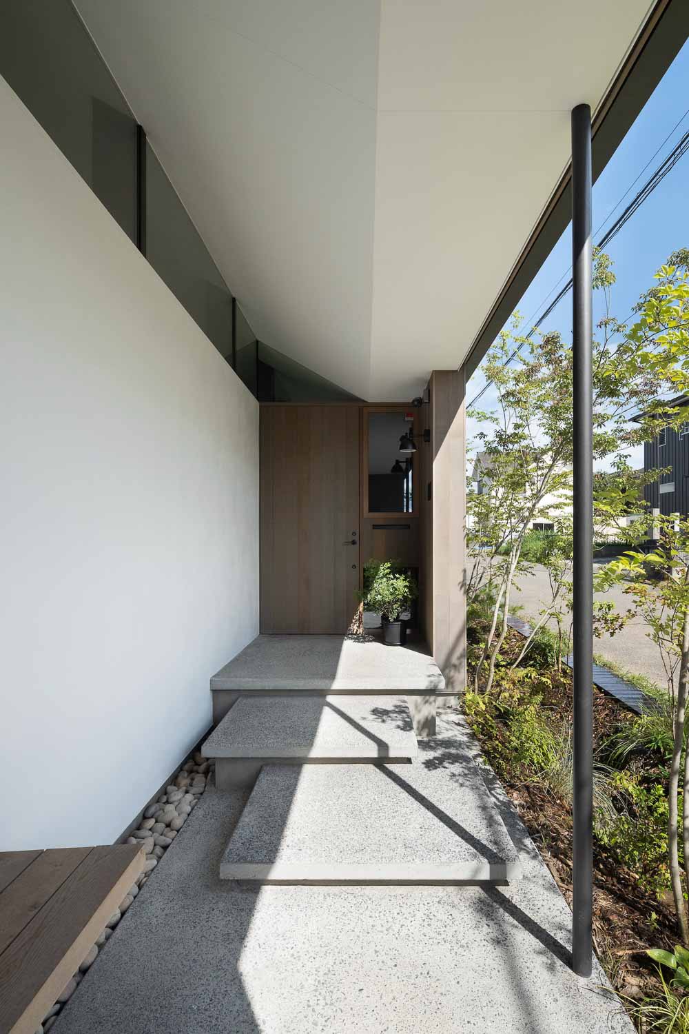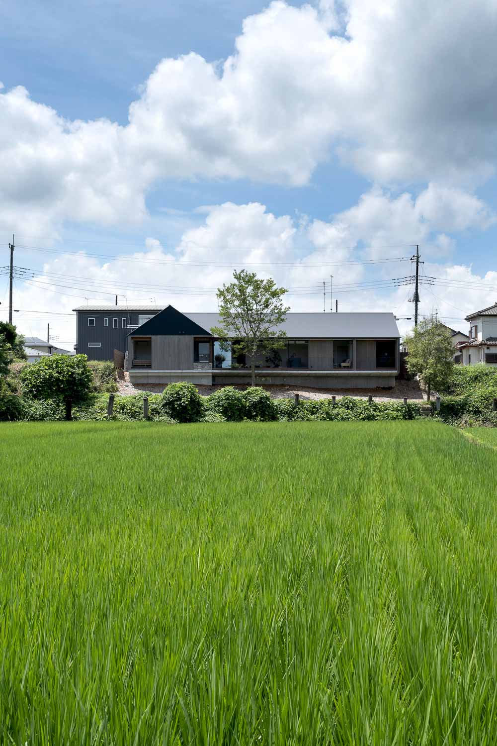 The exterior has a simple beauty that blends seamlessly into its natural surroundings. At the same time, its strength sets off the secondary nature (gardens) created by the resident, a landscape designer. The man-made stream running through the front garden plays an important role in linking the residential neighborhood with the surrounding natural environment of Tsukuba. Mt. Tsukuba towers beyond broad plains in this rice-growing region of Ibaraki Prefecture. The shape of the property dictated a simple floor plan with rooms arranged in a line parallel to the street, offering views of the landscape from anywhere in the house. Because part of the site was sloped, it would normally have been necessary to build a retaining wall to prepare the site for building. We took advantage of the situation by instead creating a floor that juts out from the foundation to “float” in midair. The elevated, open living space and balcony naturally draw the eye to the rice fields and forest visible in the distance, encouraging awareness of the changing natural world, connection to the broader universe, and one’s place as part of nature.