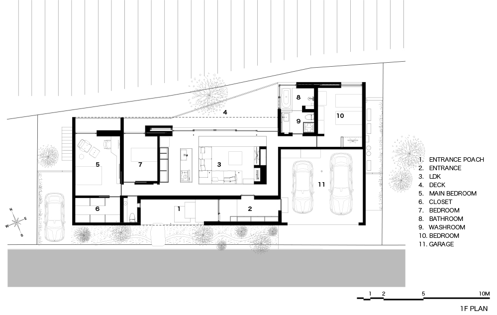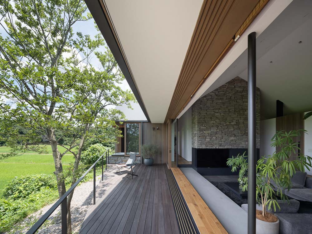 반면, 거실 바닥은 움푹 패여 있어 소파에 앉아 밖을 내다보면 자연 속으로 빠져드는 듯한 느낌을 받을 수 있다. 거실에서 계단 위쪽으로 한 층, 그리고 데크로 자연스럽게 이동하는 작은 변형은 전통적인 일본 주택의 서재 인테리어에서 베란다, 정원으로 이동할 때 모호한 경계를 모방하는 동시에, 자연과의 연결을 경험할 수 있는 다양한 상황을 만든다. 자연경관을 살리는 것 외에도, 데크 테라스 북쪽에 8m 높이의 팽나무를 심어 거실에서 밖을 내다볼 때의 깊이감을 더했다.