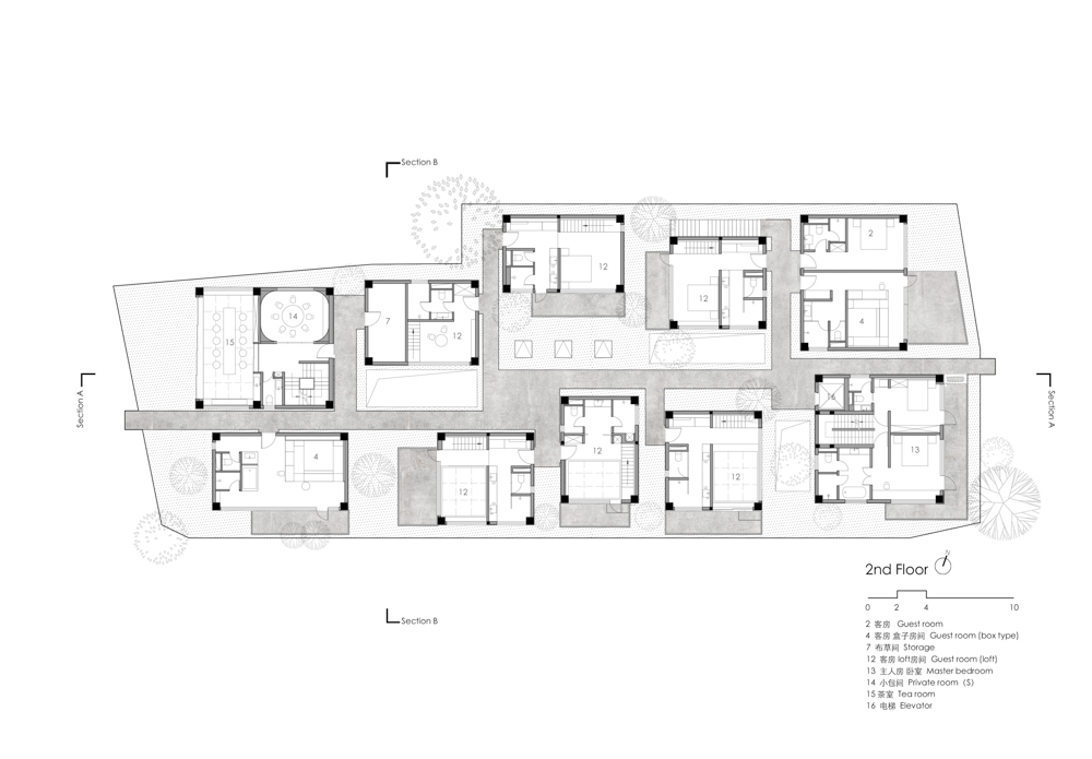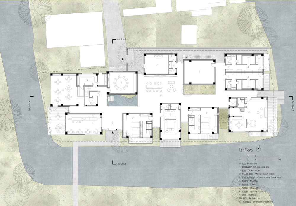 앞서 말했듯이 건축주를 위한 개인 거주공간도 포함되어 있는데, 이 공간은 수직적인 공간의 특성을 가진다. 1층에는 방들과 주요 기능 공간을 강변을 따라 엇갈린 형태로 배치해 각 객실마다 조망권과 필요한 프라이버시가 보장된다.2층의 공간이 더 개방적이고 자연스러워 보인다. 연속된 큰 지붕으로 나누어진 열 개의 흩어져 있는 상자는 멀리서 보면 작은 떠다니는 마을처럼 보인다. 1층의 정면은 대나무가 적층된 것이 특징인데, 이는 자연환경과 건축양식이 모두 잘 어우러지기 때문이다. 위층의 재질은 좀 더 순수한 분위기를 자아낸다. 이 층의 전체적인 공간은 담벼락을 위한 흰색 스터코와 무광택의 흰색 금속 지붕을 포함하여 전체적으로 소박함과 깔끔함을 보여주는 백색으로 꾸며져 있다.
