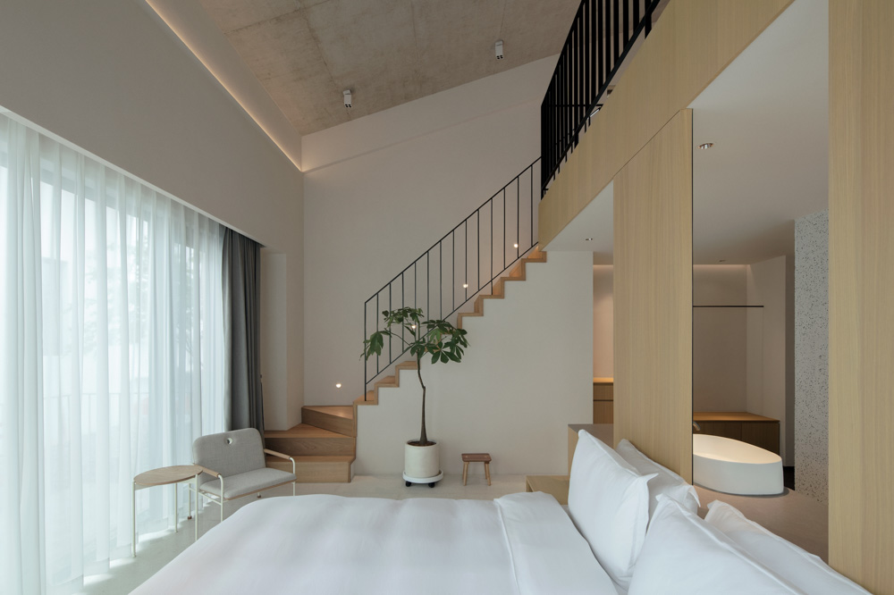 Meanwhile, these boxes also include private living space for the owner of the villa. Vertically, the architecture is divided into two layers by a continuous roof plane. On the first floor, guest rooms and main functional spaces are arranged in a  staggered form along the riverside to ensure that each room features a good view and necessary privacy. The space of the  second floor appears more open and natural. The ten scattered boxes divided by the continuous large roof look like a small floating village from a distance. The facade of the ground floor is featuredby laminated bamboo since the material integrate itself respectfully with the surroundings, both natural environment and built architecture. The upper floor’s materials present a more pure atmosphere. The overall space of this level is off-white as a whole, including the white stucco for wall and matte white metal roofing. The pure whiteness shows a sense of simplicity and neatness.