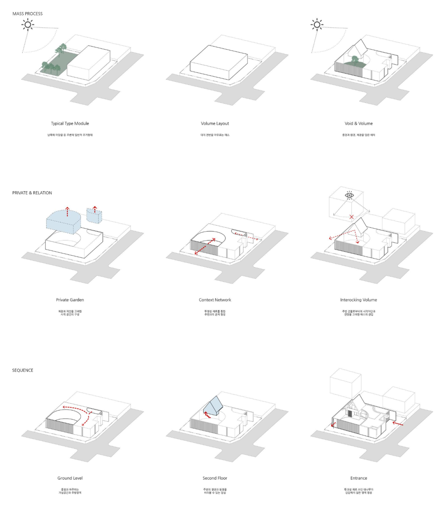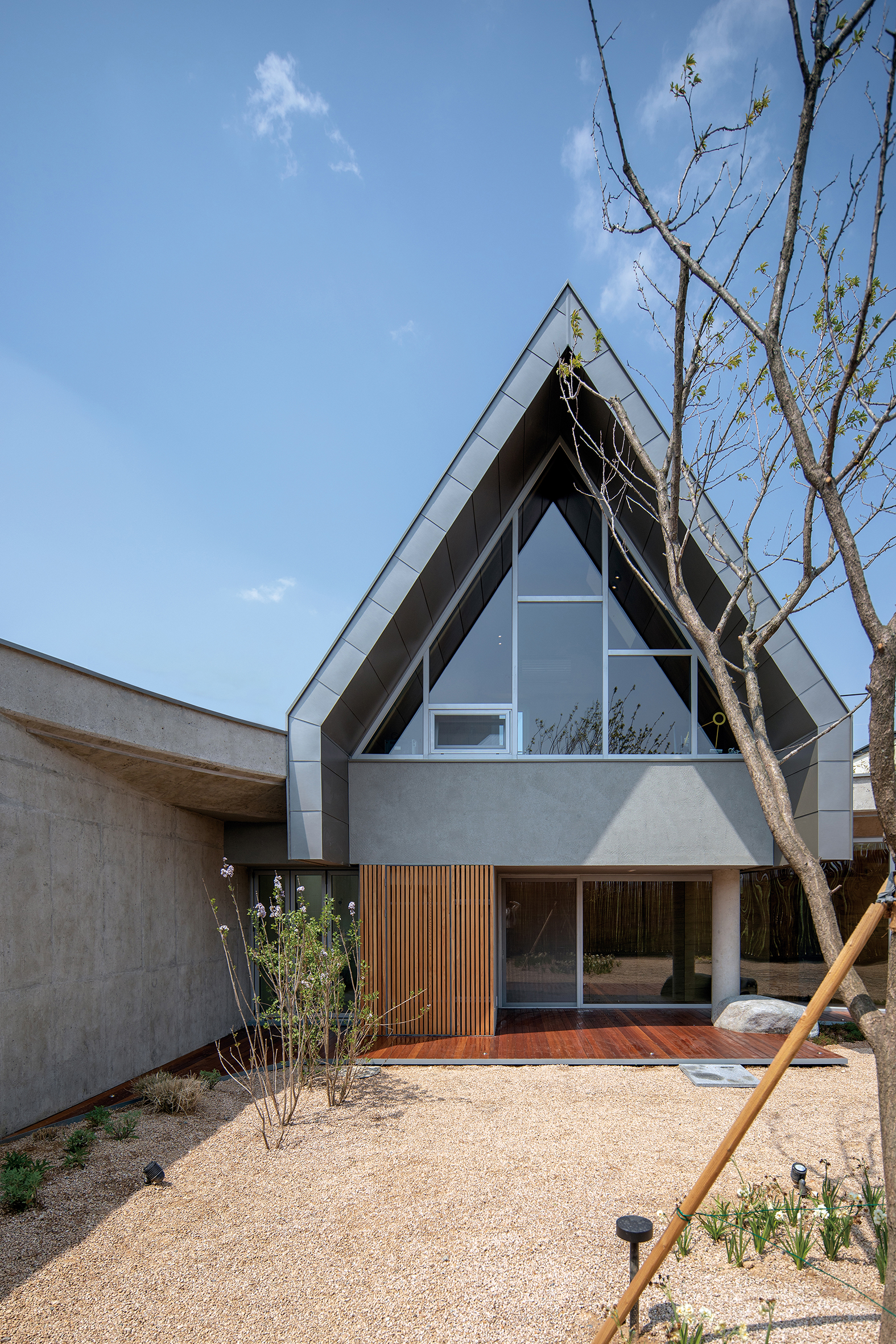 Surroundings of this house have different shape and spatial structure with ordinary rural house. Rather than place courtyard on the south and building on the north as normal, this house is surrounded with embracing wall and 60mm roasted bamboo transported from 'Damyang' around the boundary of entire site. Instead of keeping to the south facing, make whole interior space to embrace courtyard for getting homogeneous sunlight into the interior space. Furthermore, opened the 2nd floor view widely toward the gorgeous landscape. They can enjoy the exterior space with their family or guests through the internalized garden safely. On the other hand, it can be a passage communicating with village at times by opening the bamboo wall. The bamboo elevation by using accessible natural material from nearby area melts into surroundings smoothly and genially.