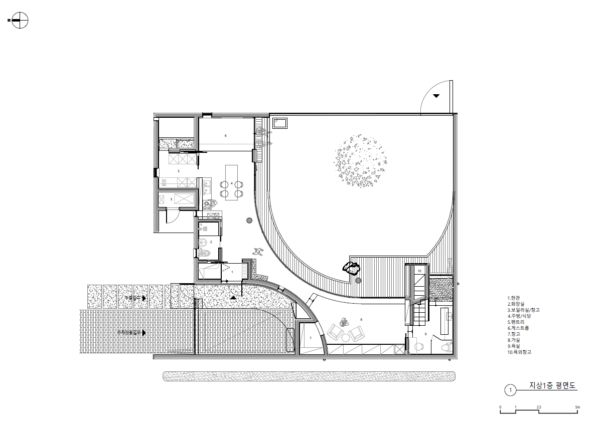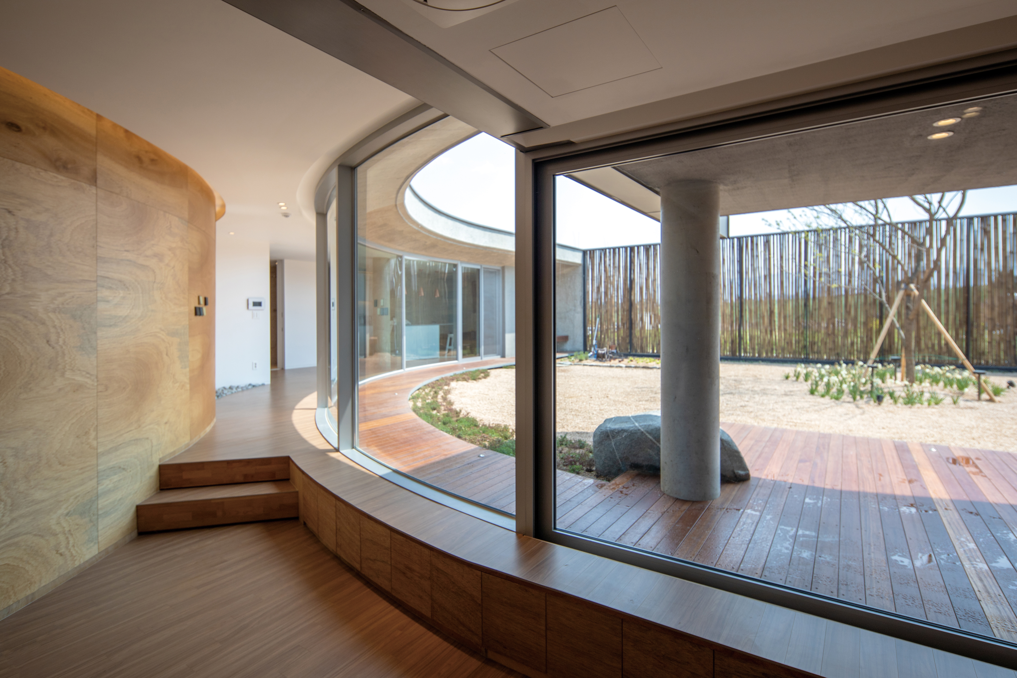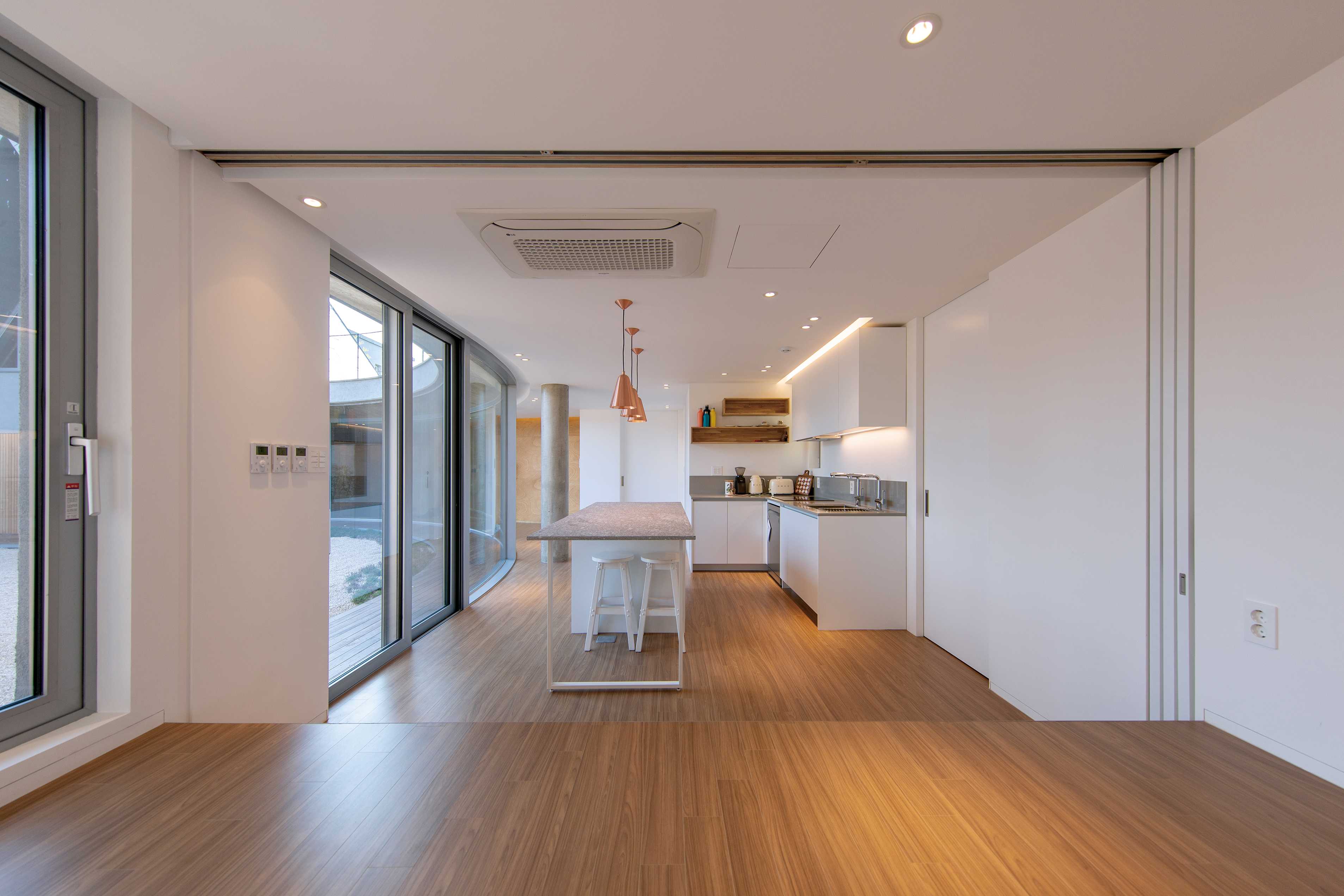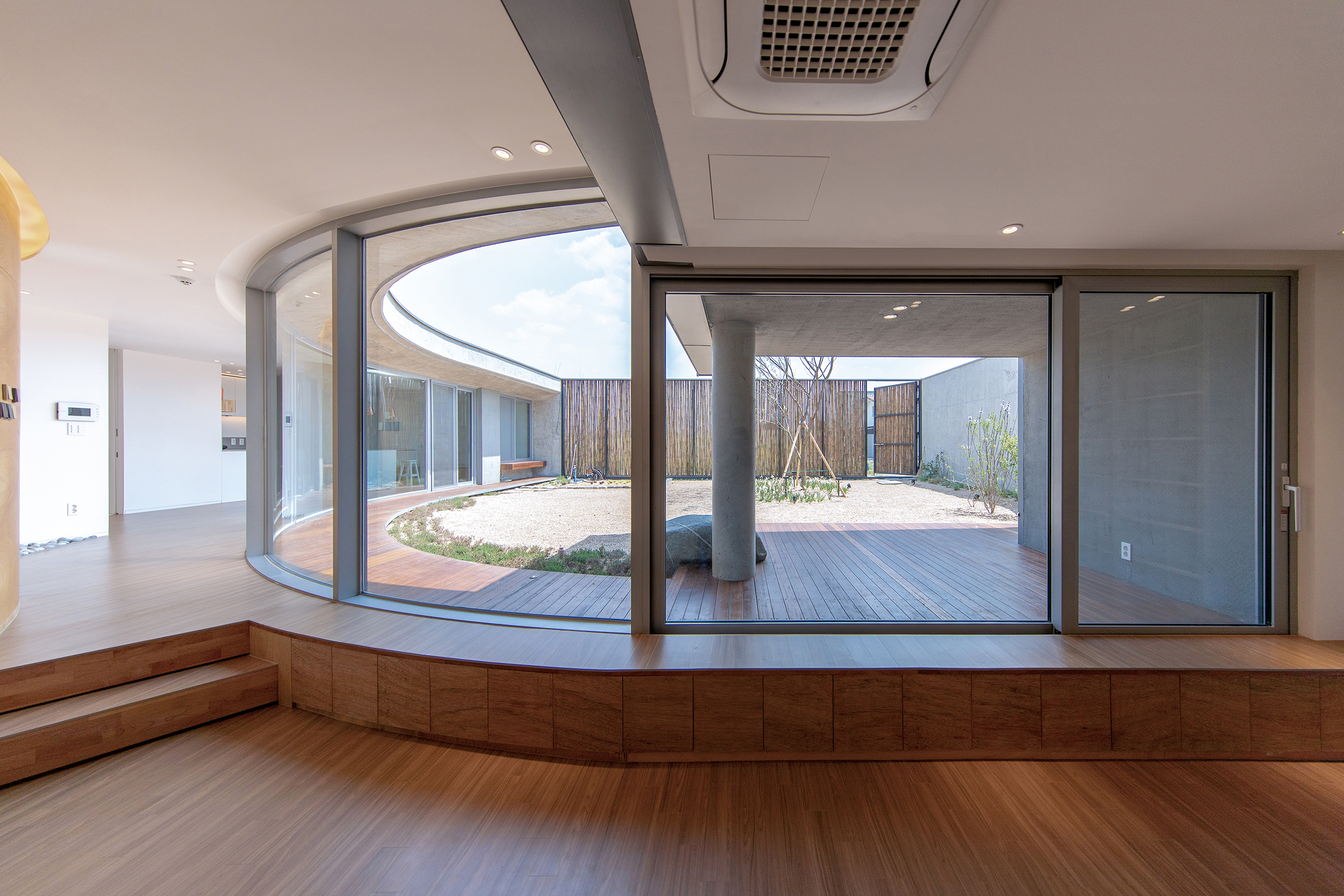 There is no space as room in this house. All of space on the 1st floor have organic form and structure, also they are opened toward the courtyard. The yard is a background which includes expanding all function of this house and a space which plays a centripetal part. Entire space connecting kitchen-enterance-livingroom is opening toward courtyard, thus all space are bright and warm also are interconnected compactly with courtyard visually and spatially. The eaves that is pensile over 1.2m~2m prevents summer sunlight entering deep inside and become a space provide relaxation from edge of the eaves. The apricot tree in the center of courtyard was selected by the client and architect by considering into whole space in the house.