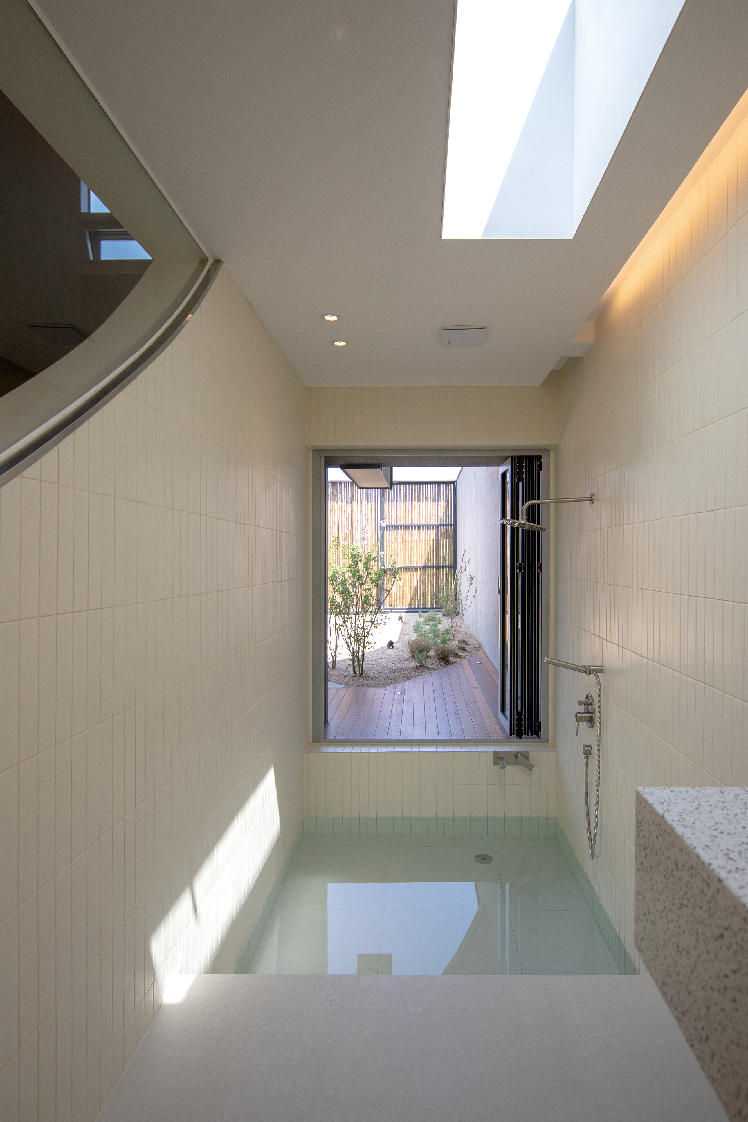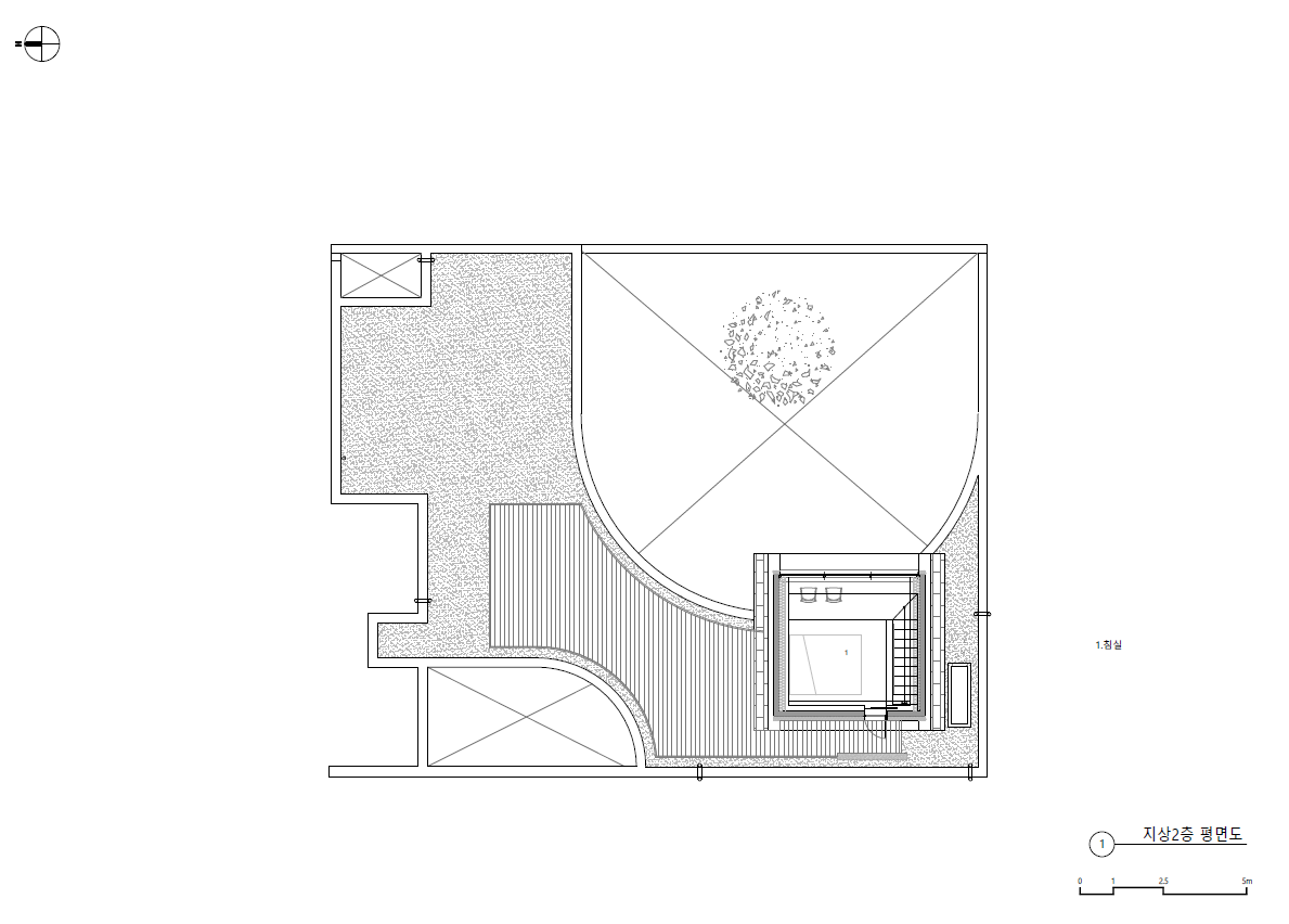 The 2nd floor is the most private bedroom. They can take a view the most beautiful scenery in this house also has different dimensional spatial impression than the 1st floor and provides visual expansion. if they sit on the bed has level difference, they can watch a distant view in their own space. The structure of the 2nd floor is a low gable roof form and they can feel like having a rest in a camping site which is cozy and scenic. The rooftop covered deck is connected through a hidden door behind the bedroom. The rooftop is the most open place in this house and it is possible to look surrounding beautiful scenery of the house. The deck is a place considering diverse utilizations.