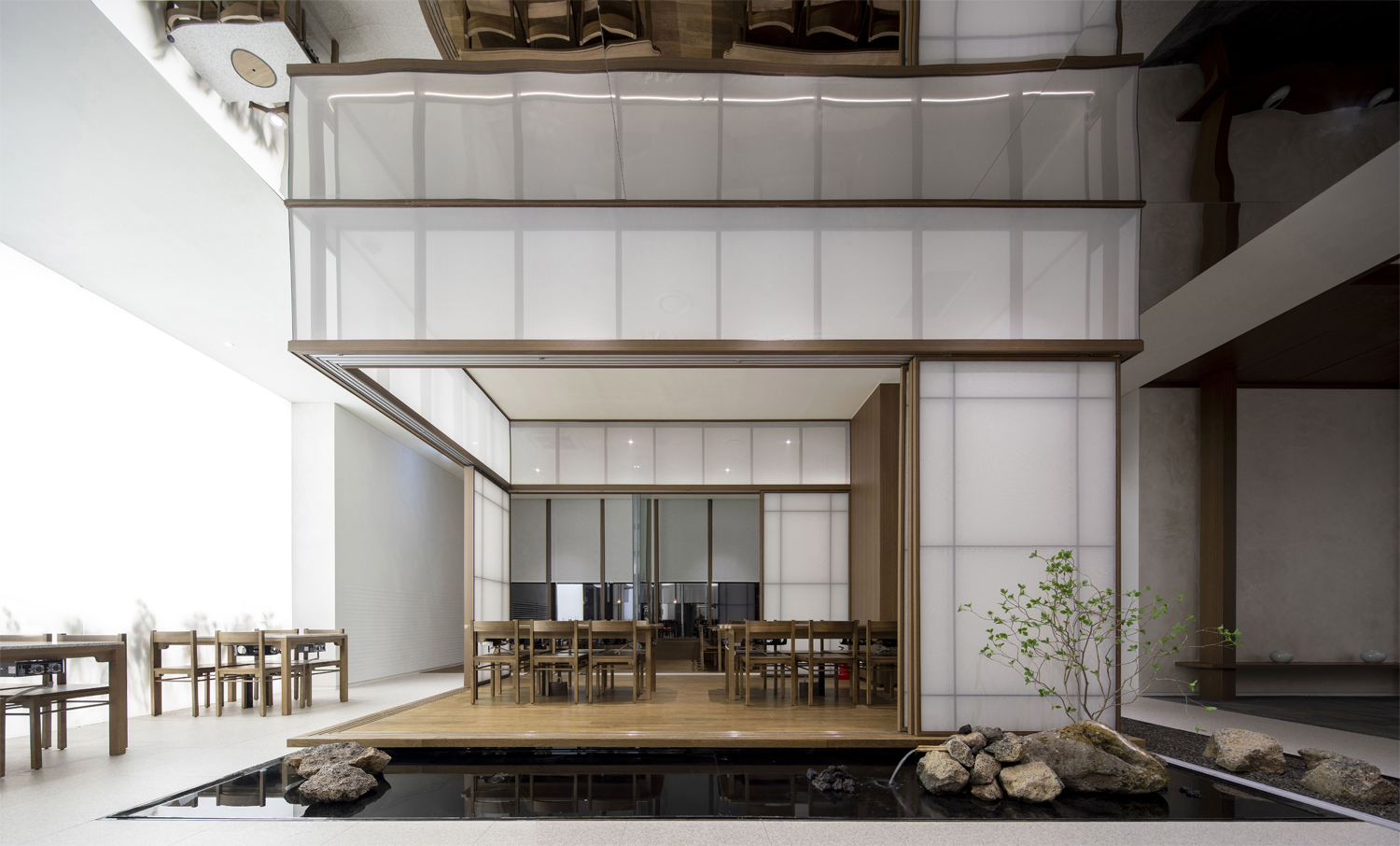 Instead of completely blocking space to space, for spaces that are functionally eye-catching, we protect the privacy by adopting the concept of our ink-and-wash painting which harbors emptiness and leisure, and we applied the concept of leisure or pale Indian ink on the rest of the spaces. The superpositioned landscape adds richness instead of cross-section and demonstrates a diverse and abundant sequence that looks different depending on the position.