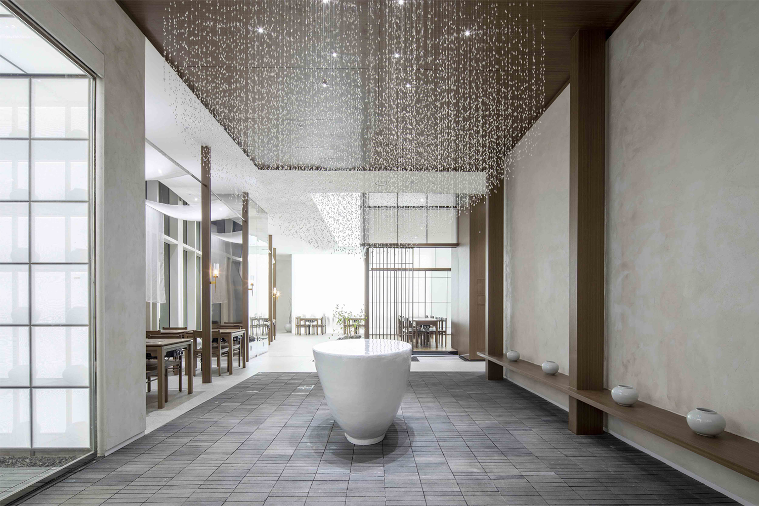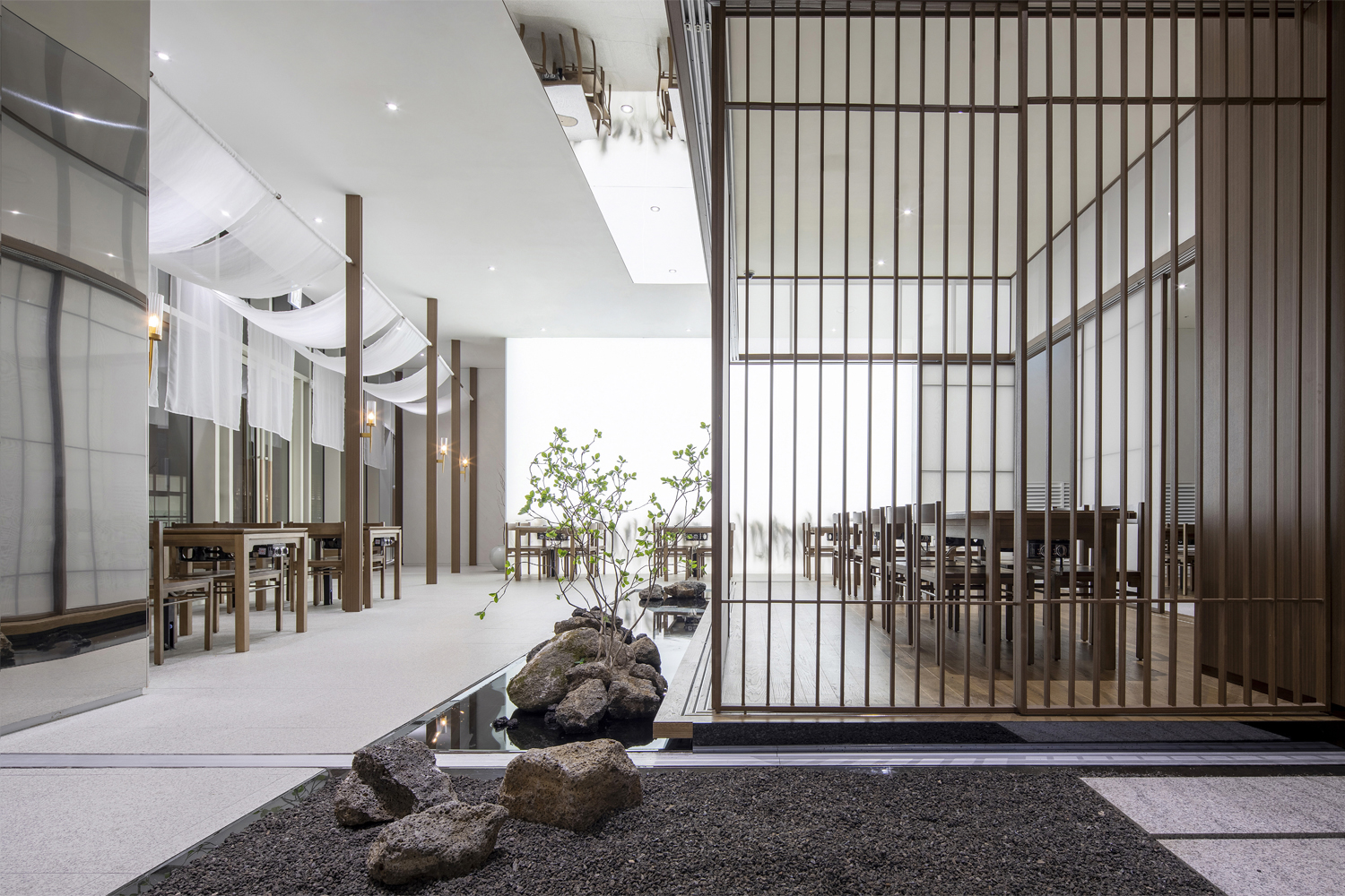 In this way, the “Korean Cuisine and Dining” is a place where the mind is at peace due to the presence of water and trees, light and shadow, ink-and-wash painting and white porcelain. We designed by embodying the concept of the white porcelain like how “existent” derives from “non-existent”, and the color “white” is not just a simple color but symbolizes “infinite possibility”, which is simple but valuable.