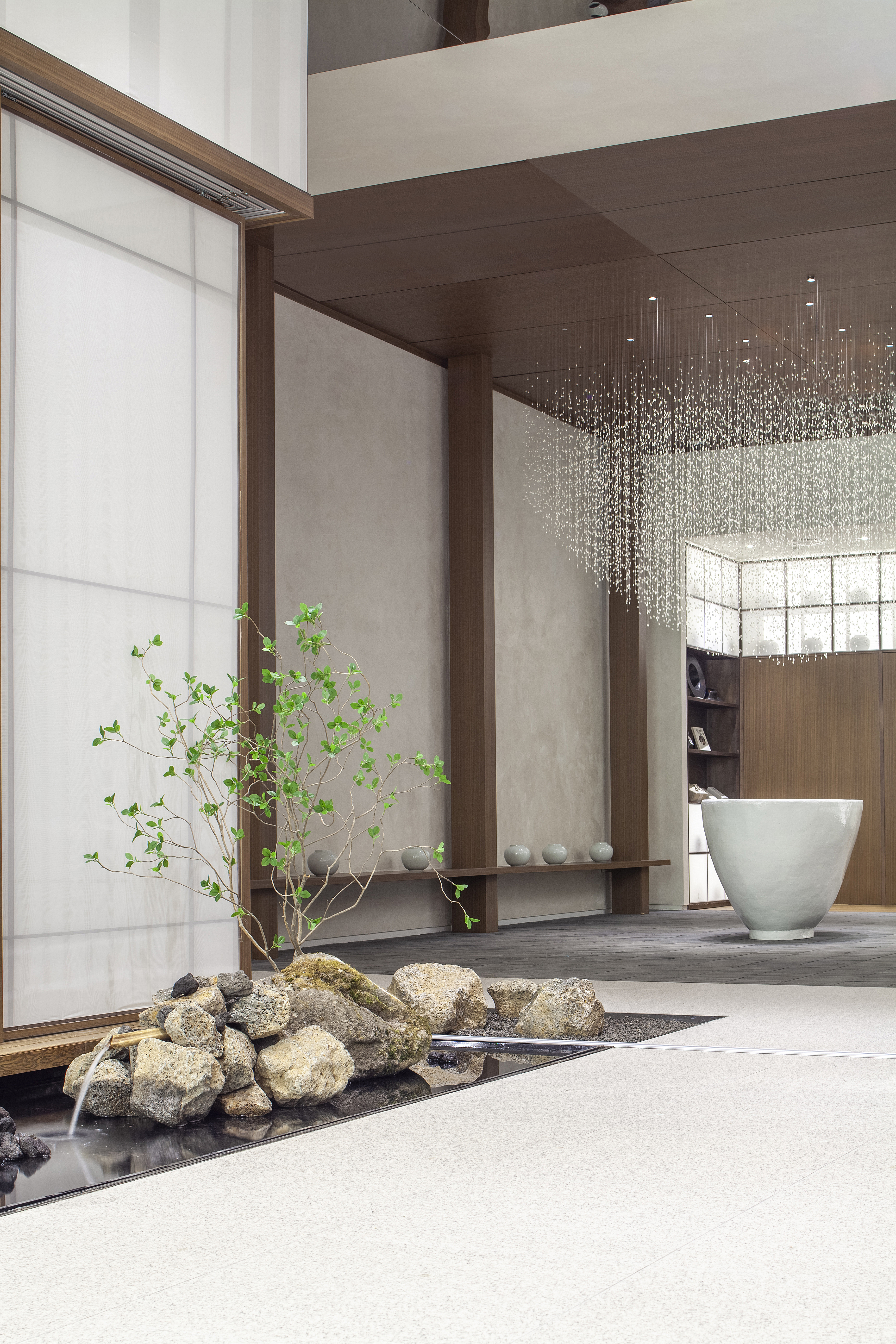 Instead of completely blocking space to space, for spaces that are functionally eye-catching, we protect the privacy by adopting the concept of our ink-and-wash painting which harbors emptiness and leisure, and we applied the concept of leisure or pale Indian ink on the rest of the spaces. The superpositioned landscape adds richness instead of cross-section and demonstrates a diverse and abundant sequence that looks different depending on the position.