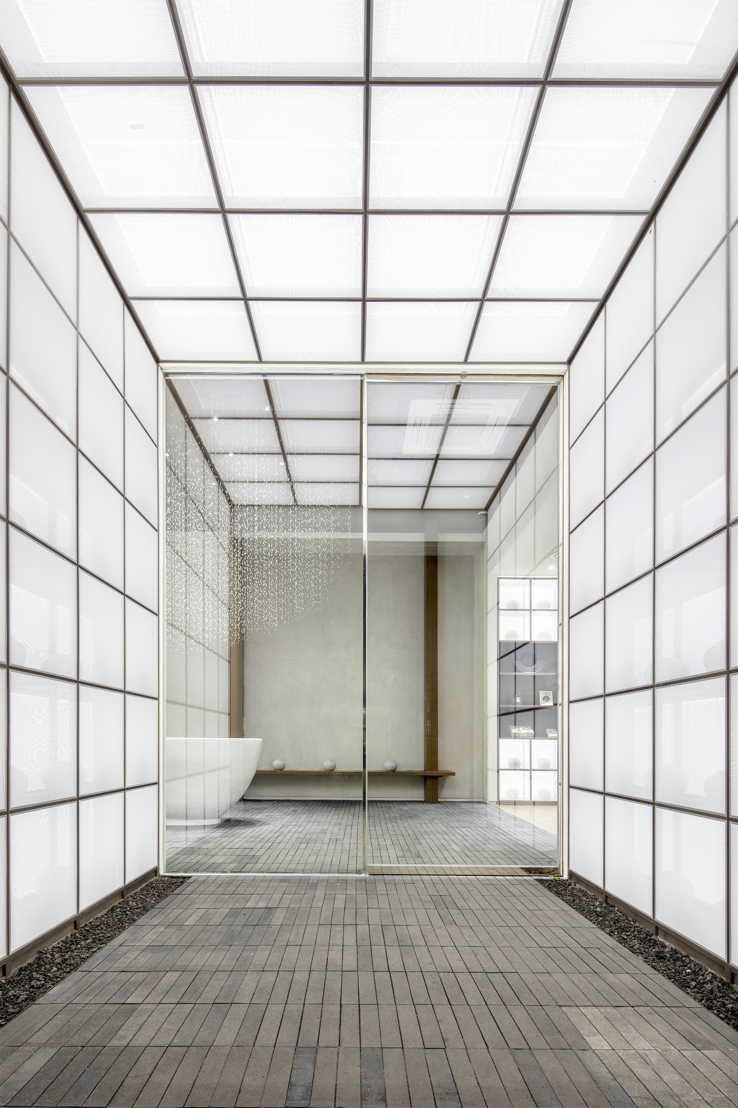 공간의 중심에는 물 위에 떠 있는 하나의 방이 존재한다. 방과 채의 개념을 담은 곳으로 마루의 역할을 띄는 후면의 공간, 전면의 수공간과 자연, 주변 환경(오브제)를 이어주는 역할을 한다. 이는 하나의 열린 공간을 상징하며 모호한 경계를 통해 공간의 중첩과 상호 관입이 이루어진다. 이 방은 내외부 공간을 명확히 구분 짓지 않는 한국 건축처럼 문이 벽이 되기도 하고, 문이 열리면 개방된 구조로 내외부의 공간이 관통하며 공간 구획이 아닌 전체의 일부가 되어 외부의 자연을 내부로 끌어들인다. 기능적으로는 낮에는 개방되어 누구나 이용할 수 있는 좌석으로 사용하고, 밤에는 프라이빗하게 예약제로 운영이 가능하다. 한옥의 방이 최소한의 공간이지만 다양한 행위를 했던 것처럼 기능적이고 경제적이며, 외부와 연결됨으로써 단순한 방의 기능을 탈피하고자 했다.