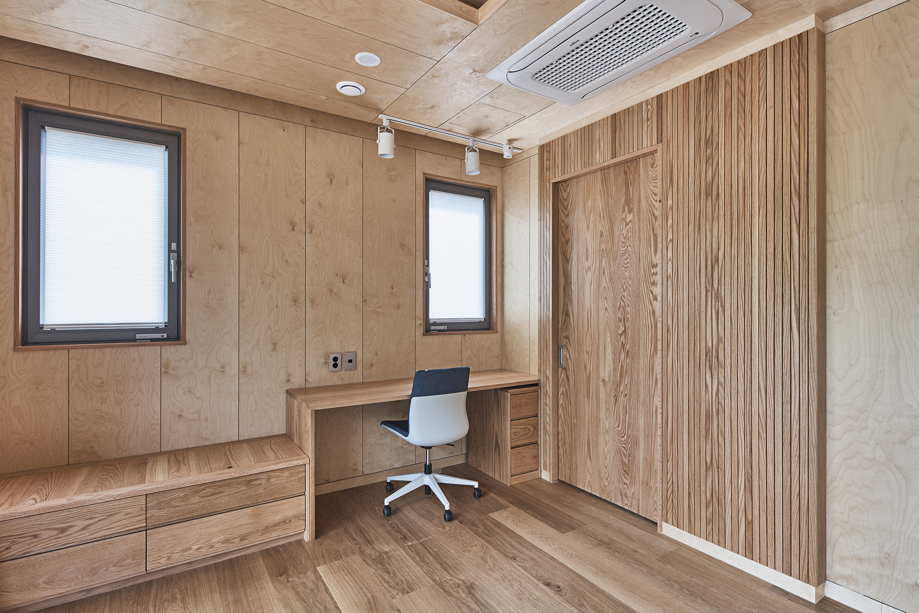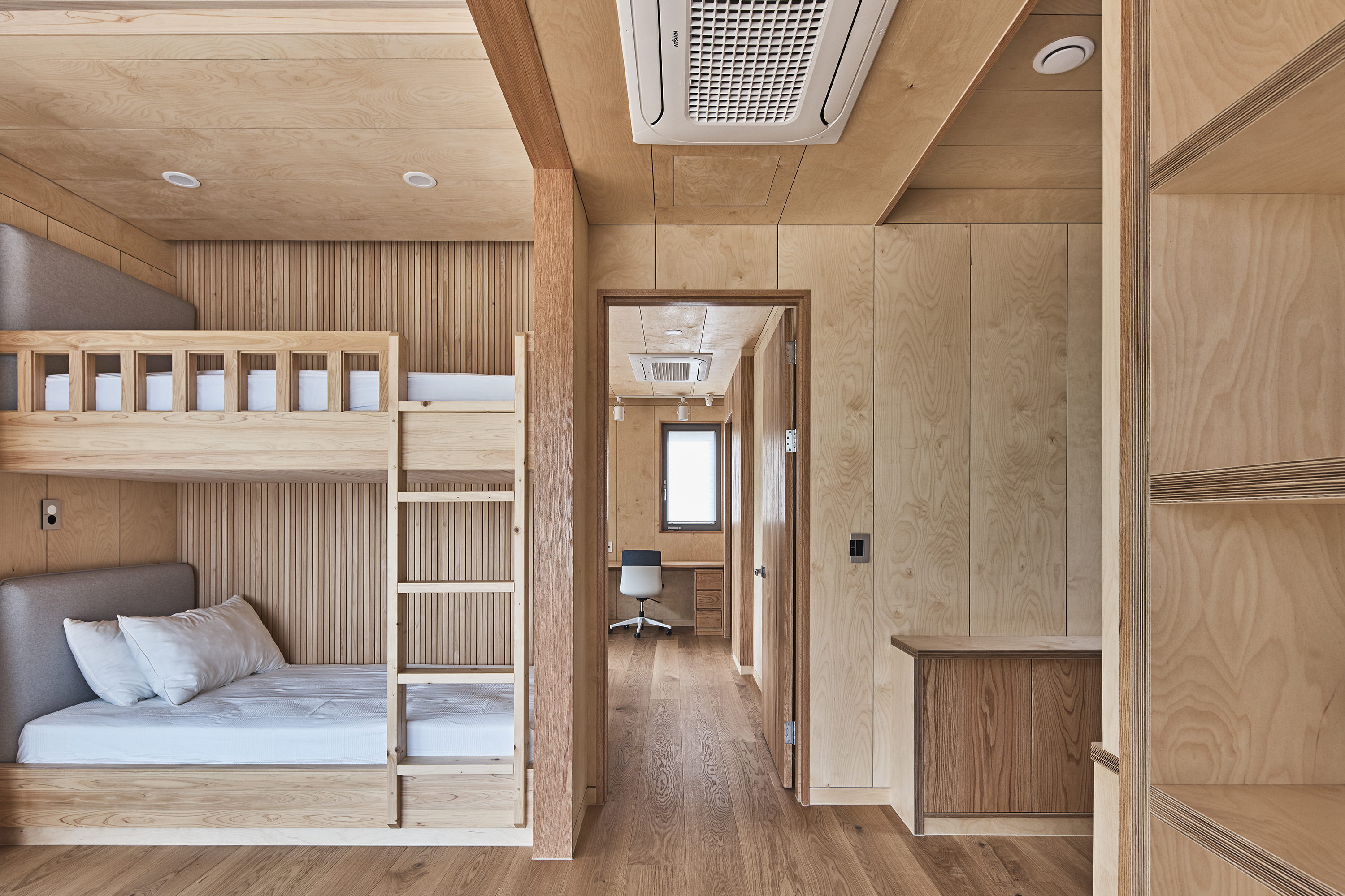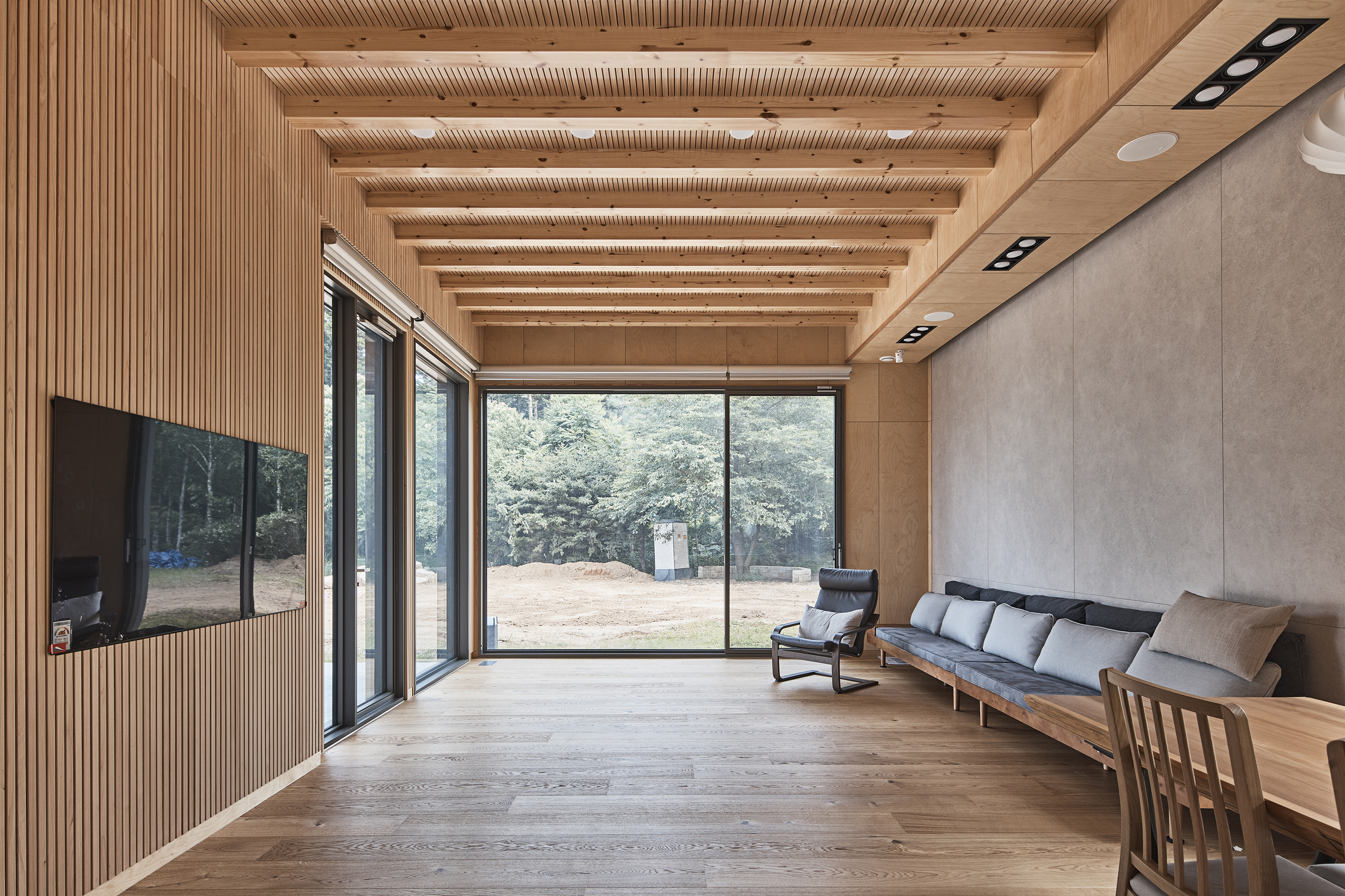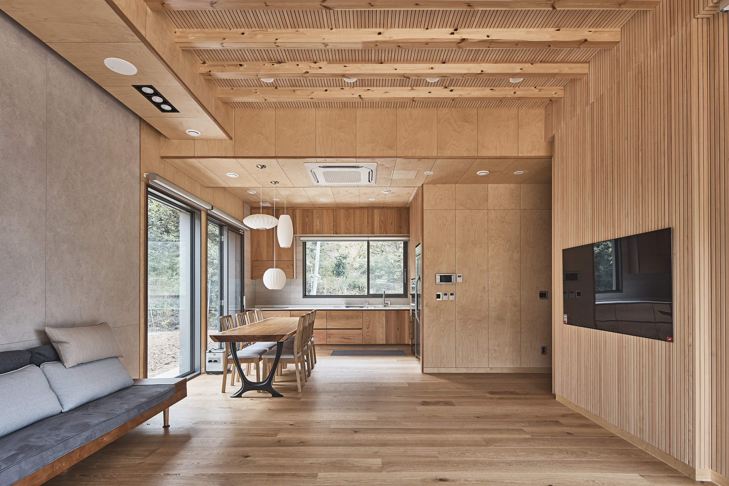 ‘SOOM ZIP’ has a heavy-weight timber structure and is a two-story weekend villa. The external form is a square wearing a pyramid hip roof that resembles the shape of a ‘breath’ and overall, the straight lines are stressed, and a form that is in harmony with the surrounding nature is shown with the rafters under the roof and exposed pillar. The boundary between the interior and the exterior was obscured by generally using eco-friendly wood for the interior, and the bathrooms were finished with cypress to maximize the scent. Various methods that allow the people, house and nature to breathe together were provided through SOOM ZIP to the client who wanted to live a life of nature away from the city life and noises.