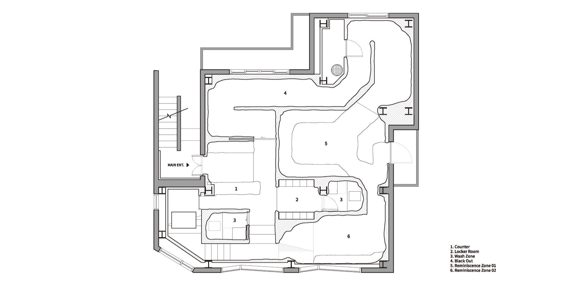 At the end of the first basement floor, you can feel the water flowing down from the first floor. When you go up to the first floor by following the stairs where the water flows, the temporal background changes from deep night to dawn, and the spatial background changes from the ground to a wetland. Dawn hides the light of the world and only reveals its black-and-white form. It was opened a little more visually than in the ground where nothing could be seen, but it is still more breath-taking. Although the front sight is still blurry, senses are gradually awakened by the sharp touch of the water. After stepping on the water path and mud that hints at the shore, you arrive at the shore where the mist rises. You gradually wake up at dawn as you realize yourself anew in a stillness that moves slowly.