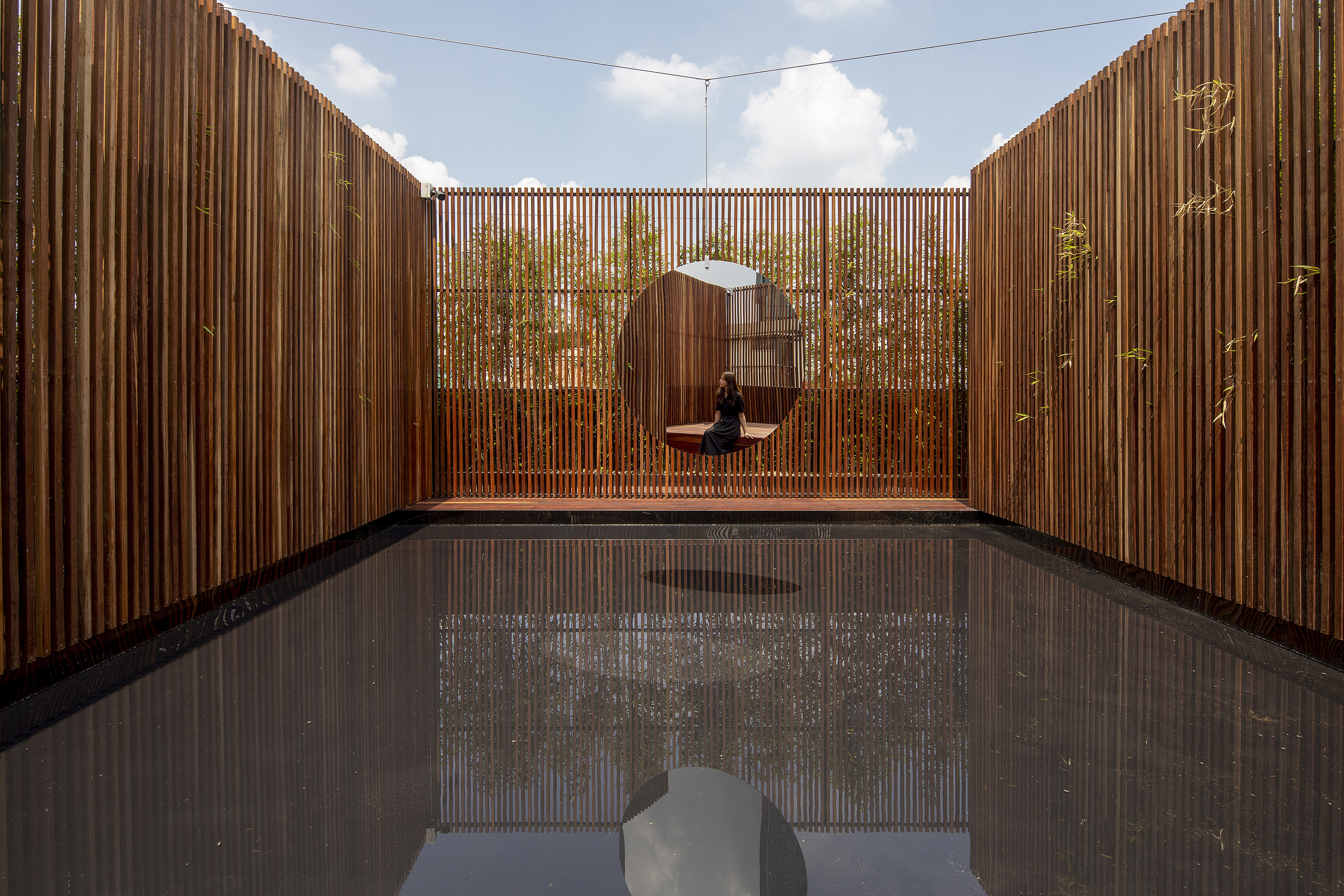 The rooftop is a space to expand the forest of Sumsei and finish the journey. The sky is infinitely high above your head, and in the sky, there is a mirror swaying in the wind. Below, a square, straight head contains the objects of the sky and wind. The mirror is a mirror of the self that is finally faced again, and is the period of a long journey. Our body repeats to go in and out of nature due to the swaying mirror. The length and color of light that changes every moment, the expression of water that captures the sky, and you can even feel the sound of the wind moving through the bamboo and its canes.