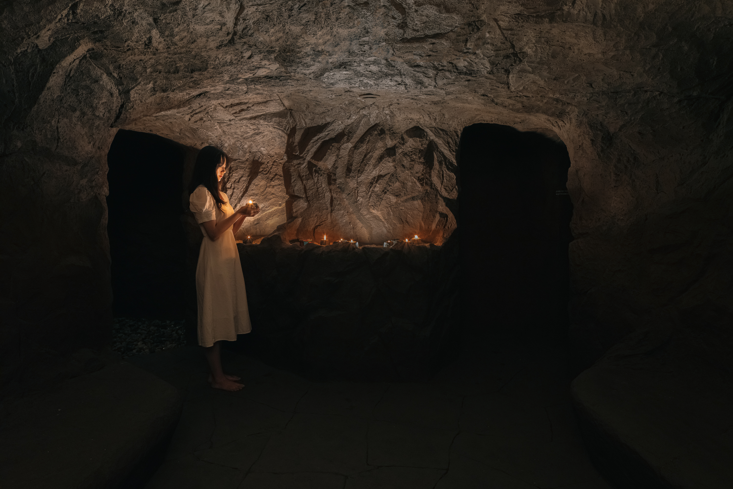 지하로 내려오면 마주하게 되는 지하 1층의 공간은 깊은 땅 속이자, 깊은 밤이다. 안내에 따라, 관람객은 모두 신발을 벗고 맨발로 섬세이의 공간에 들어가게 된다. 앞이 보이지 않는 긴 통로를 촛불에 의지해 손끝, 발끝의 감각에 의존하여 통과한다. 밀려오는 막연한 두려움은 뒤로한 채 한걸음을 내딛는 용기가 필요하다. 이때 발끝은 총 세 가지의 서로 다른 감각을 전달하는데, 발에 닿는 땅의 감촉이 새삼스럽게 느껴진다. 나아가, 발의 감각이 달라짐에 따라 귀에 맺히는 소리의 조각이 달라지는 것 또한 경험 할 수 있다. 통로의 끝에는 통로를 지나는 동안 의지했던 초를 내려놓고 촛불을 보며 잠시 자신의 감각을 정리하는 시간을 가질 수 있는 명상의 공간이 있다. 일렁이는 촛불은 흐릿했던 형상들을 어루만지고 관람객은 점차 어렴풋했던 자신의 감각이 분명해 지는 것을 느낄 수 있다. 명상공간을 지나면 공간적, 시간적 배경을 극대화한 땅속 공간이 나온다. 건물의 보이드 공간을 활용해 어두운 땅속에서 밤하늘이 열리는 틈을 만들었다.
