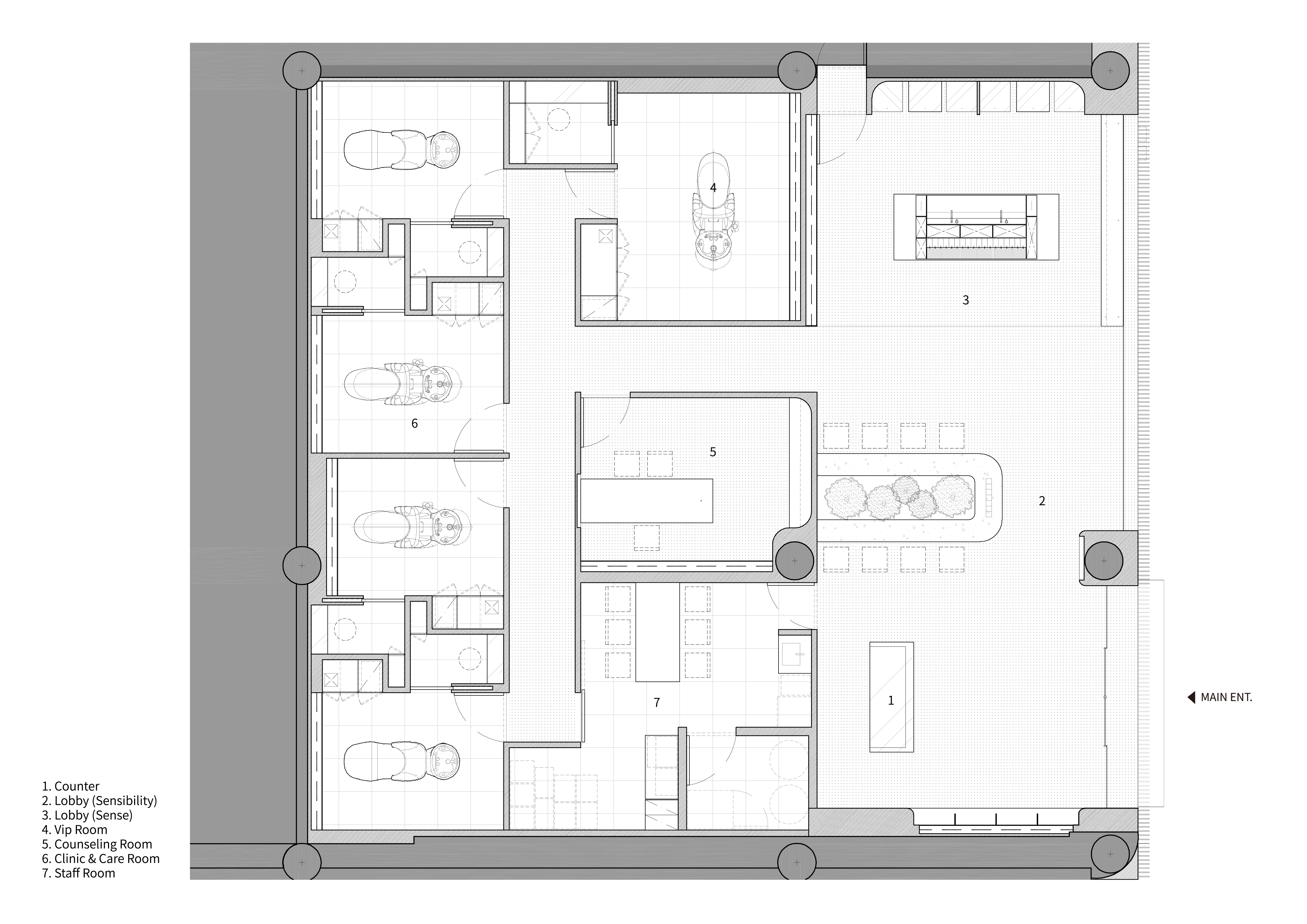 The reception was divided into a space of reason and emotion in accordance with the flow of the user and assigned a suitable role. The therapy bar that welcomes customers gives them tea that suits the user's condition so that they can see the color, smell the scent, taste it, stimulate the five senses before the clinic, and restore their body and mind. This is a gesture of hospitality to stabilize the mind beyond just the purpose of treatment.