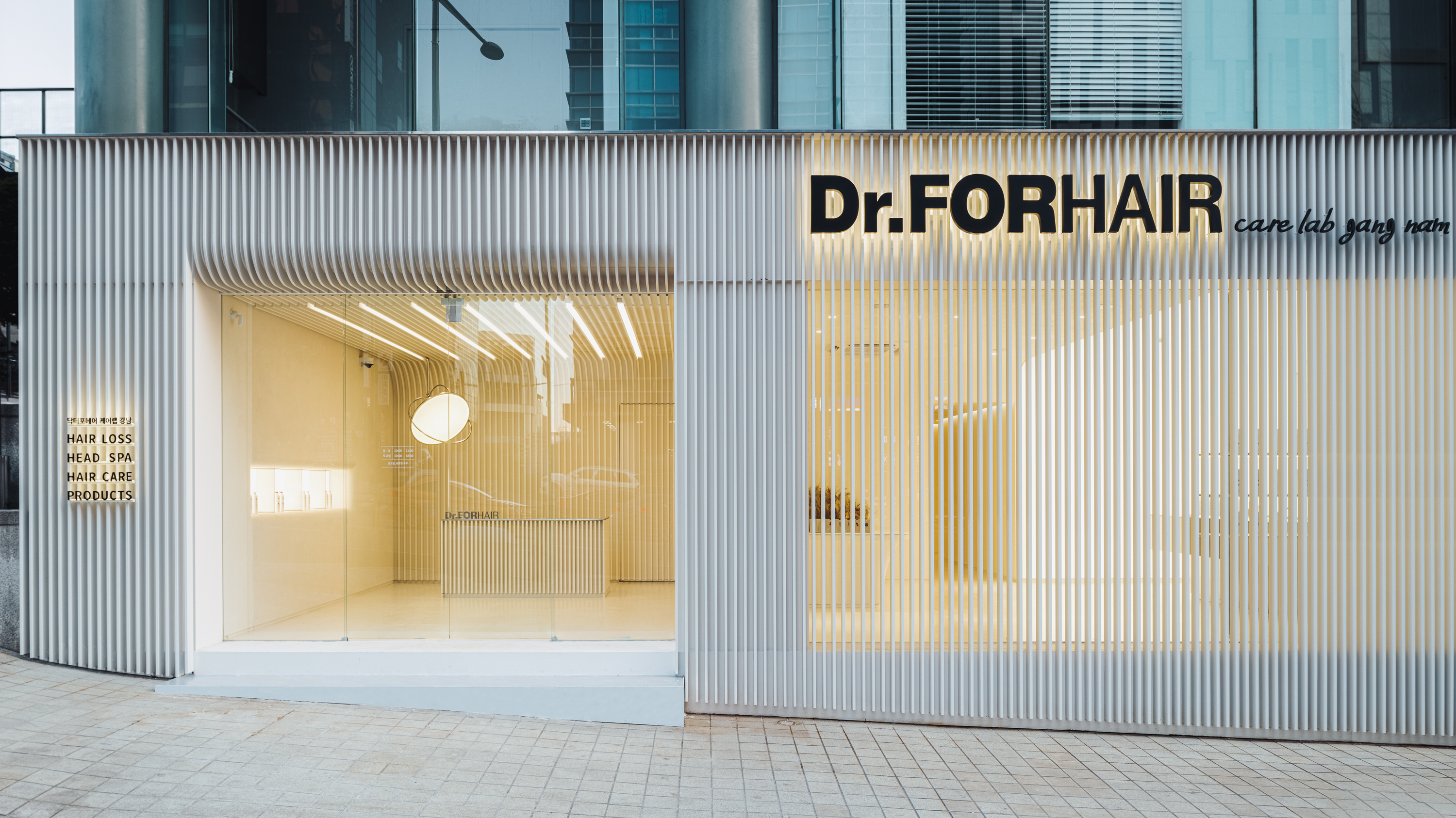 The site is located along the boulevard where many people and vehicles pass. Using the brand's identity, Hair, it gently wrapped the facade with numerous lines. The line of intuitive and clear reason that can be shown in a thin and long straight line and the line of emotion made up of subtle light leaking from the inside overlap to keep the eyes on.