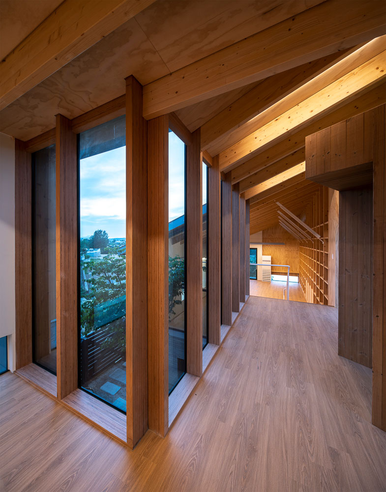 Beams, columns, and window frames were made using structure lamination wood (GLUELAM), and the roof and interlayer slabs were constructed with hand-manufactured SIP (an economical old-fashioned method to incorporate both insulation and structure at the same time by bonding structural plywood to both sides with EPS insulation material in between).