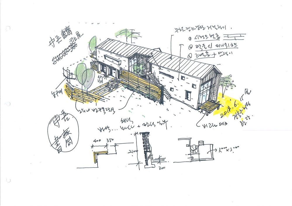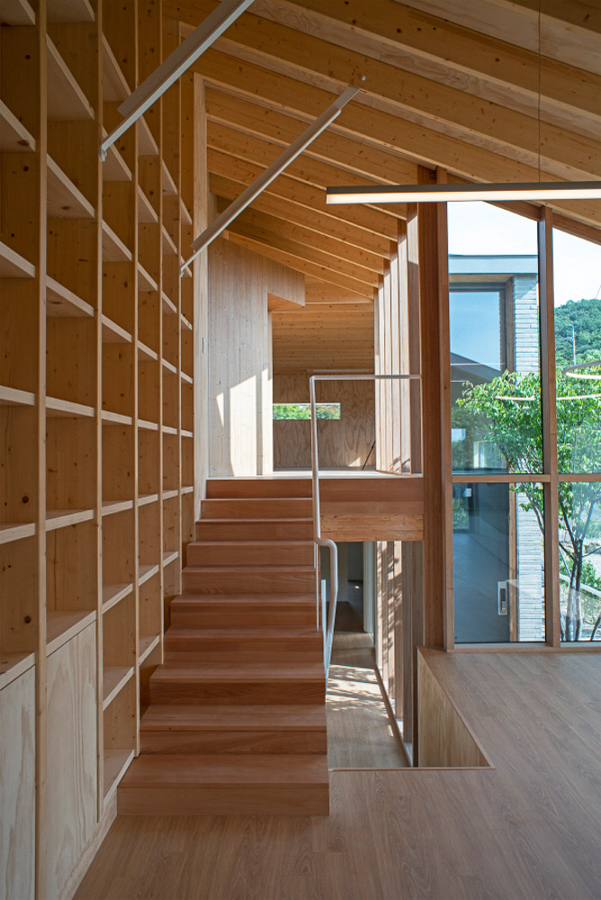Suobooks, named after Yakhyeon Jeong’s house, Suojae, is a book-making company. Books are made of paper, and paper and trees have the same genes. Therefore, the structure of this building is made of spruce, and the interior finish is made of wood of the same color and texture.